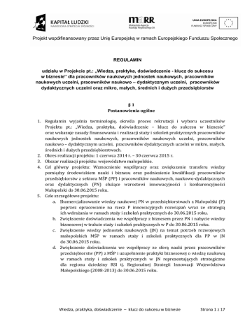 REGULAMIN udziału w Projekcie pt.: „Wiedza, praktyka, doświadczenie - klucz do sukcesu w biznesie” dla pracowników naukowych jednostek naukowych, pracowników naukowych uczelni, pracowników naukowo – dydaktycznym uczelni, pracowników dydaktycznych uczelni oraz mikro, małych, średnich i dużych przedsiębiorstw §1 Postanowienia ogólne 1. Regulamin wyjaśnia terminologię, określa proces rekrutacji i wyboru uczestników Projektu pt.: „Wiedza, praktyka, doświadczenie – klucz do sukcesu w biznesie” oraz wskazuje zasady finansowania i realizacji staży i szkoleń praktycznych pracowników naukowych jednostek naukowych, pracowników naukowych uczelni, pracowników naukowo – dydaktycznym uczelni, pracowników dydaktycznych uczelni w mikro, małych, średnich i dużych przedsiębiorstwach. 2. Okres realizacji projektu: 1 czerwca 2014 r. – 30 czerwca 2015 r. 3. Obszar realizacji projektu: województwo małopolskie. 4. Cel główny projektu: Wzmocnienie współpracy oraz zwiększenie transferu wiedzy pomiędzy środowiskiem nauki i biznesu oraz podniesienie kwalifikacji pracowników przedsiębiorstw z sektora MŚP (PP) i pracowników naukowych, naukowo-dydaktycznych oraz dydaktycznych (PN) służące wzrostowi innowacyjności i konkurencyjności Małopolski do 30.06.2015 roku. 5. Cele szczegółowe projektu: a. Skomercjalizowanie wiedzy naukowej PN w przedsiębiorstwach z Małopolski (P) poprzez opracowanie na rzecz P innowacyjnych rozwiązań wraz ze strategią ich wdrażania w ramach staży i szkoleń praktycznych do 30.06.2015 roku. b. Zwiększenie doświadczenia we współpracy z biznesem przez PN i nabycie wiedzy biznesowej w trakcie staży i szkoleń praktycznych w P do 30.06.2015 roku. c. Zwiększenie wiedzy jednostek naukowych (JN) na temat potrzeb rozwojowych małopolskich MŚP w ramach staży i szkoleń praktycznych dla PP w JN do 30.06.2015 roku. d. Zwiększenie doświadczenia we współpracy ze sferą nauki przez pracowników przedsiębiorstw (PP) z MŚP i uzupełnienie praktyki biznesowej o wiedzę naukową w ramach staży i szkoleń praktycznych w JN reprezentujących strategiczne dla regionu dziedziny RSI tj. Regionalnej Strategii Innowacji Województwa Małopolskiego (2008-2013) do 30.06.2015 roku. Wiedza, praktyka, doświadczenie – klucz do sukcesu w biznesie Strona 1 z 17 §2 Definicje Ilekroć Regulamin używa pojęcia: 1. Projekt – oznacza to projekt pt.: „Wiedza, praktyka, doświadczenie – klucz do sukcesu w biznesie” realizowany przez Małopolską Agencję Rozwoju Regionalnego S.A., finansowany w ramach Programu Operacyjnego Kapitał Ludzki Priorytet VIII Regionalne kadry gospodarki, Działanie 8.2. Transfer wiedzy, Poddziałanie 8.2.1 Wsparcie dla współpracy sfery nauki i przedsiębiorstw, współfinansowany przez Unię Europejską w ramach Europejskiego Funduszu Społecznego na podstawie umowy o dofinansowanie projektu w ramach Programu Operacyjnego Kapitał Ludzki zawartej w dniu 3 lipca 2014 roku pomiędzy Małopolską Agencję Rozwoju Regionalnego S.A. a Województwem Małopolskim - Wojewódzkim Urzędem Pracy w Krakowie. 2. WIP Doświadczenie – oznacza to projekt pt.: „Wiedza, praktyka, doświadczenie – klucz do sukcesu w biznesie”. 3. Realizator projektu – oznacza to Małopolską Agencję Rozwoju Regionalnego S.A. (MARR S.A.) z siedzibą w Krakowie przy ul. Kordylewskiego 11, 31-542 Kraków, odpowiedzialną za rekrutację pracowników naukowych jednostek naukowych, pracowników naukowych uczelni, pracowników naukowo – dydaktycznym uczelni, pracowników dydaktycznych uczelni oraz mikro, małych, średnich i dużych przedsiębiorstwach, organizację i rozliczanie staży i szkoleń praktycznych dla pracowników naukowych jednostek naukowych, pracowników naukowych uczelni, pracowników naukowo – dydaktycznym uczelni, pracowników dydaktycznych uczelni w przedsiębiorstwach. 4. RSI – oznacza to dokument pt.: Regionalna Strategia Innowacji Województwa Małopolskiego na lata 2008 - 2013. 5. Jednostka naukowa - podmiot, o którym mowa w art. 2 pkt 9 ustawy z dnia 30 kwietnia 2010 r. o zasadach finansowania nauki (Dz. U. Nr 96, poz. 615). 6. Pracownik naukowy jednostki naukowej – osoba zatrudniona w jednostce naukowej1 na stanowisku: − profesora zwyczajnego; − profesora nadzwyczajnego; − profesora wizytującego; − adiunkta; − asystenta. 7. Pracownik naukowy i naukowo – dydaktyczny2 uczelni – osoba zatrudniona w uczelni na stanowisku: − profesora zwyczajnego; − profesora nadzwyczajnego; − profesora wizytującego; 1 Zgodnie z rozumieniem ustawy z dnia 30 kwietnia 2010 r. o zasadach finansowania nauki (Dz. U. z 2010 r. Nr 96 poz. 615 z pózn. zm.) 2 Zgodnie z rozumieniem ustawy z dnia 27 lipca 2005 r. o szkolnictwie wyższym (Dz. U. 2012 poz. 572). Wiedza, praktyka, doświadczenie – klucz do sukcesu w biznesie Strona 2 z 17 − adiunkta; − asystenta. 8. Pracownik dydaktyczny3 – osoba zatrudniona na stanowisku: − starszego wykładowcy; − wykładowcy; − lektora lub instruktora. W uczelni zawodowej pracownicy dydaktyczni mogą być zatrudniani także na − stanowiskach: − profesora zwyczajnego; − profesora nadzwyczajnego; − profesora wizytującego; − asystenta. 9. Kandydat do projektu – to: a) pracownik nauki (PN) – pracownik naukowy jednostki naukowej, pracownik naukowy uczelni, pracownik naukowo – dydaktyczny uczelni, pracownik dydaktyczny uczelni zatrudniony odpowiednio przez jednostkę naukową lub uczelnię na podstawie umowy o pracę, który zarejestrował się uzupełniając elektroniczny formularz zgłoszeniowy dla PN i złożył wymagane dokumenty rekrutacyjne, oraz który jest zainteresowany wzmocnieniem współpracy i zwiększeniem transferu wiedzy pomiędzy środowiskiem nauki i biznesu, podniesieniem kwalifikacji zawodowych i zdobyciem nowych kompetencji oraz zwiększeniem doświadczenia we współpracy z biznesem wraz z nabyciem wiedzy biznesowej, jak również sko