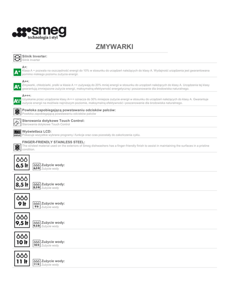 ZMYWARKI Silnik Inverter: Silnik Inverter A+: Klasa A + pozwala na oszczędność energii do 10% w stosunku do urządzeń należących do klasy A. Wydajność urządzenia jest gwarantowana pomimo niskiego poziomu zużycia energii. A++: Zmywarki, chłodziarki, pralki w klasie A ++ zużywają do 20% mniej energii w stosunku do urządzeń należących do klasy A. Urządzenia tej klasy gwarantują zmniejszone zużycie energii, maksymalną efektywność energetyczną i poszanowanie dla środowiska naturalnego. A+++: Uzyskanie przez urządzenie klasy A+++ oznacza do 30% mniejsze zużycie energii w stosunku do urządzeń należących do klasy A. Gwarantuje zużycie energii na możliwie najniższym poziomie, maksymalną efektywność i poszanowanie dla środowiska naturalnego. Powłoka zapobiegającą powstawaniu odcisków palców: Powłoka zapobiegającą powstawaniu odcisków palców Sterowania dotykowe Touch Control: Sterowania dotykowe Touch Control Wyświetlacz LCD: Pokazuje wszystkie wybrane programy i funkcje oraz czas pozostały do zakończenia cyklu. FINGER-FRIENDLY STAINLESS STEEL: The st/steel material used on the exteriors of Smeg dishwashers has a finger-friendly finish to assist in maintaining the surfaces in a pristine condition. Zużycie wody: Zużycie wody Zużycie wody: Zużycie wody Zużycie wody: Zużycie wody Zużycie wody: Zużycie wody Zużycie wody: Zużycie wody Zużycie wody: Zużycie wody MAKSYMALNY ZAŁADUNEK: Załadunek od 7 do 14 kompletów w zależności od modelu. MAKSYMALNY ZAŁADUNEK: Załadunek od 7 do 14 kompletów w zależności od modelu. MAKSYMALNY ZAŁADUNEK: Załadunek od 7 do 14 kompletów w zależności od modelu. MAKSYMALNY ZAŁADUNEK: Załadunek od 7 do 14 kompletów w zależności od modelu. Otwieranie drzwi push-to-open: Otwieranie drzwi push-to-open Namaczanie: Namaczanie ECO: ECO Standardowy 65°C: Standardowy 65°C Szybki standardowy: Szybki standardowy PROGRAM DELIKATNY: Program do delikatnych i lekko zabrudzonych naczyń. Szybki delikatny: Szybki delikatny Codzienny 1/2 załadunku 65°C: Codzienny 1/2 załadunku 65°C Auto 45°-65°C: Auto 45°-65°C PROGRAM AUTO 60 °C: Do zmywania bardzo brudnych naczyń o różnej strukturze, w temperaturze 60 °C Ultraclean 70°C: Ultraclean 70°C OPÓŹNIONY START: Opóźniony start do 24h. Naczynia, które oczekują na włączenie się zmywarki są automatycznie namaczane. Poziom hałasu: Poziom hałasu Poziom hałasu: Poziom hałasu Poziom hałasu: Poziom hałasu Poziom hałasu: Poziom hałasu Poziom hałasu: Poziom hałasu Poziom hałasu: Poziom hałasu Poziom hałasu: Poziom hałasu Acquastop - częściowe zabezpieczenie: Acquastop - częściowe zabezpieczenie OPCJE PROFESJONALNE: Opcja Professional daje możliwość przekształcenia urządzenia w półprofesjonalne ze względu na programy które znacząco redukują czas zmywania. FlexiDuo - szuflada na sztućce: FlexiDuo - szuflada na sztućce Rompigoccia - wkładki dolnego kosza optymalizujące suszenie: Rompigoccia - wkładki dolnego kosza optymalizujące suszenie Super 70°C: Super 70°C Mocny i szybki: Mocny i szybki EasyGlide - system prowadnic górnego kosza: EasyGlide - system prowadnic górnego kosza Eco-szybki: Eco-szybki Szybki 16min: Program przeznaczony jest do zmywania silnie zabrudzonych naczyń z zaschniętymi pozostałościami jedzenia w bardzo krótkim czasie. IntensivoProf: Program intensywny, przeznaczony jest do zmywania garnków i patelnie mocno zabrudzonych z zaschniętymi pozostałościami jedzenia , które wymagają mocnego czyszczenia. Party: Program dedykowane do mycia szklanek. UniversaleProf: Program uniwersalny , przeznaczony jest do zmywania normalnie zabrudzonych zastaw stołowych. DualWater - możliwość podłączenia ciepłej wody (max 60°C): DualWater - możliwość podłączenia ciepłej wody (max 60°C) Enersave - funkcja oszczędzania energii: Enersave - funkcja oszczędzania energii FlexiTabs - funkcja efektywnego użycia tabletek: FlexiTabs - funkcja efektywnego użycia tabletek Szkło 45°C: Szkło 45°C QuickTime - funkcja skrócenia czasu zmywania: QuickTime - funkcja skrócenia czasu zmywania Szybki 27 min: Szybki 27 min OPCJA HYCLEAN: Opcja, którą można dodać do wszystkich cykli powyżej 50° C: ostatnie płukanie odbywa się z temperaturą 70 ° C. Idealny program do mycia np. butelek dla dzieci. FlexiZone - 1/2 załadunku: FlexiZone - 1/2 załadunku Acquastop - pełne zabezpieczenie: Acquastop - pełne zabezpieczenie System zamachowego zmywania: System zamachowego zmywania System orbitalnego zmywania: System orbitalnego zmywania ActiveLight - wskazanie pracy urządzenia na podłodze: ActiveLight - wskazanie pracy urządzenia na podłodze Aquatest - czujnik zabrudzenia wody: Aquatest - czujnik zabrudzenia wody Auto 60°-70°C: Auto 60°-70°C System planetarnego zmywania: System planetarnego zmywania Zawiasy FlexiFit: Zawiasy FlexiFit ExtraGlide - system prowadnic górnego kosza: ExtraGlide - system prowadnic górnego kosza Smeg Polska Sp. z o.o. ul. Cybernetyki 9 02-677 Warszawa Tel. +48 22 276 14 00