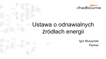 Ustawa o odnawialnych źródłach energii Igor Muszyński Partner Zakres • Wykonywanie działalności gospodarczej w zakresie odnawialnych źródeł energii. • System wsparcia dla OZE. • Tworzenie krajowego planu działania w zakresie OZE. • Współpraca międzynarodowa w zakresie OZE. • Kary pieniężne za naruszenie ustawy OZE. 2 Podział rynku OZE • Mikroinstalacje – moc elektryczna do 40kW przyłączone do sieci o napięciu poniżej 110kV. • Instalacje OZE do 0,5MW. • Pozostałe instalacje OZE. 3 Mikroinstalacje • Sprzedawca zobowiązany ma obowiązek kupić energię elektryczną z mikroinstalacji: • o mocy do 3kW po cenie 0,75 zł/kWh. Cena obowiązuje do momentu, gdy łączna moc tych instalacji OZE przekroczy 300MW, lub zmiany ceny przez Ministra Gospodarki; • o mocy powyżej 3kW do 10kW po cenie 0,65 zł/kWh. Cena obowiązuje do chwili, gdy łączna moc ww. instalacji OZE przekroczy 500MW lub zmiany ceny przez Ministra Gospodarki. 4 System wsparcia • Zachowanie systemu wsparcia opartego na świadectwach pochodzenia oraz obowiązku zakupu energii z OZE po określonej cenie. • Nowy system wsparcia polegający na gwarancji pokrycia deficytu między ceną określoną w aukcji a ceną gwarantowaną. • Źródła do 0,5MW mocy będą objęte obowiązkiem zakupu energii elektrycznej po cenie zaoferowanej w aukcji. 5 Stary system wsparcia - zmiany • Okres wsparcia ograniczony do 15 lat licząc od dnia wyprodukowania pierwszej energii elektrycznej w instalacji OZE potwierdzonego wydanym świadectwem pochodzenia. • Niektóre źródła wyłączone z systemu wsparcia (wodne pow. 5MW, niektóre współspalanie) lub ograniczone (współspalanie). • Zwiększony od 2017r poziom obowiązku przedstawiania do umorzenia świadectw pochodzenia . • Zamrożony poziom wartości opłaty zastępczej (303,03 zł/MWh). • Obowiązkowy zakup energii będzie wykonywał sprzedawca zobowiązany a nie sprzedawca z urzędu. 6 Stary system wsparcia - zmiany • Sprzedawca zobowiązany ma obowiązek kupić energię z instalacji OZE, pod warunkiem zaoferowania całej wytworzonej i wprowadzonej do systemu energii elektrycznej w okresie co najmniej 90 następujących po sobie dni kalendarzowych. • Cena zakupu z instalacji OZE o mocy mniejszej niż 500kW nie zawiera opłaty za bilansowanie handlowe. • od 2017r obowiązek umorzenia świadectw pochodzenia wynosi 20% wielkości sprzedaży odbiorcom końcowym. 7 Ulgi w obowiązku umorzenia świadectw • Odbiorcy przemysłowi (odpowiednie PKD), który w poprzednim roku kalendarzowym zużył nie mniej niż 100GWh lub będący członkiem giełdy towarowej lub rynku regulowanego może sam realizować obowiązek przedstawiania umarzania świadectw pochodzenia w zakresie transakcji na giełdzie i tych rynkach regulowanych oraz będący członkiem giełdowej izby rozrachunkowej przy giełdzie towarowej jeżeli mają współczynnik intensywności zużycia energii elektrycznej nie mniejszy niż 3%. • Współczynnik intensywności zużycia to stosunek kosztów energii elektrycznej zużytej na własne potrzeby do wartości dodanej brutto 8 Ulgi w obowiązku umorzenia świadectw • Wymagane oświadczenie złożone URE o: • rodzaju PKD, • ilości energii zużytej na własne potrzeby w poprzednim roku kalendarzowym, • wartości współczynnika intensywności zużycia energii, • ilości energii objętej obowiązkiem umorzenia świadectw, • załączona opinia biegłego rewidenta o poprawności wyliczenia współczynnika intensywności. 9 Ulgi w obowiązku umorzenia świadectw • Prezes URE ogłasza wykaz odbiorców przemysłowych, którzy złożyli oświadczenie. • Ulgi – obowiązek wykonuje się gdy współczynnik intensywności wynosi: • nie mnie niż 3% a nie więcej niż 20% - dla 80% energii, • więcej niż 20% a nie więcej niż 40% - dla 60% energii • więcej niż 40% - dla 15% energii zakupionej. 10 Ulgi w obowiązku umorzenia świadectw • Oświadczenie składa się do 30 listopada poprzedzającego rok realizacji obowiązku – art. 188 ustawy OZE – w 2015r składało się do 18 kwietnia 2015r. • Do 31 sierpnia roku następującego po roku realizacji obowiązku składa się informację o ilości zakupionej energii, spełnianiu warunków do ulgi oraz wykonaniu obowiązku wraz z oświadczeniem, że to prawda. 11 Aukcje - co licytujemy? • Prawo do wytwarzania energii elektrycznej w instalacji OZE oraz otrzymania wsparcia w drodze: • podpisania umowy na sprzedaż energii elektrycznej ze sprzedawcą zobowiązanym po cenie i na ilość z oferty z aukcji - dla instalacji OZE o mocy mniejszej niż 500kW albo • prawo do pokrycia ujemnego salda – różnicy między wartością ceny sprzedaży energii liczonej jako średnia dzienna cena dla rynku DN z TGE a ceną z oferty złożonej w aukcji dla mocy instalacji OZE 500kW lub większej. 12 O co licytujemy? • Rada Ministrów do 31 października każdego roku wydaje rozporządzenie określające maksymalną ilość i wartość energii elektrycznej z OZE, w tym maksymalną ilość energii elektrycznej, która może być wytworzona w instalacji OZE o stopniu wykorzystania mocy zainstalowanej mniejszym niż 4000MWh/MW/rok, która może być wytworzona, do sprzedania (alokowania) w drodze aukcji w następnym roku kalendarzowym. 13 Aukcje • Organizuje Prezes URE nie rzadziej niż raz w roku osobno dla instalacji OZE o mocy nie większej niż 1MW i osobno dla większej niż 1MW. • Minister Gospodarki do 30 listopada każdego roku określa ilość i wartość energii elektrycznej, jaka powinna zostać sprzedana w nowych instalacjach OZE (oddanych po zamknięciu aukcji) o mocy nie większej niż 1MW. 14 Udział w aukcji • Instalacja OZE istniejąca w dniu wejścia w życie rozdziału 4 ustawy lub zmodernizowana po tej dacie – lub mikroinstalacja - składa się deklarację o przystąpieniu do aukcji. • Instalacje OZE nie istniejące w dniu wejścia w życie rozdz
