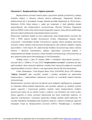 Ćwiczenie 2 . Bezpieczeństwo i higiena żywności Bezpieczeństwo żywności stanowi jeden z priorytetów polityki żywieniowej i zajmuje centralne miejsce w obszarze ochrony zdrowia publicznego. Organizacja Narodów Zjednoczonych już w początkach swojego istnienia powołała Organizację ds. Wyżywienia i Rolnictwa (FAO), której jednym z zadań jest wspieranie w skali globalnej działań poprawiających stan bezpieczeństwa żywnościowego. Również Światowa Organizacja Zdrowia (WHO) wśród wielu realizowanych programów poprawy stanu zdrowia publicznego aktywnie wspiera podnoszenie stanu bezpieczeństwa żywności. Płaszczyznę wspólnych działań na rzecz podnoszenia stanu bezpieczeństwa żywności dla FAO i WHO stanowi Kodeks Żywnościowy (Codex Alimentarius). Poprzez zbiór wytycznych i rekomendacji Kodeks Żywnościowy reguluje obszar produkcji pierwotnej żywności, nadzór sanitarny nad procesami produkcyjnymi, stan sanitarny zakładów, higienę pracowników i wiele innych. Do zadań Komisji Kodeksu Żywnościowego należy ochrona zdrowia i interesów konsumentów, poprzez zapewnienie uczciwych praktyk w międzynarodowym handlu żywnością. Normy Kodeksu Żywnościowego wykorzystywane są przy opracowywaniu prawa obowiązującego w Unii Europejskiej. Według ustawy z dnia 25 sierpnia 2006r o warunkach zdrowotnych żywności i żywienia (Dz.U z 2006r.nr 171 poz.1225) "bezpieczeństwo żywności" rozumiane jest jako ogół warunków, które muszą być spełnione i działań, które muszą być podjęte na wszystkich etapach produkcji żywności i obrotu w celu zapewnienia zdrowia lub życia konsumenta. Codex Alimentarius , Food Hygiene Basic Texts, FAO/WHO, Rzym 1997 definiuje “higienę żywności” jako wszystkie warunki i pomiary niezbędne do zapewnienia bezpieczeństwa i odpowiednich właściwości żywności na wszystkich etapach łańcucha żywnościowego. Bezpieczeństwo żywności zapewnia się głównie przez podejście zapobiegawcze, polegające na wdrażaniu dobrej praktyki higienicznej oraz procedur opartych na zasadach systemu analizy zagrożeń i krytycznych punktów kontroli. Istota bezpieczeństwa środków spożywczych opiera się na analizie ryzyka, a jednym z jej elementów jest ocena ryzyka. Ocena zagrożeń ze strony żywności dokonywana jest przez środowisko naukowe, co zapewnia wszechstronne i niezależne stanowisko, budując zaufanie opinii publicznej. Na szczeblu Wspólnoty Europejskiej takie doradztwo naukowe i naukowo-techniczne zapewnia Europejski Urząd ds. Bezpieczeństwa Żywności (EFSA). Współpracując z ośrodkami You created this PDF from an application that is not licensed to print to novaPDF printer (http://www.novapdf.com) naukowymi państw członkowskich, EFSA jest punktem referencyjnym dla całej Wspólnoty Europejskiej. W Polsce od 1 maja 2004 r. system prawa żywnościowego opiera się o regulacje Unii Europejskiej – dyrektywy i rozporządzenia. Podstawowym krajowym aktem prawnym z obszaru żywności jest ustawa z 25 sierpnia 2006 r. o bezpieczeństwie żywności i żywienia. Określa ona wymagania zdrowotne żywności, wymagania dotyczące przestrzegania zasad higieny oraz reguluje zagadnienia urzędowej kontroli żywności. Zapewnienie bezpieczeństwa zdrowotnego żywności związane jest w wdrażaniem systemów zarządzania bezpieczeństwem zdrowotnym żywności jakimi są m.in. zasady Dobrej Praktyki Higienicznej – GHP, Dobrej Praktyki Produkcyjnej – GMP oraz system HACCP. Jest to wymóg prawa określony m.in. w : Ustawie z dnia 25 sierpnia 2006 o bezpieczeństwie żywności i żywienia. Rozporządzeniu Parlamentu Europejskiego i Rady Nr 178/2002 z dnia 28 stycznia 2002 r. ustalającego ogólne zasady i wymagania prawa żywnościowego, ustanawiające Europejski Urząd ds. Bezpieczeństwa Żywności oraz ustanawiające procedury w sprawie bezpieczeństwa żywnościowego, oraz Rozporządzeniu Parlamentu Europejskiego i Rady Nr 852/2004 z dnia 29 kwietnia 2004 r. w sprawie higieny środków spożywczych . W świetle tego ostatniego. rozporządzenia wszyscy operatorzy żywności bez względu na wielkość i profil prowadzonej działalności od dnia 1 stycznia 2006 mają obowiązek posiadać wdrożony i funkcjonujący system HACCP. Podstawowymi systemami zapewniającymi jakość i bezpieczeństwo w przetwórstwie żywności są Dobra Praktyka Produkcyjna GMP, Dobra Praktyka Higieniczna GHP oraz System Analizy Zagrożeń i Krytycznych Punktów Kontroli HACCP. System HACCP jest narzędziem zarządzania bezpieczeństwem żywności i uniwersalną metodą systematycznej oceny możliwości wystąpienia zagrożeń oraz określenia metod ich eliminacji podczas produkcji żywności. HACCP jest systemowym postępowaniem mającym na celu zapewnienie bezpieczeństwa zdrowotnego żywności poprzez identyfikację i oszacowanie skali zagrożeń bezpieczeństwa żywności z punktu widzenia jaj jakości zdrowotnej oraz ryzyka wystąpienia tych zagrożeń You created this PDF from an application that is not licensed to print to novaPDF printer (http://www.novapdf.com) podczas przebiegu wszystkich etapów produkcji i dystrybucji żywności .Jest to również system mający na celu określenie metod ograniczania tych zagrożeń oraz ustalenie działań naprawczych. Kodeks Żywnościowy czyli Codex Alimentarus jako najwyższe międzynarodowe gremium i autorytet w dziedzinie żywności definiuje system HACCP jako taki system, który: Identyfikuje Ocenia Kontroluje (opanowuje) zagrożenia istotne dla bezpieczeństwa żywności. Nie istnieje żaden formalny OBOWIĄZEK certyfikacji systemu HACCP. System HACCP wymagany jest w całym łańcuchu żywnościowym za wyjątkiem produkcji pierwotnej. Zasady sytemu HACCP System HACCP działa w oparciu o 7 podstawowych zasad określonych w Kodeksie Żywnościowym. Są to: 1.Analiza zagrożeń-zidentyfikowanie i ocena zagrożeń oraz ryzyka ich wystąpienia, a także ustalenie środków kontroli i m