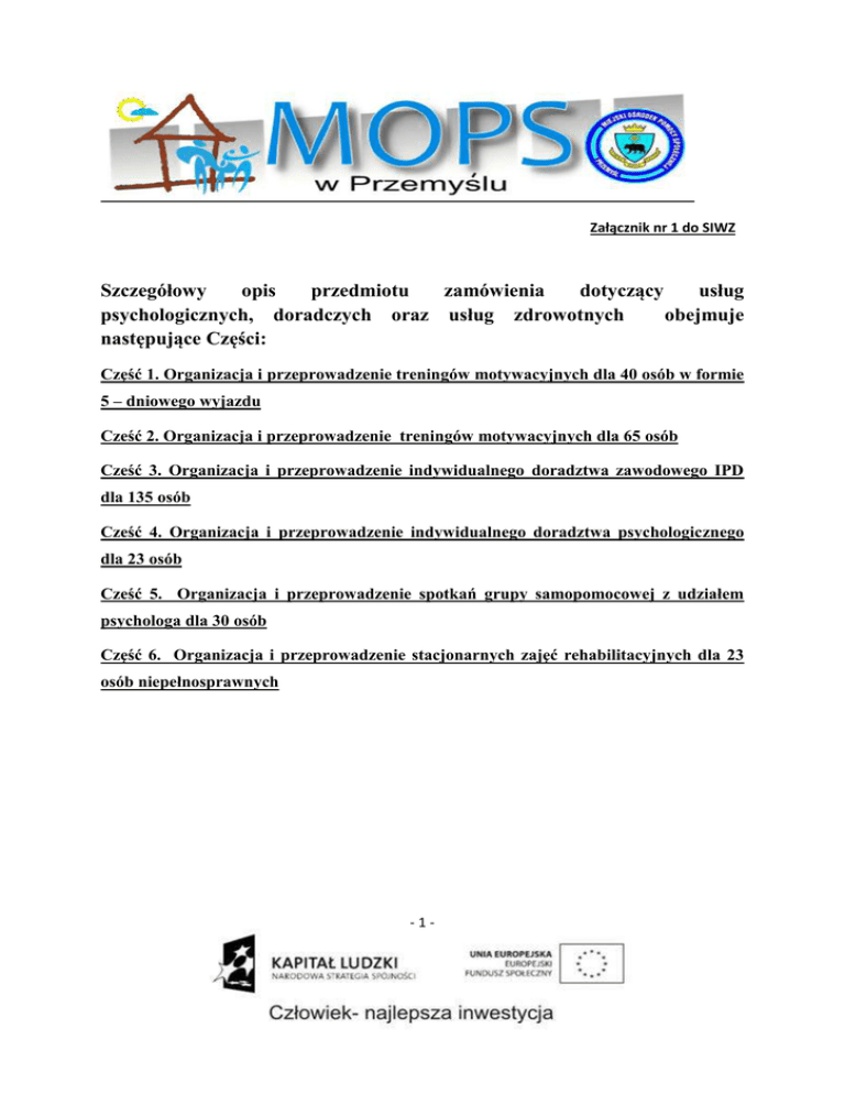 Załącznik nr 1 do SIWZ Szczegółowy opis przedmiotu zamówienia dotyczący usług psychologicznych, doradczych oraz usług zdrowotnych obejmuje następujące Części: Część 1. Organizacja i przeprowadzenie treningów motywacyjnych dla 40 osób w formie 5 – dniowego wyjazdu Cześć 2. Organizacja i przeprowadzenie treningów motywacyjnych dla 65 osób Cześć 3. Organizacja i przeprowadzenie indywidualnego doradztwa zawodowego IPD dla 135 osób Cześć 4. Organizacja i przeprowadzenie indywidualnego doradztwa psychologicznego dla 23 osób Cześć 5. Organizacja i przeprowadzenie spotkań grupy samopomocowej z udziałem psychologa dla 30 osób Część 6. Organizacja i przeprowadzenie stacjonarnych zajęć rehabilitacyjnych dla 23 osób niepełnosprawnych -1- I. Część ogólna 1.Miejscem prowadzenia szkolenia – zgodnie z opisem poszczególnych Części jest miasto Przemyśl z zastrzeżeniem, iż w zakresie Część 1 usługa będzie realizowana na terenie województwa podkarpackiego. 2. Wykonawca zapewni warunki do przeprowadzenia zajęć będących przedmiotem zamówienia zgodnie z obowiązującymi przepisami bezpieczeństwa i higieny pracy, w tym też na podstawie Rozporządzenia Ministra Edukacji Narodowej i Sportu z dnia 31 grudnia 2002 r w sprawie bezpieczeństwa i higieny w publicznych i niepublicznych szkołach i placówkach ( Dz. z 2003 r. Nr 6 poz.69). Pomieszczenia do odbywania zajęć muszą : być przystosowane do liczby słuchaczy przewidzianych do odbycia zajęć, posiadać zaplecze socjalne i sanitarne, posiadać sale wykładowe z oświetleniem naturalnym i sztucznym, z odpowiednią akustyką, w salach musi znajdować się odpowiednia liczba stołów i krzeseł, każdy z uczestników zajęć w trakcie części teoretycznych ma mieć zapewnione miejsce siedzące, w przypadku zajęć praktycznych w sali musi znajdować się odpowiedni sprzęt i warunki do pracy w grupach (zgodnie ze specyfiką zajęć), 2. Do realizacji zajęć Wykonawca zapewni /zakupi/ osobom biorącym w nich udział odpowiednie materiały szkoleniowe /np. teczki tekturowe zapinane (aktówki), zeszyty, długopisy, zakreślacze, pendrive itp./, które po zakończeniu zajęć przejdą w posiadanie uczestników przeprowadzonych zajęć – ( dotyczy części nr 1 i 2) Materiały te należy opatrzyć logo POKL, flagą Unii Europejskiej z odwołaniem do Unii Europejskiej i Europejskiego Funduszu Społecznego, informacją, że projekt jest współfinansowany ze środków Unii Europejskiej w ramach Europejskiego Funduszu Społecznego oraz nazwą projektu, z którego finansowana jest realizowana usługa na materiałach szkoleniowych, listach obecności uczestników, zaświadczeniach oraz wszelkich innych dokumentach dot. realizowanej usługi – -2- zgodnie z wytycznymi dotyczącymi oznaczania projektów w ramach Programu Operacyjnego Kapitał Ludzki. Wszystkie te materiały muszą być przygotowane i rozdane uczestnikom szkolenia w pierwszym dniu zajęć. Uczestnicy kwitują odbiór materiałów własnoręcznym podpisem. Oryginał tego pokwitowania Zamawiający otrzyma od Wykonawcy po zakończeniu zajęć razem z innymi materiałami niezbędnymi do rozliczenia całej usługi. 3. Do realizacji zajęć Wykonawca zapewni ich uczestnikom odpowiednie wyposażenie techniczne adekwatne do rodzaju usługi. W przypadku zajęć praktycznych musi być zapewniony odpowiedni sprzęt i warunki do pracy w grupach zgodnie ze specyfiką zajęć. 4. Wykonawca może powierzyć podwykonawcom wykonanie prac objętych przedmiotem zamówienia. 5. Zamawiający zastrzega sobie prawo do skierowania na zajęcia nowego Uczestnika, w przypadku, gdy jeden z dotychczasowych Uczestników przerwał zajęcia (dotyczy części nr 2 i 5 ). Skierowanie nowego Uczestnika, o którym mowa w zdaniu poprzedzającym jest dopuszczalne jedynie w przypadku, gdy Wykonawca zrealizował nie więcej niż liczbę godzin wskazanych w SIWZ przy opisie poszczególnych części przedmiotu zamówienia ( jeżeli dotyczy). Wykonawca zobowiązany jest dołożyć starań, aby nowy Uczestnik uzupełnił materiał objęty usługą o zakres, w którym Uczestnik nie brał udziału (jeżeli dotyczy). 6. W przypadku gdy po przerwaniu zajęć przez Uczestnika, grupa nie zostanie uzupełniona przez nowego Uczestnika, Zamawiający pokryje koszty usługi Uczestnika, który przerwał zajęcia za okres uczestnictwa w zajęciach, na podstawie wyliczeń przekazanych przez Wykonawcę ( dotyczy części nr 2, 5 ) Wyliczenie zostanie dokonane w oparciu o rzeczywiście poniesione koszty przez Wykonawcę, tj. koszt materiałów szkoleniowych oraz koszty, które ponosi Wykonawca niezależnie od liczby uczestników zajęć (wynagrodzenie osób przeprowadzających usługę, wynajem sal wykładowych). 7. W przypadku, gdy liczba osób zgłoszonych przez Zamawiającego do udziału w realizowanej usłudze jest większa niż liczba Uczestników, które faktycznie brały udział w zajęciach, Wykonawca może wystawić fakturę uwzględniającą wyższy koszt usługi jednego Uczestnika, niż wskazany w ofercie Wykonawcy, stosownie do rzeczywiście poniesionych kosztów koniecznych do zapewnienia prawidłowego przebiegu realizowanej usługi (wynajem -3- pomieszczeń, wynagrodzenie osób przeprowadzających usługę) – dotyczy części nr 1, 2, 3, 4, 5, 6 . 8. Wykonawca zobowiązany jest do przeprowadzenia wśród osób biorących udział w zajęciach oceny merytorycznej i technicznej przebiegu zajęć m.in. na podstawie formularza ankiety oceniającej przekazanej przez Zamawiającego stanowiącej Załącznik nr 10 do SIWZ. – dotyczy części nr 1, 2, 5 9. Wykonawca zobowiązany jest do umieszczenia logo POKL, flagę Unii Europejskiej z odwołaniem do Unii Europejskiej i Europejskiego Funduszu Społecznego, informację, że projekt jest współfinansowany ze środków Unii Europejskiej w ramach Europejskiego Funduszu Społecznego oraz nazwę projektu, z którego finansowane jest szkoleni