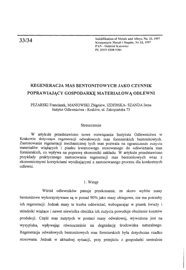 REGENERACJA MAS BENTONITOWYCH JAKO CZYNNIK ODLEWNI