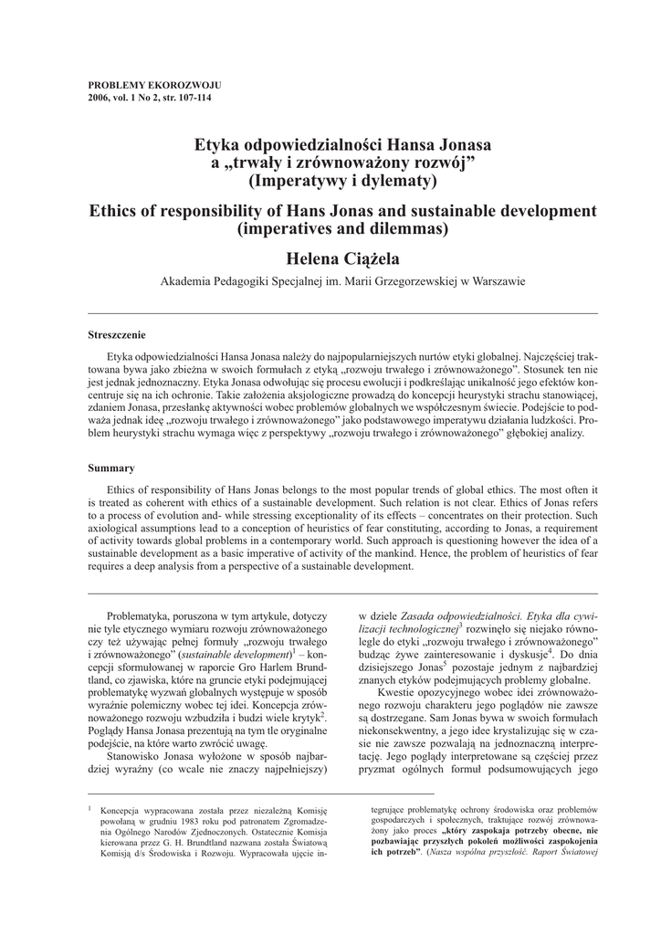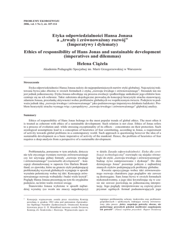 PROBLEMY EKOROZWOJU 2006, vol. 1 No 2, str. 107-114 Etyka odpowiedzialności Hansa Jonasa a „trwały i zrównoważony rozwój” (Imperatywy i dylematy) Ethics of responsibility of Hans Jonas and sustainable development (imperatives and dilemmas) Helena Ciążela Akademia Pedagogiki Specjalnej im. Marii Grzegorzewskiej w Warszawie Streszczenie Etyka odpowiedzialności Hansa Jonasa należy do najpopularniejszych nurtów etyki globalnej. Najczęściej traktowana bywa jako zbieżna w swoich formułach z etyką „rozwoju trwałego i zrównoważonego”. Stosunek ten nie jest jednak jednoznaczny. Etyka Jonasa odwołując się procesu ewolucji i podkreślając unikalność jego efektów koncentruje się na ich ochronie. Takie założenia aksjologiczne prowadzą do koncepcji heurystyki strachu stanowiącej, zdaniem Jonasa, przesłankę aktywności wobec problemów globalnych we współczesnym świecie. Podejście to podważa jednak ideę „rozwoju trwałego i zrównoważonego” jako podstawowego imperatywu działania ludzkości. Problem heurystyki strachu wymaga więc z perspektywy „rozwoju trwałego i zrównoważonego” głębokiej analizy. Summary Ethics of responsibility of Hans Jonas belongs to the most popular trends of global ethics. The most often it is treated as coherent with ethics of a sustainable development. Such relation is not clear. Ethics of Jonas refers to a process of evolution and- while stressing exceptionality of its effects – concentrates on their protection. Such axiological assumptions lead to a conception of heuristics of fear constituting, according to Jonas, a requirement of activity towards global problems in a contemporary world. Such approach is questioning however the idea of a sustainable development as a basic imperative of activity of the mankind. Hence, the problem of heuristics of fear requires a deep analysis from a perspective of a sustainable development. Problematyka, poruszona w tym artykule, dotyczy nie tyle etycznego wymiaru rozwoju zrównoważonego czy też używając pełnej formuły „rozwoju trwałego i zrównoważonego” (sustainable development)1 – koncepcji sformułowanej w raporcie Gro Harlem Brundtland, co zjawiska, które na gruncie etyki podejmującej problematykę wyzwań globalnych występuje w sposób wyraźnie polemiczny wobec tej idei. Koncepcja zrównoważonego rozwoju wzbudziła i budzi wiele krytyk2. Poglądy Hansa Jonasa prezentują na tym tle oryginalne podejście, na które warto zwrócić uwagę. Stanowisko Jonasa wyłożone w sposób najbardziej wyraźny (co wcale nie znaczy najpełniejszy) 1 Koncepcja wypracowana została przez niezależną Komisję powołaną w grudniu 1983 roku pod patronatem Zgromadzenia Ogólnego Narodów Zjednoczonych. Ostatecznie Komisja kierowana przez G. H. Brundtland nazwana została Światową Komisją d/s Środowiska i Rozwoju. Wypracowała ujęcie in- w dziele Zasada odpowiedzialności. Etyka dla cywilizacji technologicznej3 rozwinęło się niejako równolegle do etyki „rozwoju trwałego i zrównoważonego” budząc żywe zainteresowanie i dyskusje4. Do dnia dzisiejszego Jonas5 pozostaje jednym z najbardziej znanych etyków podejmujących problemy globalne. Kwestie opozycyjnego wobec idei zrównoważonego rozwoju charakteru jego poglądów nie zawsze są dostrzegane. Sam Jonas bywa w swoich formułach niekonsekwentny, a jego idee krystalizując się w czasie nie zawsze pozwalają na jednoznaczną interpretację. Jego poglądy interpretowane są częściej przez pryzmat ogólnych formuł podsumowujących jego tegrujące problematykę ochrony środowiska oraz problemów gospodarczych i społecznych, traktujące rozwój zrównoważony jako proces „który zaspokaja potrzeby obecne, nie pozbawiając przyszłych pokoleń możliwości zaspokojenia ich potrzeb”. (Nasza wspólna przyszłość. Raport Światowej 108 Henryka Ciążela/Problemy Ekorozwoju nr 2 (2006), 107-114 etykę niż logiki myśli do niej prowadzących. Z tej perspektywy myśl Jonasa sprawia wrażenie uniwersalnego przesłania stanowiącego podsumowanie rozwoju współczesnej cywilizacji zbieżnego z projektem „rozwoju trwałego i zrównoważonego”. Uwzględnianie całokształtu jego poglądów wskazuje, że problem ten jest znacznie bardziej złożony. Punktem wyjścia rozważań Jonasa jest teza o zmianie natury działania ludzkiego prowadzącej do przekroczenia dotychczasowych horyzontów refleksji etycznej, a tym samym do pojawienia się próżni etycznej. Źródłem kryzysu jest wzrost mocy człowieka, który powoduje możliwość tak dalekich ingerencji w naturę (rozumianą zarówno jako środowisko, jak i jako natura ludzka), że spowodować mogą, jeżeli już nie spowodowały6, nieodwracalne zmiany prowadzące do przekreślenia istnienia człowieka zarówno w fizycznym, jak i gatunkowym sensie. O ile tradycyjna etyka była antropocentryczna, ponieważ tym, co stanowiło kwestie jej regulacji były stosunki międzyludzkie, nowa etyka musi spojrzeć na człowieka z perspektywy jego relacji z naturą. Diagnozę tę uznać można za wspólną dla etyki odpowiedzialności Jonasa i etyki „rozwoju trwałego i zrównoważonego”, podobnie jak diagnozę kryzysu związanego z rozwojem cywilizacji współczesnej, którego przesłanką jest jej żywiołowy rozwój czyniący realną perspektywę globalnej katastrofy. Na tym jednak podobieństwa się kończą. Sustainable development jest koncepcją pozytywnej orientacji kierunków rozwoju cywilizacji wokół celów określonych przez człowieka w oparciu o humanistyczny ideał integracji celów ekologicznych, gospodarczych i społecznych. Zasadniczą cechą nowej etyki w ujęciu Hansa Jonasa jest jej negatywny charakter. Odpowiedzialność jako zasada dla cywilizacji technicznej jest tu rozumiana jako zasada prowadząca do bezwzględnego 2 3 4 Komisji do spraw Środowiska i Rozwoju, tłum. U. Grzelańska, E. Kolanowska, Warszawa 1991, s. 68). Brak jednoznacznej fo