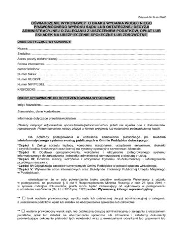Załącznik Nr 24 do SIWZ OŚWIADCZENIE WYKONAWCY O BRAKU WYDANIA WOBEC NIEGO PRAWOMOCNEGO WYROKU SĄDU LUB OSTATECZNEJ DECYZJI ADMINISTRACYJNEJ O ZALEGANIU Z UISZCZENIEM PODATKÓW, OPŁAT LUB SKŁADEK NA UBEZPIECZENIE SPOŁECZNE LUB ZDROWOTNE DANE DOTYCZĄCE WYKONAWCY: Nazwa: ........................................................................................................................................................ Siedziba: ..................................................................................................................................................... Adres poczty elektronicznej: ....................................................................................................................... Strona internetowa: .................................................................................................................................... numer telefonu: ……................................................................................................................................... Numer faksu: ……. ..................................................................................................................................... Numer REGON: .......................................................................................................................................... Numer NIP/PESEL:..................................................................................................................................... KRS/CEDIG: …........................................................................................................................................... OSOBY UPRAWNIONE DO REPREZENTOWANIA WYKONAWCY: Imię i Nazwisko:........................................................................................................................................... Stanowisko, dane kontaktowe:.................................................................................................................... Informacje dotyczące przedstawicielstwa: ….............................................................................................. (Należy załączyć odpowiednie upoważnienie/pełnomocnictwo, jeżeli nie wynika ono z dokumentów rejestrowych. Pełnomocnictwo należy złożyć w formie oryginału lub notarialnie poświadczonej kopii). Na potrzeby postępowania o udzielenie zamówienia publicznego pn. teleinformatycznego systemu e-usług publicznych w Gminie Poddębice dotyczącego: Budowa *Części I: Zakup sprzętu laptopy, komputery stacjonarne, urządzenia serwerowe, drukarki i czytniki kodów kreskowych oraz licencji na systemy operacyjne serwerowe i klienckie. *Części II: Dostawa oprogramowania, wdrożenie i utrzymanie zintegrowanego systemu informatycznego do zarządzania jednostką administracji samorządowej z obsługą e-usług. *Części III: Dostawa licencji, wdrożenie i utrzymanie Systemu do dokumentacji i udostępniania przebiegu nauczania. *Części IV: Digitalizacja zasobów turystycznych Gminy Poddębice w postaci spaceru wirtualnego. *Części V: Wykonanie stron internetowych oraz Biuletynów Informacji Publicznej Urzędu Miejskiego w Poddębicach, oświadczam/y, że w celu potwierdzenia braku podstaw wykluczenia Wykonawcy z udziału w postępowaniu na podstawie § 5 pkt 9 Rozporządzeniem Ministra Rozwoju z dnia 26 lipca 2016 r. w sprawie rodzajów dokumentów, jakich może żądać zamawiający od wykonawcy w postępowaniu o udzielenie zamówienia (Dz. U. z 2016 poz. 1126) wobec Wykonawcy, którego reprezentuję/my: ** □ ** □ wydano prawomocny wyrok sądu lub ostateczną decyzję administracyjną o zaleganiu z uiszczaniem brak wydania prawomocnego wyroku sądu lub ostatecznej decyzji administracyjnej o zaleganiu z uiszczaniem podatków, opłat lub składek na ubezpieczenia społeczne lub zdrowotne, podatków, opłat lub składek na ubezpieczenia społeczne lub zdrowotne i składamy dokumenty potwierdzające dokonanie płatności tych należności wraz z ewentualnymi odsetkami lub grzywnami lub zawarcie wiążącego porozumienia w sprawie spłat tych należności. * niepotrzebne skreślić ** należy zaznaczyć właściwe przy użyciu znaku „X”. …........................................................... (Data i podpis Wykonawcy)