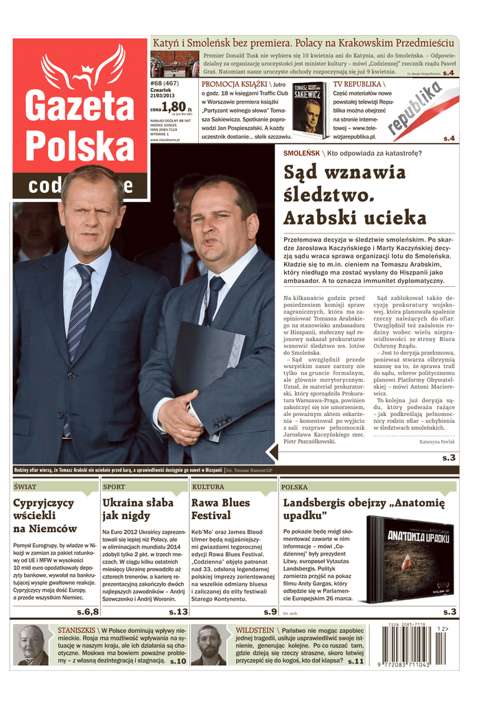 Katyń i Smoleńsk bez premiera. Polacy na Krakowskim Przedmieściu Premier Donald Tusk nie wybiera się 10 kwietnia ani do Katynia, ani do Smoleńska. – Odpowiedzialny za organizację uroczystości jest minister kultury – mówi „Codziennej” rzecznik rządu Paweł Graś. Natomiast nasze uroczyste obchody rozpoczynają się już 9 kwietnia. fot. Kacper Pempel/Reuters s.4 #68 (467) PROMOCJA KSIĄŻKI \ Jutro TV REPUBLIKA \ 21/03/2013 o godz. 18 w księgarni Traffic Club w Warszawie premiera książki „Partyzant wolnego słowa” Tomasza Sakiewicza. Spotkanie poprowadzi Jan Pospieszalski. A każdy uczestnik dostanie… słoik szczawiu. Część materiałów nowo powstałej telewizji Republika można obejrzeć na stronie internetowej – www.telewizjarepublika.pl. Czwartek 1,80 cena ZŁ (w tym 8% VAT) NAKŁAD OGÓLNY 88 947 INDEKS 100625 ISSN 2083-7119 WYDANIE 1 www.niezalezna.pl s.4 SMOLEŃSK \ Kto odpowiada za katastrofę? Sąd wznawia śledztwo. Arabski ucieka Przełomowa decyzja w śledztwie smoleńskim. Po skardze Jarosława Kaczyńskiego i Marty Kaczyńskiej decyzją sądu wraca sprawa organizacji lotu do Smoleńska. Kładzie się to m.in. cieniem na Tomaszu Arabskim, który niedługo ma zostać wysłany do Hiszpanii jako ambasador. A to oznacza immunitet dyplomatyczny. Na kilkanaście godzin przed posiedzeniem komisji spraw zagranicznych, która ma zaopiniować Tomasza Arabskiego na stanowisko ambasadora w Hiszpanii, stołeczny sąd rejonowy nakazał prokuraturze wznowić śledztwo ws. lotów do Smoleńska. – Sąd uwzględnił przede wszystkim nasze zarzuty nie tylko na gruncie formalnym, ale głównie merytorycznym. Uznał, że materiał prokuratorski, który sporządziła Prokuratura Warszawa-Praga, powinien zakończyć się nie umorzeniem, ale poważnym aktem oskarżenia – komentował po wyjściu z sali rozpraw pełnomocnik Jarosława Kaczyńskiego mec. Piotr Pszczółkowski. Sąd zablokował także decyzję prokuratury wojskowej, która planowała spalenie rzeczy należących do ofiar. Uwzględnił też zażalenie rodziny wobec wielu nieprawidłowości ze strony Biura Ochrony Rządu. – Jest to decyzja przełomowa, ponieważ stwarza olbrzymią szansę na to, że sprawa trafi do sądu, wbrew politycznemu planowi Platformy Obywatelskiej – mówi Antoni Macierewicz. To kolejna już decyzja sądu, który podważa rażące – jak podkreślają pełnomocnicy rodzin ofiar – uchybienia w śledztwach smoleńskich. Katarzyna Pawlak s.3 Rodziny ofiar wierzą, że Tomasz Arabski nie ucieknie przed karą, a sprawiedliwość dosięgnie go nawet w Hiszpanii |fot. Tomasz Hamrat/GP ŚWIAT SPORT KULTURA Cypryjczycy wściekli na Niemców Ukraina słaba jak nigdy Rawa Blues Festival Landsbergis obejrzy „Anatomię upadku” Keb’Mo’ oraz James Blood Ulmer będą najjaśniejszymi gwiazdami tegorocznej edycji Rawa Blues Festival. „Codzienna” objęła patronat nad 33. odsłoną legendarnej polskiej imprezy zorientowanej na wszelkie odmiany bluesa i zaliczanej do elity festiwali Starego Kontynentu. Po pokazie będę mógł sko-mentować zawarte w nim informacje – mówi „Codziennej” były prezydent Litwy, europoseł Vytautas Landsbergis. Polityk zamierza przyjść na pokaz filmu Anity Gargas, który odbędzie się w Parlamencie Europejskim 26 marca. Na Euro 2012 Ukraińcy zaprezentowali się lepiej niż Polacy, ale Pomysł Eurogrupy, by władze w Ni- w eliminacjach mundialu 2014 kozji w zamian za pakiet ratunko- zdobyli tylko 2 pkt. w trzech mewy od UE i MFW w wysokości czach. W ciągu kilku ostatnich 10 mld euro opodatkowały depo- miesięcy Ukrainę prowadziło aż zyty bankowe, wywołał na bankru- czterech trenerów, a karierę retującej wyspie gwałtowne reakcje. prezentacyjną zakończyło dwóch Cypryjczycy mają dość Europy, najlepszych zawodników – Andrij a przede wszystkim Niemiec. Szewczenko i Andrij Woronin. s.6,8 s.13 STANISZKIS \ W Polsce dominują wpływy nie- mieckie. Rosja ma możliwość wpływania na sytuację w naszym kraju, ale ich działania są chaotyczne. Moskwa ma bowiem poważne problemy – z własną dezintegracją i stagnacją. s.10 POLSKA s.9 fot. arch. WILDSTEIN \ Państwo nie mogąc zapobiec jednej tragedii, usiłuje usprawiedliwić swoje istnienie, generując kolejne. Po co ruszać tam, gdzie dzieją się rzeczy straszne, skoro łatwiej przyczepić się do kogoś, kto dał klapsa? s.11 s.3 OPINIE Witold Waszczykowski Gazeta Polska \\ Próbuje się przekonać nas, iż przyjęcie waluty euro zbliży nas do najważniejszych krajów Europy. To trochę zakamuflowany, ale jednak proniemiecki kurs na całkowitą symbiozę z gospodarką niemiecką. \\ CODZIENNIE CZWARTEK 21 MARCA 2013 2 b. wiceminister spraw zagranicznych www.niezalezna.pl fot. Zbyszek Kaczmarek/Gazeta Polska Marcin Wolski Konstruktywna propozycja | Minister Sikorski z powagą wylicza, że Rosjanie boją się Macierewicza. Wrak by już oddali i skrzynki do niego, lecz się obawiają pana Antoniego. W stosunkach nie byłoby żadnych kryzysów, gdyby nie ten poseł, co w dodatku z PiS-u! Stąd rada dla Radka, niech prze do wyborów, by go wnet zastąpił Antek – twórca KOR-u. Niech będzie ministrem, czasem tupnie w gniewie, a Putin ze strachu odda nam Królewiec. OPINIE | fot. Tomasz Hamrat/GP 2 *GDĽVN NE PR]QDĽ NW NE NW NE 2°C -4°C NE WrRFâaw 5°C -2°C NW N GRZEGORZ WSZOŁEK Sny o Imperium Romanum Minister Radek Sikorski przedstawił w Sejmie założenia polityki zagranicznej rządu. Minister ostatecznie zrezygnował z tzw. polityki jagiellońskiej, której on sam do 2007 r. hołdował. Zamiast tego Sikorski zaakcentował potrzebę silnego związania Polski z UE, snując przed nami wizję powtórki z historii wielkości Imperium Romanum. Problem w tym, że Unia, przeżarta kryzysem finansowym i tożsamościowym, nie pociągnie tak długo jak imperium rzymskie. Choć może podobnie skończyć, to znaczy po prostu się rozpaść, ale tego już najwyraźniej szef dyplo