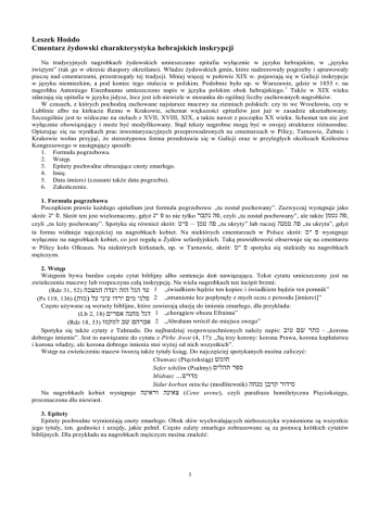 Leszek Hońdo Cmentarz żydowski charakterystyka hebrajskich inskrypcji Na tradycyjnych nagrobkach żydowskich umieszczano epitafia wyłącznie w języku hebrajskim, w „języku świętym” (tak go w okresie diaspory określano). Władze żydowskich gmin, które nadzorowały pogrzeby i sprawowały pieczę nad cmentarzami, przestrzegały tej tradycji. Mniej więcej w połowie XIX w. pojawiają się w Galicji inskrypcje w języku niemieckim, a pod koniec tego stulecia w polskim. Podobnie było np. w Warszawie, gdzie w 1855 r. na nagrobku Antoniego Eisenbauma umieszczono napis w języku polskim obok hebrajskiego.1 Także w XIX wieku zdarzają się epitafia w języku jidysz, lecz jest ich niewiele w stosunku do ogólnej liczby zachowanych nagrobków. W czasach, z których pochodzą zachowane najstarsze macewy na ziemiach polskich: czy to we Wrocławiu, czy w Lublinie albo na kirkucie Remu w Krakowie, schemat większości epitafiów jest już w zasadzie ukształtowany. Szczególnie jest to widoczne na stelach z XVII, XVIII, XIX, a także nawet z początku XX wieku. Schemat ten nie jest wyłącznie obowiązujący i może być modyfikowany. Stąd teksty nagrobne mogą być w swojej strukturze różnorodne. Opierając się na wynikach prac inwentaryzacyjnych przeprowadzonych na cmentarzach w Pilicy, Tarnowie, Żabnie i Krakowie wolno przyjąć, że stereotypowa forma przedstawia się w Galicji oraz w przyległych okolicach Królestwa Kongresowego w następujący sposób: 1. Formuła pogrzebowa. 2. Wstęp. 3. Epitety pochwalne obrazujące cnoty zmarłego. 4. Imię. 5. Data śmierci (czasami także data pogrzebu). 6. Zakończenie. 1. Formuła pogrzebowa Początkiem prawie każdego epitafium jest formuła pogrzebowa: „tu został pochowany”. Zazwyczaj występuje jako skrót: ״נ פ. Skrót ten jest wieloznaczny, gdyż ״נ פ to nie tylko נקבר פה, czyli „tu został pochowany”, ale także נטמן פה, czyli „tu leży pochowany”. Spotyka się również skrót: פ״ט – טמן פה „tu ukryty” lub raczej טמנה פה „tu ukryta”, gdyż ta forma widnieje najczęściej na nagrobkach kobiet. Na niektórych cmentarzach w Polsce skrót: ״מ פ występuje wyłącznie na nagrobkach kobiet, co jest regułą u Żydów sefardyjskich. Taką prawidłowość obserwuje się na cmentarzu w Pilicy koło Olkusza. Na niektórych kirkutach, np. w Tarnowie, skrót: ״מ פ spotyka się niekiedy na nagrobkach mężczyzn. 2. Wstęp Wstępem bywa bardzo często cytat biblijny albo sentencja doń nawiązująca. Tekst cytatu umieszczony jest na zwieńczeniu macewy lub rozpoczyna całą inskrypcję. Na wielu nagrobkach ten incipit brzmi: (Rdz 31, 52) המצבה ועדה הזה הגל עד 1 „świadkiem będzie ten kopiec i świadkiem będzie ten pomnik” (Ps 119, 136) ()מות על עיני ירדו מים פלגי 2 „strumienie łez popłynęły z mych oczu z powodu [śmierci]” Często używane są wersety biblijne, które zawierają aluzję do imienia zmarłego, dla przykładu: (Lb 2, 18) אפרים מחנה דגל 1 „chorągiew obozu Efraima” (Rdz 18, 33) למקמו שב אברהם 2 „Abraham wrócił do miejsca swego” Spotyka się także cytaty z Talmudu. Do najbardziej rozpowszechnionych należy napis: טוב שם כתר „korona dobrego imienia”. Jest to nawiązanie do cytatu z Pirke Awot (4, 17): „Są trzy korony: korona Prawa, korona kapłaństwa i korona władzy, ale korona dobrego imienia stoi wyżej od nich wszystkich”. Wstęp na zwieńczeniu macew tworzą także tytuły ksiąg. Do najczęściej spotykanych można zaliczyć: Chumasz (Pięcioksiąg) חומש Sefer tehilim (Psalmy) תהלים ספר Midrasz ...מדרש Sidur korban mincha (modlitewnik) מנחה קרבן סידור Na nagrobkach kobiet występuje וראינה צאינה (Cene urene), czyli parafraza homiletyczna Pięcioksięgu, przeznaczona dla niewiast. 3. Epitety Epitety pochwalne wymieniają cnoty zmarłego. Obok słów wychwalających nieboszczyka wymienione są wszystkie jego tytuły, tzn. godności i urzędy, jakie pełnił. Często zalety zmarłego zobrazowane są za pomocą krótkich cytatów biblijnych. Dla przykładu na nagrobkach mężczyzn można znaleźć: 1 (Hi 1, 8) וישר תם איש 1 „mąż zacny i prawy” (Ps 15, 2) תמים הולך 2 „postępował bez skazy” Dla kobiet: (Sdz 5, 24) תברך באהל מנשים „wśród niewiast w namiotach niech będzie błogosławiona” Oczywiście najczęściej sięga się do cytatów z poematu o dzielnej kobiecie (Prz 31, 1031): (Prz 31, 10) ימצא מי חיל אשת 1 „kobietę dzielną któż znajdzie?” (Prz 31, 20) לאביון שלחה וידיה לעני פרשה 2 „kierowała swoją dłoń do ubogiego a swoje ręce do potrzebującego” כפה Tytuły najczęściej podawane są w postaci skrótów, co utrudnia ich interpretację. Najbardziej rozpowszechniony jest tytuł מורנו „nasz nauczyciel" odnoszący się do rabina lub uczonego. Na niektórych cmentarzach tytuł: ()מוה הרב מורנו jest tak powszechny, że na pewno stracił swoje pierwotne znaczenie i odnosił się właściwie do wszystkich zmarłych, którzy angażowali się w zdobywanie wiedzy. Częstym zjawiskiem jest wykorzystywanie rządków wstępu i epitetów (jeżeli wstęp jest wyróżniony, np. znajduje się na zwieńczeniu macewy, to tylko rządków epitetów) do tworzenia akrostychów, polegających na tym, że początkowe słowa lub litery wierszy tworzą imię zmarłego oraz imię jego ojca. Jeżeli nieboszczyk pochodził z rodu Aarona lub był lewitą, to słowa הכהן lub הלוי są dodawane do imienia. Litery, które tworzą akrostych, najczęściej wyróżnione są w inskrypcji wielkością, kropką lub znaczkiem nad literą. Przy komponowaniu wstępu i epitetów układa się je często w rymy, czyli zgodność dźwiękową występującą przeważnie na końcu wiersza. Najczęściej wykorzystuje się do tego celu końcówki 