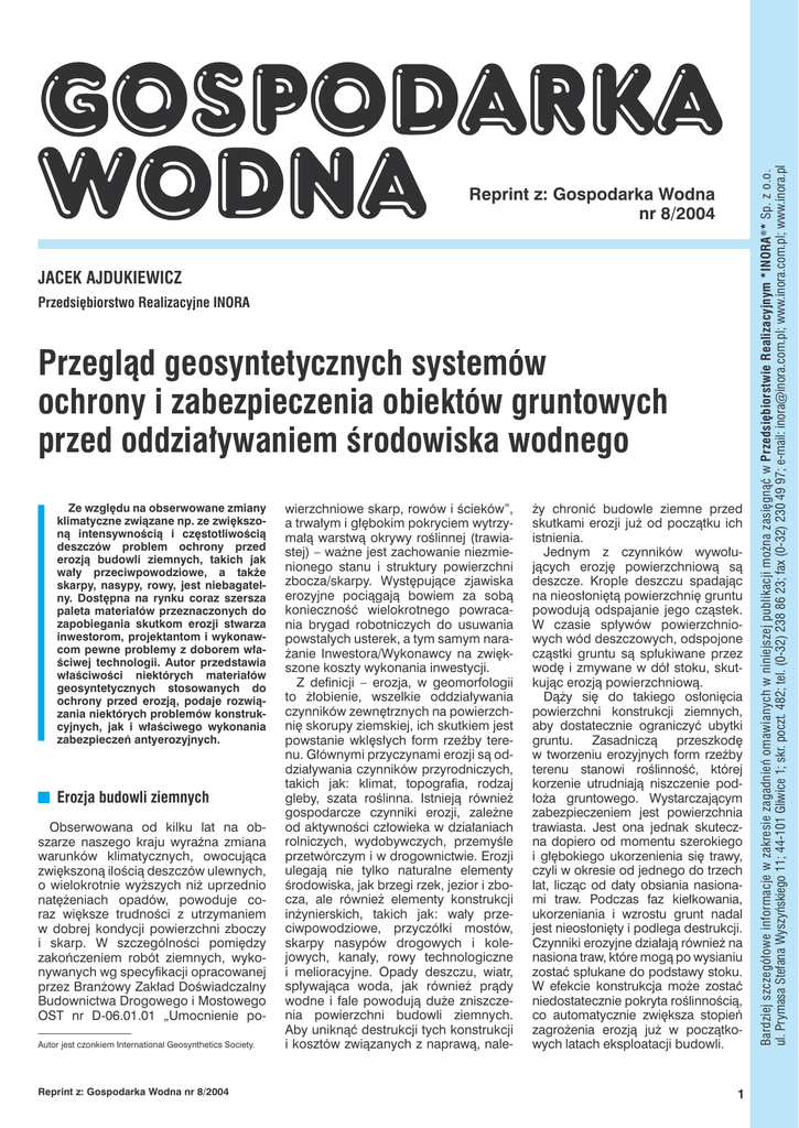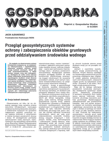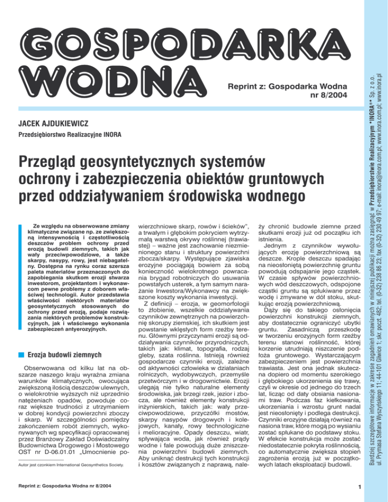 JACEK AJDUKIEWICZ Przedsiębiorstwo Realizacyjne INORA Przegląd geosyntetycznych systemów ochrony i zabezpieczenia obiektów gruntowych przed oddziaływaniem środowiska wodnego Ze względu na obserwowane zmiany klimatyczne związane np. ze zwiększoną intensywnością i częstotliwością deszczów problem ochrony przed erozją budowli ziemnych, takich jak wały przeciwpowodziowe, a także skarpy, nasypy, rowy, jest niebagatelny. Dostępna na rynku coraz szersza paleta materiałów przeznaczonych do zapobiegania skutkom erozji stwarza inwestorom, projektantom i wykonawcom pewne problemy z doborem właściwej technologii. Autor przedstawia właściwości niektórych materiałów geosyntetycznych stosowanych do ochrony przed erozją, podaje rozwiązania niektórych problemów konstrukcyjnych, jak i właściwego wykonania zabezpieczeń antyerozyjnych. Erozja budowli ziemnych Obserwowana od kilku lat na obszarze naszego kraju wyraźna zmiana warunków klimatycznych, owocująca zwiększoną ilością deszczów ulewnych, o wielokrotnie wyższych niż uprzednio natężeniach opadów, powoduje coraz większe trudności z utrzymaniem w dobrej kondycji powierzchni zboczy i skarp. W szczególności pomiędzy zakończeniem robót ziemnych, wykonywanych wg specyfikacji opracowanej przez Branżowy Zakład Doświadczalny Budownictwa Drogowego i Mostowego OST nr D-06.01.01 „Umocnienie poAutor jest czonkiem International Geosynthetics Society. Reprint z: Gospodarka Wodna nr 8/2004 wierzchniowe skarp, rowów i ścieków”, a trwałym i głębokim pokryciem wytrzymałą warstwą okrywy roślinnej (trawiastej) – ważne jest zachowanie niezmienionego stanu i struktury powierzchni zbocza/skarpy. Występujące zjawiska erozyjne pociągają bowiem za sobą konieczność wielokrotnego powracania brygad robotniczych do usuwania powstałych usterek, a tym samym narażanie Inwestora/Wykonawcy na zwiększone koszty wykonania inwestycji. Z definicji – erozja, w geomorfologii to żłobienie, wszelkie oddziaływania czynników zewnętrznych na powierzchnię skorupy ziemskiej, ich skutkiem jest powstanie wklęsłych form rzeźby terenu. Głównymi przyczynami erozji są oddziaływania czynników przyrodniczych, takich jak: klimat, topografia, rodzaj gleby, szata roślinna. Istnieją również gospodarcze czynniki erozji, zależne od aktywności człowieka w działaniach rolniczych, wydobywczych, przemyśle przetwórczym i w drogownictwie. Erozji ulegają nie tylko naturalne elementy środowiska, jak brzegi rzek, jezior i zbocza, ale również elementy konstrukcji inżynierskich, takich jak: wały przeciwpowodziowe, przyczółki mostów, skarpy nasypów drogowych i kolejowych, kanały, rowy technologiczne i melioracyjne. Opady deszczu, wiatr, spływająca woda, jak również prądy wodne i fale powodują duże zniszczenia powierzchni budowli ziemnych. Aby uniknąć destrukcji tych konstrukcji i kosztów związanych z naprawą, nale- ży chronić budowle ziemne przed skutkami erozji już od początku ich istnienia. Jednym z czynników wywołujących erozję powierzchniową są deszcze. Krople deszczu spadając na nieosłoniętą powierzchnię gruntu powodują odspajanie jego cząstek. W czasie spływów powierzchniowych wód deszczowych, odspojone cząstki gruntu są spłukiwane przez wodę i zmywane w dół stoku, skutkując erozją powierzchniową. Dąży się do takiego osłonięcia powierzchni konstrukcji ziemnych, aby dostatecznie ograniczyć ubytki gruntu. Zasadniczą przeszkodę w tworzeniu erozyjnych form rzeźby terenu stanowi roślinność, której korzenie utrudniają niszczenie podłoża gruntowego. Wystarczającym zabezpieczeniem jest powierzchnia trawiasta. Jest ona jednak skuteczna dopiero od momentu szerokiego i głębokiego ukorzenienia się trawy, czyli w okresie od jednego do trzech lat, licząc od daty obsiania nasionami traw. Podczas faz kiełkowania, ukorzeniania i wzrostu grunt nadal jest nieosłonięty i podlega destrukcji. Czynniki erozyjne działają również na nasiona traw, które mogą po wysianiu zostać spłukane do podstawy stoku. W efekcie konstrukcja może zostać niedostatecznie pokryta roślinnością, co automatycznie zwiększa stopień zagrożenia erozją już w początkowych latach eksploatacji budowli. 1 Bardziej szczegółowe informacje w zakresie zagadnień omawianych w niniejszej publikacji można zasięgnąć w Przedsiębiorstwie Realizacyjnym *INORA ®* Sp. z o.o. ul. Prymasa Stefana Wyszyńskiego 11; 44-101 Gliwice 1; skr. poczt. 482; tel. (0-32) 238 86 23; fax (0-32) 230 49 97; e-mail: [email protected]; www.inora.com.pl; www.inora.pl Reprint z: Gospodarka Wodna nr 8/2004 Rys. 1. Sposób zabezpieczenia skarpy przed erozją: 1-drenaż francuski naskarpowy; 2-drenaż francuski u podstawy skarpy, stanowiący jednocześnie podziemne antypoślizgowe dociążenie podstawy skarpy; 3-odwodnienie liniowe z kształtek betonowych; 4-dolne zakotwienie biomaty /siatki/ maty przez zawinięcie końca na drewnianej belce i przymocowanie szpilką; 5-przeciwskarpa; 6-biomata/siatka /mata zabezpieczająca powierzchnię skarpy przed erozją mocowana kołkami lub szpilkami (w zależności od kąta nachylenia skarpy i rodzaju gruntu); 7-geosiatka typu HaTe® 23.142 lub HaTe® 30.143, względnie Fortrac® D 90; 8-warstwa obhumusowana – w zależności od rodzaju gruntu – gr. 5÷15 cm; 9-grunt macierzysty lub nasypowy; 10-szczegół zakotwienia dolnej końcówki siatki/biomaty nawiniętej na belkę, naciągniętej i przymocowanej do podłoża szpilkami stalowymi w rozstawie min. 100 cm. Zalecenia ogólne stosowania przestrzennych mat antyerozyjnych Zalety stosowania materiałów do ochrony przed erozją: Obecnie znanych jest wiele metod zabezpieczeń przeciwerozyjnych. Jednym z kilku możliwych rozwiązań jest zastosowanie przestrzennych mat antyerozyjnych. Przestrzenne maty antyerozyjne, wykonane z gęstej sieci nieuporządkowanych, pojedynczych żyłek polipropylenowych (PP) lub po
