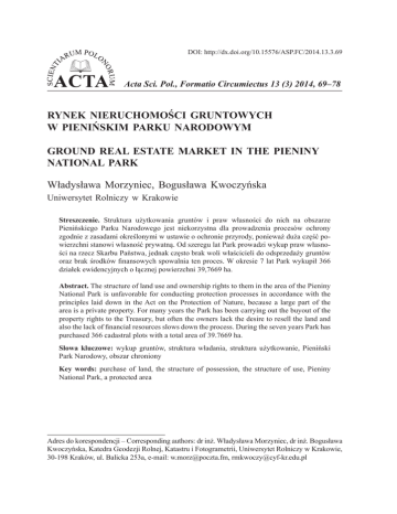 DOI: http://dx.doi.org/10.15576/ASP.FC/2014.13.3.69 Acta Sci. Pol., Formatio Circumiectus 13 (3) 2014, 69–78 RYNEK NIERUCHOMOŚCI GRUNTOWYCH W PIENIŃSKIM PARKU NARODOWYM GROUND REAL ESTATE MARKET IN THE PIENINY NATIONAL PARK Władysława Morzyniec, Bogusława Kwoczyńska Uniwersytet Rolniczy w Krakowie Streszczenie. Struktura użytkowania gruntów i praw własności do nich na obszarze Pienińskiego Parku Narodowego jest niekorzystna dla prowadzenia procesów ochrony zgodnie z zasadami określonymi w ustawie o ochronie przyrody, ponieważ duża część powierzchni stanowi własność prywatną. Od szeregu lat Park prowadzi wykup praw własności na rzecz Skarbu Państwa, jednak często brak woli właścicieli do odsprzedaży gruntów oraz brak środków finansowych spowalnia ten proces. W okresie 7 lat Park wykupił 366 działek ewidencyjnych o łącznej powierzchni 39,7669 ha. Abstract. The structure of land use and ownership rights to them in the area of the Pieniny National Park is unfavorable for conducting protection processes in accordance with the principles laid down in the Act on the Protection of Nature, because a large part of the area is a private property. For many years the Park has been carrying out the buyout of the property rights to the Treasury, but often the owners lack the desire to resell the land and also the lack of financial resources slows down the process. During the seven years Park has purchased 366 cadastral plots with a total area of 39.7669 ha. Słowa kluczowe: wykup gruntów, struktura władania, struktura użytkowanie, Pieniński Park Narodowy, obszar chroniony Key words: purchase of land, the structure of possession, the structure of use, Pieniny National Park, a protected area Adres do korespondencji – Corresponding authors: dr inż. Władysława Morzyniec, dr inż. Bogusława Kwoczyńska, Katedra Geodezji Rolnej, Katastru i Fotogrametrii, Uniwersytet Rolniczy w Krakowie, 30-198 Kraków, ul. Balicka 253a, e-mail: [email protected], [email protected] 70 W. Morzyniec, B. Kwoczyńska WSTĘP Obszar Pienin ze względu na przyrodnicze i krajobrazowe walory został objęty ochroną od 1932 roku przez utworzenie Pienińskiego Parku Narodowego (dalej: PPN). Procesy ochrony zostały wzmocnione prawem unijnym w 2004 roku przez utworzenie obszarów Natura 2000 dotyczących specjalnej ochrony ptaków i siedlisk. Skomplikowana struktura władania gruntami w Parku stanowi barierę dla wprowadzania zasad ochrony przyrody. Na obszarach objętych ochroną w parkach narodowych oraz program Natura 2000 bardzo ważne są prawa różnych podmiotów do nieruchomości gruntowych. Grunty Skarbu Państwa pozostające w użytkowaniu wieczystym władz parku narodowego dają możliwość właściwego gospodarowania i wypełniania zadań określonych przez ustawę o ochronie przyrody: art. 8, p. 2 tej ustawy określa cele ochrony: „Park narodowy tworzy się w celu zachowania różnorodności biologicznej, zasobów, tworów i składników przyrody nieożywionej i walorów krajobrazowych, przywrócenia właściwego stanu zasobów i składników przyrody oraz odtworzenia zniekształconych siedlisk przyrodniczych, siedlisk roślin, siedlisk zwierząt lub siedlisk grzybów” [Ustawa... 2004]. Publikacja przedstawia strukturę użytkowania gruntów i praw własności do nich na obszarze PPN. Ponieważ duża część powierzchni Parku jest własnością osób prywatnych, występują problemy z przestrzeganiem zasad zrównoważonego rozwoju. Park od lat prowadzi działania związane z wykupem gruntów na rzecz Skarbu Państwa, jednak brak zgody właścicieli ziemi, a także środków finansowych na ten cel spowalnia proces wykupu. PROCESY KSZTAŁTOWANIA UŻYTKÓW ROLNYCH I PRAW WŁASNOŚCI W PIENINACH Krajobraz Pienin z mozaiką lasów i polan, użytków rolnych, dolin rzecznych na stokach wschodniej części Pasa Skałkowego kamieńcy nadrzecznych, został ukształtowany w procesie przemian trwającym tysiące lat. Przez analogię do badań prowadzonych na Podhalu można przyjąć, że prymitywne zaczątki rolnictwa pochodzą z neolitu. Pierwszymi nadzwyczaj prymitywnymi formami upraw rolniczych były tzw. pasieki pierwotne, czyli polany wyrobione systemem żarowym lub kopieniackim [Solecki 1971]. Na obszarach pasiek prowadzono prawdopodobnie działalność rolniczo-koczowniczą bez zakładania stałych, najprymitywniejszych zagród rolniczych. Z pasiek tych czerpano pożytki przez penetrację z obszarów zasiedlonych. W późniejszych czasach w miejscu pasiek zakładano pierwsze stałe osady [Morzyniec 2003]. Rolnictwa w tej formie utrzymywało się do okresu wczesnośredniowiecznego, który wiąże się z rozwojem osadnictwa na terenie Karpat oraz polityką osadniczą panujących, dokonujących nadań wzdłuż koryt rzecznych i cieków wodnych. Około połowy XII wieku zainteresowanie kolonizacją terenu Pienin wzmaga się i następują przemiany we władaniu i użytkowaniu gruntów. Zdaniem Zarzyckiego [1982]: „Charakter roślinności, który ukształtował się pierwotnie pod wpływem gleb i klimatu, powoli od stuleci zmienia człowiek. Początkowo w górnym paleolicie, a więc przeszło od 35 000 lat temu, oddziaływanie grup ludzkich było bardzo słabe, nasiliło się ono w wiekach średnich, ażeby w XIX wieku doprowadzić do radykalnych przekształceń i zniszczeń roślinności leśnej”. Acta Sci. Pol. Rynek nieruchomości gruntowych w Pienińskim Parku Narodowym 71 Uwłaszczenie chłopów przeprowadzone w 1848 roku nie wprowadziło zasadniczych zmian w strukturze władania i użytkowania na górotworze pienińskim. Wraz z nadaniami ziemi rolnej chłopi otrzymali również skrawki lasów, które wykorzystywali do potrzeb własnych [Smólski 1960]. Proces przekształcania struktury własności w rejonie Pienin rozpoczął się od decyzji związanej z objęciem ochroną najcenniejszych obszarów, czyli od powstania rezerwatu na Zamkowej Górze w 1921 roku. W roku 1928
