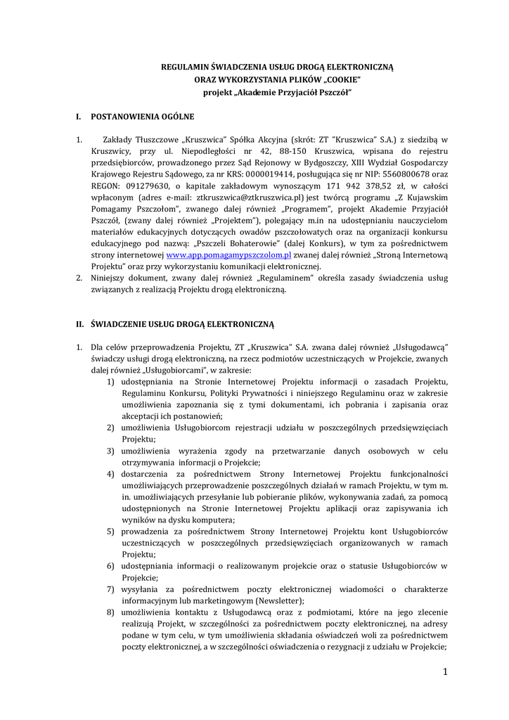 REGULAMIN ŚWIADCZENIA USŁUG DROGĄ ELEKTRONICZNĄ ORAZ WYKORZYSTANIA PLIKÓW „COOKIE” projekt „Akademie Przyjaciół Pszczół” I. POSTANOWIENIA OGÓLNE 1. Zakłady Tłuszczowe „Kruszwica” Spółka Akcyjna (skrót: ZT ”Kruszwica” S.A.) z siedzibą w Kruszwicy, przy ul. Niepodległości nr 42, 88-150 Kruszwica, wpisana do rejestru przedsiębiorców, prowadzonego przez Sąd Rejonowy w Bydgoszczy, XIII Wydział Gospodarczy Krajowego Rejestru Sądowego, za nr KRS: 0000019414, posługująca się nr NIP: 5560800678 oraz REGON: 091279630, o kapitale zakładowym wynoszącym 171 942 378,52 zł, w całości wpłaconym (adres e-mail: [email protected]) jest twórcą programu „Z Kujawskim Pomagamy Pszczołom”, zwanego dalej również „Programem”, projekt Akademie Przyjaciół Pszczół, (zwany dalej również „Projektem”), polegający m.in na udostępnianiu nauczycielom materiałów edukacyjnych dotyczących owadów pszczołowatych oraz na organizacji konkursu edukacyjnego pod nazwą: „Pszczeli Bohaterowie” (dalej Konkurs), w tym za pośrednictwem strony internetowej www.app.pomagamypszczolom.pl zwanej dalej również „Stroną Internetową Projektu” oraz przy wykorzystaniu komunikacji elektronicznej. 2. Niniejszy dokument, zwany dalej również „Regulaminem” określa zasady świadczenia usług związanych z realizacją Projektu drogą elektroniczną. II. ŚWIADCZENIE USŁUG DROGĄ ELEKTRONICZNĄ 1. Dla celów przeprowadzenia Projektu, ZT „Kruszwica” S.A. zwana dalej również „Usługodawcą” świadczy usługi drogą elektroniczną, na rzecz podmiotów uczestniczących w Projekcie, zwanych dalej również „Usługobiorcami”, w zakresie: 1) udostępniania na Stronie Internetowej Projektu informacji o zasadach Projektu, Regulaminu Konkursu, Polityki Prywatności i niniejszego Regulaminu oraz w zakresie umożliwienia zapoznania się z tymi dokumentami, ich pobrania i zapisania oraz akceptacji ich postanowień; 2) umożliwienia Usługobiorcom rejestracji udziału w poszczególnych przedsięwzięciach Projektu; 3) umożliwienia wyrażenia zgody na przetwarzanie danych osobowych w celu otrzymywania informacji o Projekcie; 4) dostarczenia za pośrednictwem Strony Internetowej Projektu funkcjonalności umożliwiających przeprowadzenie poszczególnych działań w ramach Projektu, w tym m. in. umożliwiających przesyłanie lub pobieranie plików, wykonywania zadań, za pomocą udostępnionych na Stronie Internetowej Projektu aplikacji oraz zapisywania ich wyników na dysku komputera; 5) prowadzenia za pośrednictwem Strony Internetowej Projektu kont Usługobiorców uczestniczących w poszczególnych przedsięwzięciach organizowanych w ramach Projektu; 6) udostępniania informacji o realizowanym projekcie oraz o statusie Usługobiorców w Projekcie; 7) wysyłania za pośrednictwem poczty elektronicznej wiadomości o charakterze informacyjnym lub marketingowym (Newsletter); 8) umożliwienia kontaktu z Usługodawcą oraz z podmiotami, które na jego zlecenie realizują Projekt, w szczególności za pośrednictwem poczty elektronicznej, na adresy podane w tym celu, w tym umożliwienia składania oświadczeń woli za pośrednictwem poczty elektronicznej, a w szczególności oświadczenia o rezygnacji z udziału w Projekcie; 1 2. 3. 4. 5. 6. 7. 8. 9. 10. 9) umożliwienia przystąpienia do poszczególnych przedsięwzięć Projektu za pośrednictwem interaktywnych formularzy, dostępnych na Stronie Internetowej Projektu; 10) prezentowania nagród, materiałów o charakterze szkoleniowym lub edukacyjnym, możliwych do uzyskania w danym przedsięwzięciu, jeśli zostało to przewidziane przez zasady tego przedsięwzięcia. Przesyłanie jakichkolwiek informacji za pośrednictwem poczty elektronicznej dotyczących realizacji Projektu poprzedzone jest uzyskaniem zgody adresata, jeśli ta zgoda jest wymagana przepisami prawa. W przypadku Konkursu „Pszczeli Bohaterowie” nauczyciele, którzy przyłączyli się do Konkursu, są zobowiązani uzyskać zgodę opiekunów prawnych dzieci, których adres e-mail zostanie podany w celu przesłania linku aktywacyjnego do rejestracji dziecka w Konkursie. Usługobiorcą może być osoba fizyczna, osoba prawna lub jednostka organizacyjna nieposiadająca osobowości prawnej, której ustawa przyznaje zdolność prawną, jeśli zgodnie z zasadami poszczególnych przedsięwzięć może uczestniczyć w Projekcie. Umowa świadczenia usług drogą elektroniczną zostaje zawarta w chwili dokonania rejestracji w Projekcie i ulega rozwiązaniu z chwilą zakończenia Projektu lub danego przedsięwzięcia realizowanego w ramach Projektu albo z chwilą zakończenia udziału Usługobiorcy w Projekcie, poprzez złożenie przez Usługobiorcę oświadczenia o rezygnacji. Przed zawarciem umowy Usługobiorca ma możliwość zapoznania się z treścią niniejszego Regulaminu oraz akceptacji jego treści. Zaakceptowanie Regulaminu jest konieczne do dokonania rejestracji w Projekcie. Świadczenie usług drogą elektroniczną następuje nieodpłatnie. Warunkiem technicznym niezbędnym do świadczenia usług drogą elektroniczną jest posiadanie zainstalowanej przeglądarki internetowej. Zakazuje się dostarczania przez Usługobiorców treści o charakterze bezprawnym, w tym w szczególności wypowiedzi i opinii obraźliwych, wulgaryzmów (również wykropkowanych), wypowiedzi rasistowskich, poniżających, ośmieszających itp. W związku z korzystaniem z usług drogą elektroniczną nie istnieją żadne szczególne zagrożenia, o których mowa w art. 6 pkt 1 ustawy z dnia 18 lipca 2002 r. o świadczeniu usług droga elektroniczną (t,j, Dz. U. z 2013 r, poz. 1422). Usługodawca zwraca jednak uwagę, że świadczenie usług drogą elektroniczną może wiązać się z zagrożeniem po stronie Usługobiorcy jako użytkownika Internetu. Ryzyko związane z korzystaniem z usług świadczonych drogą elektroniczną polega w szczególności na zagrożeniu zain