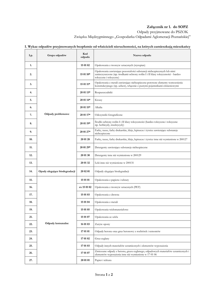 Załącznik nr 1. do SOPZ Odpady przyjmowane do PSZOK Związku Międzygminnego „Gospodarka Odpadami Aglomeracji Poznańskiej” I. Wykaz odpadów przyjmowanych bezpłatnie od właścicieli nieruchomości, na których zamieszkują mieszkańcy Lp. Grupa odpadów Kod odpadu Nazwa odpadu 1. 15 01 02 Opakowania z tworzyw sztucznych (styropian) 2. 15 01 10* Opakowania zawierające pozostałości substancji niebezpiecznych lub nimi zanieczyszczone (np. środkami ochrony roślin I i II klasy toksyczności - bardzo toksyczne i toksyczne) 3. 15 01 11* Opakowania z metali zawierające niebezpieczne porowate elementy wzmocnienia konstrukcyjnego (np. azbest), włącznie z pustymi pojemnikami ciśnieniowymi 4. 20 01 13* Rozpuszczalniki 5. 20 01 14* Kwasy 6. 20 01 15* Alkalia 20 01 17* Odczynniki fotograficzne 8. 20 01 19* Środki ochrony roślin I i II klasy toksyczności (bardzo toksyczne i toksyczne np. herbicydy, insektycydy) 9. 20 01 27* Farby, tusze, farby drukarskie, kleje, lepiszcze i żywice zawierające substancje niebezpieczne 10. 20 01 28 Farby, tusze, farby drukarskie, kleje, lepiszcze i żywice inne niż wymienione w 200127 11. 20 01 29* Detergenty zawierające substancje niebezpieczne 12. 20 01 30 Detergenty inne niż wymienione w 200129 13. 20 01 32 Leki inne niż wymienione w 200131 20 02 01 Odpady ulegające biodegradacji 15. 15 01 01 Opakowania z papieru i tektury 16. ex 15 01 02 17. 15 01 03 Opakowania z drewna 18. 15 01 04 Opakowania z metali 19. 15 01 05 Opakowania wielomateriałowe 21. 15 01 07 Opakowania ze szkła 16 01 03 Zużyte opony 23. 17 01 01 Odpady betonu oraz gruz betonowy z rozbiórek i remontów 24. 17 01 02 Gruz ceglany 25. 17 01 03 Odpady innych materiałów ceramicznych i elementów wyposażenia 26. 17 01 07 Zmieszane odpady z betonu, gruzu ceglanego, odpadowych materiałów ceramicznych i elementów wyposażenia inne niż wymienione w 17 01 06 27. 20 01 01 Papier i tektura 7. 14. 22. Odpady problemowe Opady ulegające biodegradacji Odpady komunalne Opakowania z tworzyw sztucznych (PET) Strona 1 z 2 28. 20 01 02 Szkło 29. 20 01 10 Odzież 30. 20 01 11 Tekstylia 31. 20 01 21* Lampy fluorescencyjne i inne odpady zawierające rtęć 32. 20 01 23* Urządzenia zawierające freony 33. 20 01 25 Oleje i tłuszcze jadalne 20 01 33* Baterie i akumulatory łącznie z bateriami i akumulatorami wymienionymi w 16 06 01, 160602 lub 160603 oraz niesortowane baterie i akumulatory zawierające te baterie 35. 20 01 34 Baterie i akumulatory inne niż wymienione w 20 01 33 36. 20 01 35* Zużyte urządzenia elektryczne i elektroniczne inne niż wymienione 20 01 21 i 20 01 23 zawierające niebezpieczne składniki 37. 20 01 36 Zużyte urządzenia elektryczne i elektroniczne inne niż wymienione w 20 01 21, 20 01 23 i 20 01 35 38. 20 01 38 Drewno inne niż wymienione w 20 01 37 39. 20 01 39 Tworzywa sztuczne 40. 20 01 40 Metale 41. 20 01 99 Inne niewymienione frakcje zbierane w sposób selektywny 34. Odpady komunalne 42. Meble i inne odpady wielkogabarytowe 200307 Odpady wielkogabarytowe 43. Odpady resztkowe 200399 Odpady komunalne niewymienione w innych podgrupach II. Wykaz odpadów przyjmowanych bezpłatnie od właścicieli nieruchomości, na których nie zamieszkują mieszkańcy, a powstają odpady komunalne Lp. Grupa odpadów Kod odpadu Nazwa odpadu 1. 15 01 01 2. ex 15 01 02 3. 15 01 04 Opakowania z metali 4. 15 01 05 Opakowania wielomateriałowe 15 01 07 Opakowania ze szkła 6. 20 01 01 Papier i tektura 7. 20 01 02 Szkło 8. 20 01 39 Tworzywa sztuczne 9. 20 01 40 Metale 5. Odpady komunalne Opakowania z papieru i tektury Opakowania z tworzyw sztucznych (PET) Strona 2 z 2