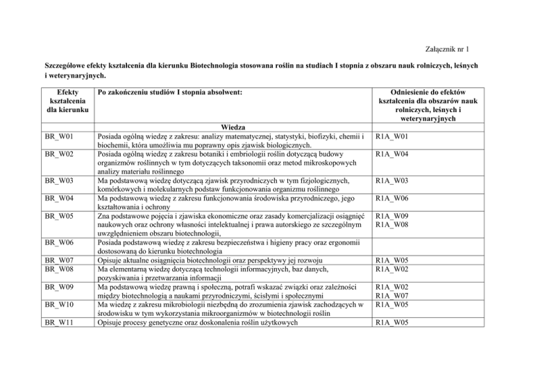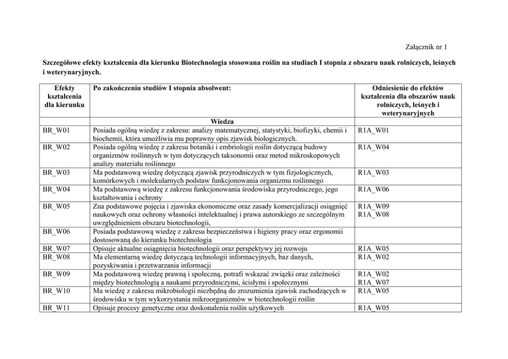 Załącznik nr 1 Szczegółowe efekty kształcenia dla kierunku Biotechnologia stosowana roślin na studiach I stopnia z obszaru nauk rolniczych, leśnych i weterynaryjnych. Efekty kształcenia dla kierunku BR_W01 BR_W02 BR_W03 BR_W04 BR_W05 BR_W06 BR_W07 BR_W08 BR_W09 BR_W10 BR_W11 Po zakończeniu studiów I stopnia absolwent: Wiedza Posiada ogólną wiedzę z zakresu: analizy matematycznej, statystyki, biofizyki, chemii i biochemii, która umożliwia mu poprawny opis zjawisk biologicznych. Posiada ogólną wiedzę z zakresu botaniki i embriologii roślin dotyczącą budowy organizmów roślinnych w tym dotyczących taksonomii oraz metod mikroskopowych analizy materiału roślinnego Ma podstawową wiedzę dotyczącą zjawisk przyrodniczych w tym fizjologicznych, komórkowych i molekularnych podstaw funkcjonowania organizmu roślinnego Ma podstawową wiedzę z zakresu funkcjonowania środowiska przyrodniczego, jego kształtowania i ochrony Zna podstawowe pojęcia i zjawiska ekonomiczne oraz zasady komercjalizacji osiągnięć naukowych oraz ochrony własności intelektualnej i prawa autorskiego ze szczególnym uwzględnieniem obszaru biotechnologii, Posiada podstawową wiedzę z zakresu bezpieczeństwa i higieny pracy oraz ergonomii dostosowaną do kierunku biotechnologia Opisuje aktualne osiągnięcia biotechnologii oraz perspektywy jej rozwoju Ma elementarną wiedzę dotyczącą technologii informacyjnych, baz danych, pozyskiwania i przetwarzania informacji Ma podstawową wiedzę prawną i społeczną, potrafi wskazać związki oraz zależności między biotechnologią a naukami przyrodniczymi, ścisłymi i społecznymi Ma wiedzę z zakresu mikrobiologii niezbędną do zrozumienia zjawisk zachodzących w środowisku w tym wykorzystania mikroorganizmów w biotechnologii roślin Opisuje procesy genetyczne oraz doskonalenia roślin użytkowych Odniesienie do efektów kształcenia dla obszarów nauk rolniczych, leśnych i weterynaryjnych R1A_W01 R1A_W04 R1A_W03 R1A_W06 R1A_W09 R1A_W08 R1A_W05 R1A_W02 R1A_W02 R1A_W07 R1A_W05 R1A_W05 BR_W12 BR_W13 BR_W14 BR_W15 BR_W16 BR_W17 BR_U01 BR_U02 BR_U03 BR_U04 BR_U05 BR_U06 BR_U07 BR_U08 BR_U09 BR_U10 BR_K01 BR_K02 Zna budowę i funkcjonowanie genomów roślinnych Posiada wiedzę na temat podstawowych technik, narzędzi i urządzeń badawczych stosowanych w badaniach genetycznych i biotechnologicznych Posiada wiedzę o wymaganiach siedliskowych, potrzebach pokarmowych roślin, technologii uprawy roślin Identyfikuje zagrożenia biotyczne i abiotyczne roślin i zna metody ich zapobiegania Charakteryzuje podstawowe metody transformacji genetycznej roślin Definiuje podstawowe terminy genetyczne, fizjologiczne i biotechnologiczne Umiejętności Potrafi analizować molekularne i komórkowe mechanizmy funkcjonowania organizmów roślinnych Posiada umiejętność poszukiwania informacji, analizy i wykorzystania literatury i baz danych Posługuje się terminologią specjalistyczną w języku polskim i innym nowożytnym języku obcym Potrafi wykorzystać podstawowe metody statystyczne i technologie informatyczne do analizy danych, opisu zjawisk biologicznych i formułowania wniosków Potrafi przeprowadzić proste zadania badawcze pod kierunkiem opiekuna naukowego Stosuje podstawowe techniki i narzędzia badawcze w biologii i biotechnologii roślin Posługuje się nowożytnym językiem obcym wystarczającym do porozumiewania się zgodnie z wymaganiami określonymi dla poziomu B2 Rozwiązuje zaistniałe problemy zawodowe oraz ma świadomość samokształcenia i podnoszenia kompetencji zawodowych Przygotowuje opracowania pisemne i wystąpienia z zakresu nauk przyrodniczych wraz z poprawną dokumentacją Przygotowuje i przedstawia prezentacje z zakresu biotechnologii roślin z uwzględnieniem zadania inżynierskiego Kompetencje społeczne Potrafi współpracować w grupie przyjmując w niej różne role, jest odpowiedzialny za pracę własną i zespołową Ma świadomość znaczenia wpływu biotechnologii roślin na stan środowiska naturalnego i jakość życia ludzi R1A_W01 R1A_W05 R1A_W06 R1A_W03 R1A_W05 R1A_W01 R1A_U05 R1A_U01 R1A_U09 R1A_U10 R1A_U03 R1A_U04 R1A_U06 R1A_U10 R1A_U07 R1A_U02 R1A_U08 R1A_U02 R1A_U09 R1A_K02 R1A_K05 R1A_K06 BR_K03 BR_K04 BR_K05 BR_K06 BR_K07 BR_K08 Rozumie potrzebę dokształcania się przez całe życie i podnoszenia kompetencji zawodowych i społecznych Poczuwa się do odpowiedzialności za powierzony mu sprzęt i aparaturę Zna ryzyko zawodowej i etycznej odpowiedzialności stosowania metod biologii molekularnej i inżynierii genetycznej u roślin Potrafi myśleć i działać kreatywnie w kierunku praktycznego wykorzystania biotechnologii roślin Określa priorytety służące realizacji postawionego przez siebie lub innych zadania Stosuje się do zasad bezpieczeństwa i higieny pracy R1A_K01 R1A_K07 R1A_K05 R1A_K06 R1A_K04 R1A_K08 R1A_K03 R1A_K06