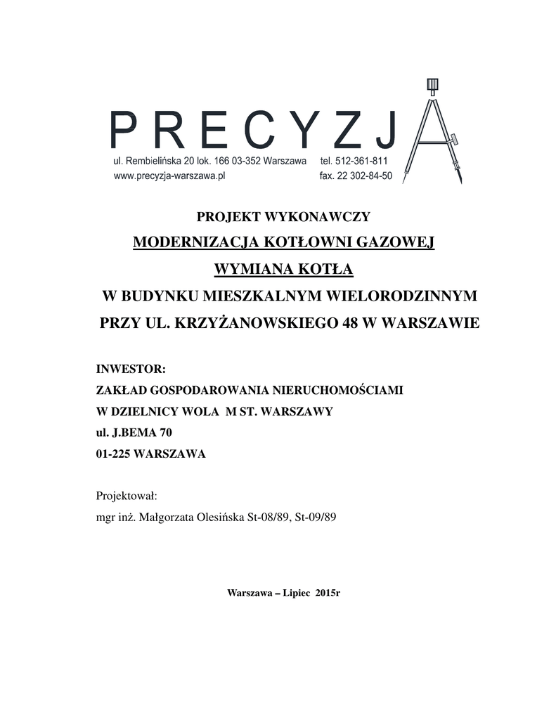 PROJEKT WYKONAWCZY MODERNIZACJA KOTŁOWNI GAZOWEJ WYMIANA KOTŁA W BUDYNKU MIESZKALNYM WIELORODZINNYM PRZY UL. KRZYŻANOWSKIEGO 48 W WARSZAWIE INWESTOR: ZAKŁAD GOSPODAROWANIA NIERUCHOMOŚCIAMI W DZIELNICY WOLA M ST. WARSZAWY ul. J.BEMA 70 01-225 WARSZAWA Projektował: mgr inż. Małgorzata Olesińska St-08/89, St-09/89 Warszawa – Lipiec 2015r ZAWARTOŚĆ OPRACOWANIA I. CZĘŚĆ OPISOWA 1. Opis techniczny + obliczenia + specyfikacja II. CZĘŚĆ RYSUNKOWA Rys. Kot-1 Rzut kotłowni + przekrójRys. Kot 2 Schemat kotłowni III. ZAŁĄCZNIKI Zał. 1- Kopia uprawnień budowlanych projektanta Zał. 2 – Zaświadczenie MOIIB projektanta Zał. 3 – Informacja BIOZ Zał. 4 kocioł gazowy-dane techniczne 2 OPIS TECHNICZNY 1. PODSTAWA OPRACOWANIA • • • • • Zlecenie i Umowa Ustalenia z Zamawiającym PW technologii i automatyki kotłowni opracowany w grudniu 2000r. Inwentaryzacja dla celów projektowych Obowiązujące katalogi, normy i normatywy projektowania 2. CEL I ZAKRES OPRACOWANIA Istniejący kocioł gazowy w kotłowni jest wyeksploatowany i decyzją Inwestora zostaje zastąpiony kaskadą kotłów kondensacyjnych , a technologia kotłowni dostosowany do wymagań obowiązujących dla nowego typu kotłów. Niniejsze opracowanie obejmuje adaptację kotłowni w zakresie technologii i automatyki, do pracy z nowymi kotłami. 3. OPIS STANU ISTNIEJĄCEGO Budynek przy ul. Krzyżanowskiego to czterokondygnacyjny, istniejący budynek mieszkalny podpiwniczony. Źródłem ciepła dla instalacji grzewczych co.+cw. w budynku jest istniejąca kotłownia gazowa zlokalizowana w piwnicy. W kotłowni jest zamontowany kocioł GT306 firmy De Dietrich z nadmuchowym palnikiem gazowym dwustopniowym o mocy 110-140 kW. Obieg wody w instalacji co. zapewniają pompy obiegowe UPE 40-80 -2 szt. w tym 1 szt. rezerwowa. Przygotowanie ciepłej wody użytkowej jest prowadzone w podgrzewaczu pojemnościowym B400-500 firmy De Dietrich. Cyrkulację wody w obiegu kocioł- podgrzewacz zapewnia pompa UPS 40-50F Grundfos- 1szt. Cyrkulację wody w instalacji cw. realizuje pompa cyrkulacyjna typu UP20-45N. Zabezpieczenie kotła przed zbyt niską temperaturą wody na powrocie oraz brakiem przepływu przez kocioł zapewnia pompa mieszająca typu UPSD 32-30F . Kocioł jest wyposażony w automatykę pogodową (konsola Diematic) sterującą pracą jednego obiegu grzewczego z mieszaczem i obiegu ciepłej wody użytkowej, a także sterującą pracą palnika dwustopniowego oraz zabezpieczającą kocioł przed pracą bez wody (SYR 933.1). Odprowadzenie spalin z kotła za pomocą czopucha do komina stalowego z blachy kwasoodpornej typu SM250 SELKIRK o średnicy 178/230mm umieszczonego na zewnątrz budynku na elewacji. Zabezpieczenie instalacji co. systemu zamkniętego zgodnie z PN-B-02414 za pomocą zaworu bezpieczeństwa SYR 1915 Dn32 i naczynia przeponowego Reflex typu A250. Zabezpieczenie podgrzewacza cw. przed wzrostem ciśnienia - zaworem bezpieczeństwa SYR 2115 Dn25 Pmax=6bar. Dla przejęcia przyrostu objętości cw. w czasie podgrzewania zastosowano naczynie przeponowe dla wody typu Reflex-D 40. 3 Kotłownia posiada 2 okna, wentylację grawitacyjną nawiewno-wywiewną [nawiew Z 30x30cm wlot 2m nad terenem i wylot 0,3 m nad posadzką, wywiew trzema kanałami 14x14 cm] i jest odwodniona do kanalizacji za pośrednictwem studni schładzającej z pompą. Wysokość kotłowni 2,5m, powierzchnia 22,8 m3; kubatura 57 m3. Kocioł jest wyeksploatowany i wymaga wymiany, natomiast stan pozostałych urządzeń kotłowni jest zadowalający. 4. DANE WYJŚCIOWE 4.1. Bilans ciepła Centralne ogrzewanie Ciepła woda Qco = 91 kW ( zgodnie z projektem archiwalnym) Qcw max= 67 kW ; Qcw śr = 20 kW 4.2. Instalacja c.o. (zgodnie z pierwotnym projektem kotłowni) - parametry instalacji - 80/60°C - ciśnienie dyspozycyjne - 20 kPa - pojemność zładu 1500 dm3 ( wartość założona przy wskaźniku 15 dm3/kW) 5. OPIS PROJEKTOWANYCH ROZWIĄZAŃ TECHNICZNYCH Modernizowana kotłownia będzie nadal dostarczała ciepło na potrzeby istniejących instalacji co. i instalacji cw. w ilości zgodnej z projektem pierwotnym zapotrzebowanie ciepła nie ulega zmianie. Istniejący obieg kotłowy tj. kocioł gazowy z automatyką, pompą mieszającą, oraz orurowaniem obiegu kotłowego, naczyniem wzbiorczym Reflex, a także czopuch i komin SM250 zostają zdemontowane. Istniejąca automatyka również do demontażu. Wymianie ulegają również skorodowane przewody wody kotłowej w pomieszczeniu. Kotłownia pozostaje w dotychczasowym pomieszczeniu. 5.1. Kotłownia dla c.o. Wymaganą ilość ciepła dla instalacji c.o. dostarczy kaskada dwóch kotłów kondensacyjnych wiszących typu INNOVENS PRO MCA 65. Moc pojedynczego kotła Q=12-61 kW. Łączna moc kaskady 12-122 kW. Kotły będą zmontowane w systemie kaskadowym LV =wolnostojące ( na stelażu). System LV zawiera: -Kotły-2 szt. -Rozdzielacz hydrauliczny -kolektor przyłączeniowy kotła z przewodami przyłączeniowymi zasilania i powrotu, przewód przyłączeniowy gazu i kołnierze -pompy kotłowe-2 szt. -zestaw armatury przyłączeniowej - ramę montażową do montażu na ścianie -czujnik kaskady z gilzą Kotły będą wytwarzały wodę o zmiennych parametrach (max.800C) Obieg grzewczy centralnego ogrzewania tj. pompa obiegowa co. zawór trójdrogowy mieszający, rozdzielacze centralnego ogrzewania pozostają bez zmiany 4 5.2. Kotłownia dla potrzeb c.w. Projektowana kaskada kotłów dostarczy również ciepło dla przygotowania ciepłej wody użytkowej. Wszystkie urządzenia gałęzi cw. w tym pompa obiegu kocioł podgrzewacz, podgrzewacz B400, pompa cyrkulacyjna cw. i zabezpieczenia pozostają bez zmiany. Kotłownia zostanie doposażona w zawór antyskażeniowy EA na wlocie wody zimnej do podgrzewaczy. 5.3. Instalacja spalinowa Kotły będą pobierały powietrze do spalania z pomieszczenia= praca kotłów zależna od powietrza w pomieszczeniu. Odprowadzenie spalin z każdego kotła osobnym przewodem spalinowy