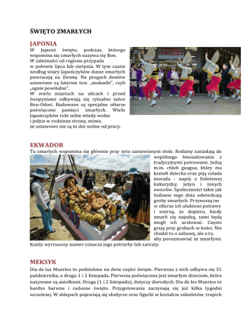 ŚWIĘTO ZMARŁYCH JAPONIA W Japonii święto, podczas, którego wspomina się zmarłych nazywa się Bon. W zależności od regionu przypada w połowie lipca lub sierpnia. W tym czasie według wiary Japończyków dusze zmarłych powracają na Ziemię. Na progach domów ustawiane są latarnie tzw. „mukaebi”, czyli „ognie powitalne”. W wielu miastach na ulicach i przed świątyniami odbywają się rytualne tańce Bon-Odori. Budowane są specjalne ołtarze poświęcone pamięci zmarłych. Wielu Japończyków robi sobie wtedy wolne i jedzie w rodzinne strony, mimo, że ustawowo nie są to dni wolne od pracy. EKWADOR Tu zmarłych wspomina się głównie przy syto zastawionym stole. Rodziny zasiadają do wspólnego biesiadowania z tradycyjnymi potrawami. Jedzą m.in. chleb guagua, który ma kształt dziecka oraz piją colada morada - napój z fioletowej kukurydzy, jeżyn i innych owoców. Społeczności takie jak Indianie tego dnia odwiedzają groby zmarłych. Przynoszą im w ofierze ich ulubione potrawy i wierzą, że dopiero, kiedy zmarli się najedzą, sami będą mogli ich ucztować. Często grają przy grobach w kości. Nie chodzi tu o zabawę, ale o to, aby porozmawiać ze zmarłymi. Każdy wyrzucony numer oznacza jego potrzeby lub zarzuty. MEKSYK Dia de los Muertos to podzielone na dwie części święto. Pierwsza z nich odbywa się 31 października, a druga 1 i 2 listopada. Pierwsza poświęcona jest zmarłym dzieciom, które nazywane są aniołkami. Druga (1 i 2 listopada), dotyczy dorosłych. Dia de los Muertos to bardzo barwne i radosne święto. Przygotowania zaczynają się już kilka tygodni wcześniej. W sklepach pojawiają się słodycze oraz figurki w kształcie szkieletów, trupich czaszek i upiorów przeznaczone do dekoracji lub na prezenty. Domy są sprzątane specjalnie na okazję przyjścia zmarłych. Buduje się powitalne ołtarze, na których stawia się zdjęcie zmarłego, kwiaty, jedzenie i kadzidła. Rodziny odwiedzają również groby zmarłych bliskich, a w niektórych miejscach również na tych grobach biesiadują, często przez całą noc. Jednym z popularniejszych dań w tym dniu jest kurczak w czekoladzie. Na grobach dzieci kładzie się zabawki. HISZPANIA Na grobach zamiast zniczy zapala się elektryczne lampki. Cmentarze odwiedzają przede wszystkim starsze osoby ubrane na czarno. W niektórych miejscach kraju rozpala się ogniska, które mają wskazywać zmarłym drogę do domu i przy których piecze się jadalne kasztany. W Walencji dzień przed Zaduszkami tradycyjnie zapala się w domach świece. W niektórych rejonach Galicji na cmentarzu zjada się pierogi. Niedaleko miasta Teruel do dziś przetrwał zwyczaj napychania się jedzeniem, aby złe duchy miały mniej miejsca do rozgoszczenia się w ciele. Chroniąc się przed demonami mieszkańcy wykładają drogę do sypialni pieczonymi kasztanami, pieką ciastka i polecają się opiece świętego. SŁOWACJA Słowacy w zaduszkową noc stawiają na stole jedzenie. Wierzą, że zmarli, którzy przyjdą odwiedzić ich domy, będą strudzeni i głodni i chętnie się pożywią. USA W Stanach Zjednoczonych obchodzi się Halloween, a właściwie All Hallows Eve (Wieczór Wszystkich Świętych). Zwyczaj ten pochodzi od Celtów i został przeniesiony przez irlandzkich emigrantów na kontynent amerykański. Symbolem jest wydrążona dynia ze świeczką w środku. Głównie dzieci i młodzież tego dnia przebierają się w maski i kostiumy duchów lub wampirów. Tradycją stało się chodzenie od domu do domu z pytaniem „Cukierek albo psikus?”. FILIPINY Na Filipinach 1 listopada jest dniem wolnym od pracy, w którym rodziny udają się na cmentarze. Często ustawiają przy grobach namioty, a same groby dekorują kolorowymi ozdobami. Podobnie jak Meksykańczycy świętują przez całą noc. W kilku regionach całą noc po miastach wędrują tzw. pangangaluluwa, którzy grają i śpiewają w imieniu tych, którzy odeszli.