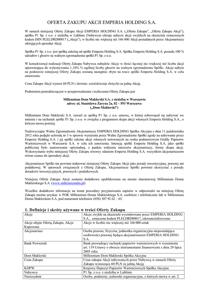 OFERTA ZAKUPU AKCJI EMPERIA HOLDING S.A. W ramach niniejszej Oferty Zakupu Akcji EMPERIA HOLDING S.A. („Oferta Zakupu”, „Oferta Zakupu Akcji”), spółka P1 Sp. z o.o. z siedzibą w Lublinie (Nabywca) oferuje nabycie akcji zwykłych na okaziciela oznaczonych kodem ISIN PLELDRD00017 („Akcje”), w liczbie nie większej niż 166 000 Akcji posiadanych przez Akcjonariuszy oferujących sprzedaż Akcji. Spółka P1 Sp. z o.o. jest spółką zależną od spółki Emperia Holding S.A. Spółka Emperia Holding S.A. posiada 100 % udziałów i głosów na walnym zgromadzeniu spółki P1 Sp. z o.o. W konsekwencji realizacji Oferty Zakupu Nabywca nabędzie Akcje w ilości łącznej nie większej niż liczba akcji uprawniająca do wykonywania 1,10% % ogólnej liczby głosów na walnym zgromadzeniu Spółki. Akcje nabyte na podstawie niniejszej Oferty Zakupu zostaną następnie zbyte na rzecz spółki Emperia Holding S.A. w celu umorzenia. Cena Zakupu Akcji wynosi 60 PLN ( słownie: sześćdziesiąt złotych) za jedną Akcję. Podmiotem pośredniczącym w przeprowadzeniu i rozliczeniu Oferty Zakupu jest Millennium Dom Maklerski S.A. z siedzibą w Warszawie adres: ul. Stanisława Żaryna 2a, 02 – 593 Warszawa („Dom Maklerski”) Millennium Dom Maklerski S.A. zawarł ze spółką P1 Sp. z o.o. umowę, w której zobowiązał się nabywać we imieniu i na rachunek spółki P1 Sp. z o.o. w związku z programem skupu akcji własnych Emperia Holding S.A., o którym mowa poniżej. Nadzwyczajne Walne Zgromadzenie Akcjonariuszy EMPERIA HOLDING Spółka Akcyjna z dnia 11 października 2012 roku podjęło uchwałę nr 3 w sprawie wyrażenia przez Walne Zgromadzenie Spółki zgody na nabywanie przez Emperia Holding S.A. i jej spółki zależne akcji własnych notowanych na rynku podstawowym Giełdy Papierów Wartościowych w Warszawie S.A. w celu ich umorzenia. Intencją spółki Emperia Holding S.A. jako spółki publicznej było zastosowanie optymalnej, z punktu widzenia interesów akcjonariuszy, formy skupu akcji. Wykorzystanie trybu niniejszej Oferty Zakupu stworzy zdaniem Emperia Holding S.A. wszystkim akcjonariuszom równe szanse do sprzedaży akcji. Akcjonariusze Spółki nie powinni traktować niniejszej Oferty Zakupu Akcji jako porady inwestycyjnej, prawnej ani podatkowej. W sprawach związanych z Ofertą Zakupu, Akcjonariusze Spółki powinni skorzystać z porady doradców inwestycyjnych, prawnych i podatkowych. Niniejsza Oferta Zakupu Akcji zostanie dodatkowo opublikowana na stronie internetowej Millennium Domu Maklerskiego S.A. (www.millenniumdm.pl). Wszelkie dodatkowe informacje na temat procedury przyjmowania zapisów w odpowiedzi na niniejszą Ofertę Zakupu można uzyskać w POK Millennium Domu Maklerskiego S.A. osobiście i telefonicznie lub w Millennium Domu Maklerskim S.A. pod numerami telefonów (058) 307 92 62 – 65. 1. Definicje i skróty używane w treści Oferty Zakupu Akcje Akcje objęte Ofertą Zakupu, Akcje Kupowane Akcjonariusz Bank Powiernik Dom Maklerski Cena Zakupu KDPW Nabywca Nierezydent Akcje zwykłe na okaziciela wyemitowane przez EMPERIA HOLDING S.A., oznaczone kodem PLELDRD00017, zdematerializowane Akcje w liczbie nie większej niż 166 000 sztuk Osoba prawna, fizyczna, jednostka organizacyjna nieposiadająca osobowości prawnej będąca akcjonariuszem EMPERIA HOLDING S.A. Bank prowadzący rachunki papierów wartościowych w rozumieniu art. 119 Ustawy o obrocie instrumentami finansowymi z dnia 29 lipca 2005 roku Millennium Dom Maklerski Spółka Akcyjna Cena zakupu Akcji nabywanych przez Nabywcę w ramach Oferty Zakupu wynosząca 60 PLN za jedną Akcję Krajowy Depozyt Papierów Wartościowych Spółka Akcyjna P1 Sp. z o.o. z siedzibą w Lublinie Osoby, podmioty, jednostki organizacyjne, o których mowa w art. 2 Oferta Sprzedaży, Oferta Sprzedaży Akcji Oferta Zakupu, Oferta Zakupu Akcji POK Rezydent Spółka Ustawa Prawo Dewizowe ust. 1 pkt. 2 Ustawy Prawo Dewizowe Oferta sprzedaży Akcji składana przez Akcjonariuszy w odpowiedzi na Ofertę Zakupu Akcji Niniejsza Oferta Zakupu Akcji skierowana do wszystkich Akcjonariuszy Punkt Obsługi Klienta Domu Maklerskiego Osoby, podmioty i jednostki organizacyjne w rozumieniu Ustawy Prawo Dewizowe EMPERIA HOLDING S.A. z siedzibą w Lublinie, ul. Mełgiewska 7-9 Ustawa z dnia 27 lipca 2002 roku Prawo Dewizowe (Dz.U. Nr 141 poz. 1178 z późn. zm.) 2. Harmonogram Oferty Zakupu Otwarcie Oferty Zakupu Akcji oraz rozpoczęcie przyjmowania Ofert Sprzedaży Akcji – 24.03.2014 r. Zamknięcie Oferty Zakupu Akcji oraz zakończenie przyjmowania Ofert Sprzedaży Akcji - 26.03.2014 r. Przewidywany dzień rozliczenia Oferty Zakupu Akcji - 28.03.2014 r. 3. Podmioty uprawnione do sprzedaży Akcji w ramach Oferty Zakupu Akcji Podmiotami uprawnionymi do składania Ofert Sprzedaży Akcji w ramach Oferty Zakupu Akcji są osoby fizyczne osoby prawne, oraz jednostki organizacyjne nieposiadające osobowości prawnej, będące posiadaczami Akcji. 4. Procedura składania Ofert Sprzedaży Akcji Podmioty uprawnione do sprzedaży Akcji w ramach Oferty Zakupu Akcji mogą składać Oferty Sprzedaży Akcji w POK Domu Maklerskiego wymienionych w załączniku nr 3 do Oferty Zakupu, w okresie trwania Oferty Zakupu, w dni robocze od poniedziałku do piątku, w godzinach pracy POK. Podmiot uprawniony do sprzedaży Akcji w ramach Oferty Zakupu powinien dokonać w POK następujących czynności: 1. 2. Złożyć w POK, wypełniony w trzech egzemplarzach formularz Oferty Sprzedaży Akcji, którego wzór stanowi załącznik nr 1 do Oferty Zakupu, po jednym dla Akcjonariusza składającego Ofertę Sprzedaży Akcji, Nabywcy oraz Domu Maklerskiego. Złożyć w POK oryginał świadectwa depozytowego wydanego przez podmiot prowadzący rachunek papierów wartościowych Akcjonariusza potwierdzającego: - dokonanie blokady Akcji do dnia rozliczenia Oferty Zakupu Akcji (przewidywany dzień rozliczenia to 28.03.2014r.), oraz - wydanie nieodwołalnej dyspozycji wystawieni