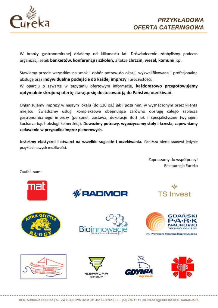 W branży gastronomicznej działamy od kilkunastu lat. Doświadczenie zdobyliśmy podczas organizacji setek bankietów, konferencji i szkoleń, a także chrzcin, wesel, komunii itp. Stawiamy przede wszystkim na smak i dobór potraw do okazji, wykwalifikowaną i profesjonalną obsługę oraz indywidualne podejście do każdej imprezy i uroczystości. W oparciu o zawarte w zapytaniu ofertowym informacje, każdorazowo przygotowujemy optymalnie skrojoną ofertę starając się dostosować ją do Państwu oczekiwań. Organizujemy imprezy w naszym lokalu (do 120 os.) jak i poza nim, w wyznaczonym przez klienta miejscu. Świadczmy usługi kompleksowe obejmujące zarówno obsługę całego zaplecza gastronomicznego imprezy (personel, zastawa, dekoracje itd.) jak i specjalistyczne (wynajem kucharza bądź obsługi kelnerskiej). Dowozimy potrawy, wypożyczamy stoły i krzesła, zapewniamy zadaszenie w przypadku imprez plenerowych. Jesteśmy elastyczni i otwarci na wszelkie sugestie i oczekiwania. Poniższa oferta stanowi jedynie przykład naszych możliwości. Zapraszamy do współpracy! Restauracja Eureka Zaufali nam: PRZERWA KAWOWA - propozycje Propozycja I • • • Kawa z ekspresów przelewowych Herbata w termosie Woda w dzbankach z cytryną CENA: 7 zł/osoba Propozycja II • • • • Kruche ciasteczka Kawa z ekspresów przelewowych Herbata w termosie Woda w dzbankach z cytryną CENA: 10 zł/osoba Propozycja III • • • • • • Ciastka koktajlowe (2 rodzaje) Kruche ciasteczka Kawa z ekspresów przelewowych Herbata w termosie Soki owocowe w dzbankach Woda w dzbankach z cytryną CENA: 16 zł/osoba Propozycja IV • • • • • • Ciasta domowe (2 rodzaje) Kruche ciasteczka Kawa z ekspresów przelewowych Herbata w termosie Soki owocowe w dzbankach Woda w dzbankach z cytryną CENA: 18 zł/osoba *Niniejsza oferta stanowi propozycję. W przypadku innych oczekiwań prosimy o ewentualne sugestie i uwagi. Wszystkie podane ceny są cenami netto. LUNCH – propozycje (Wszystko podane w formie bufetów na stołach szwedzkich z obrusami, dekoracją i pełną zastawą bankietową) Propozycja I • • • • • • Rosół z makaronem Potrawka z kurczaka na słodko-pikantno z warzywami Ryż Surówka Soki owocowe w dzbankach Woda w dzbankach z cytryną Inne zupy do wyboru: Pomidorowa z ryżem lub makaronem, Kapuśniak, Barszcz czerwony z warzywami Inne II dania do wyboru: Makaron w szpinaku z grillowanym kurczakiem, Pulpeciki w sosie pomidorowym, Pilaw z wieprzowiną i warzywami, Kotlety mielone w sosie pieczarkowym, Wątróbka z jabłkiem i cebulą, Pyzy z mięsem i okrasą, Baba ziemniaczana z sosem CENA: 27 zł/osoba Propozycja II • • • • • • • Krem paprykowo-pomidorowy z grzankami Karkówka w sosie z czerwonej cebuli Ziemniaki gotowane Surówka Warzywa blanszowane Soki owocowe w dzbankach Woda w dzbankach z cytryny Inne zupy do wyboru: Cebulowa z grzankami, Fasolowa, Ogórkowa, Pieczarkowa, Barszcz ukraiński, Kalafiorowa, Jarzynowa Inne II dania do wyboru: Lasagne Bolognese z sosem pomidorowym, Kotleciki wieprzowo-wołowe w sosie pieczarkowym Fileciki z indyka grillowane w sosie cytrynowo-maślanym, Filet z dorsza w kremie pomidorowym, Luzowane pieczone udka z kurczaka, Pulpeciki rybne z sosem koperkowym CENA: 32 zł/osoba *Niniejsza oferta stanowi propozycję. W przypadku innych oczekiwań prosimy o ewentualne sugestie i uwagi. Wszystkie podane ceny są cenami netto. Propozycja III • • • • • • • Minestrone włoska zupa jarzynowa Roladka z indyka z fetą i szpinakiem w sosie winno-śmietanowym Ryż z warzywami Warzywa blanszowane Surówki Soki owocowe w dzbankach Woda w dzbankach z cytryną Inne zupy do wyboru: Żur z białą kiełbasą, Krem z brokuł z groszkiem ptysiowym, Cygańska na wieprzowinie z kiełbasą i pomidorami, Krem z leśnych grzybów z makaronem Stelline, Krem ziemniaczany z prażoną cebulką, bekonem i szczypiorkiem Inne II dania do wyboru: Limanda na szpinaku z sosem ziołowym, Szynka w sosie żurawinowym, Eskalopki wieprzowe w sosie winno-śmietanowym, Filet z indyka w sosie pieczeniowym, Lasagne szpinakowa z sosem pieczarkowym, Żeberka pieczone, Schab w sosie myśliwskim, Roladki drobiowe z fetą, rukolą i suszonymi pomidorami w sosie ziołowym CENA: 39 zł/osoba Propozycja III • • • • • • • • Bogracz z karkówki Polędwiczki wieprzowe w sosie z leśnych grzybów Ziemniaki gratin Mix sałat z winegret Warzywa blanszowane Surówki Soki owocowe w dzbankach Woda w dzbankach z cytryną Inne zupy do wyboru: Wyborna zupa grzybowa z kluseczkami, Krem z cukinii z migdałami i słonecznikiem, Krem z dyni z pistacjami, Rybna z łososiem w pomidorach, Chłodnik Gazpacho Inne II dania do wyboru: Schab w sosie śliwkowym, Łosoś w sosie krewetkowym, Sandacz w porach, Łosoś w sosie kaparowym, Polędwiczki wieprzowe w sosie śliwkowym, Roladki drobiowe z fetą, rukolą i suszonymi pomidorami w sosie ziołowym CENA: 48 zł/osoba *Niniejsza oferta stanowi propozycję. W przypadku innych oczekiwań prosimy o ewentualne sugestie i uwagi. Wszystkie podane ceny są cenami netto. PRZERWA ZAKĄSKOWA – propozycje (Wszystko podane w formie bufetów na stołach szwedzkich z obrusami, dekoracją i pełną zastawą bankietową. Cena obejmuje jedną przerwę do 30 min) Propozycja I • • • • • • Tartinki rozmaite z chleba ziarnistego i pszennego z serem, salami i brie z musami krewetkowym i warzywnym na sałatach Łódeczki warzywne z rozmaitymi pastami i kiełkami Kawa z ekspresów przelewowych Herbata w termosie Soki owocowe w dzbankach Woda w dzbankach z cytryną CENA: 23 zł/os Propozycja II • • • • • • • • • Tartinki rozmaite z chleba ziarnistego i pszennego z serem, salami i brie z musami krewetkowym i warzywnym na sałatach Frankfuterki w cieście francuskim oprószone oregano Vol-a-venty z fetą i szpinakiem Ogniste skrzydełka Placuszki ziemniaczane z musem koperkowym Kawa z ekspresów przelewowych Her