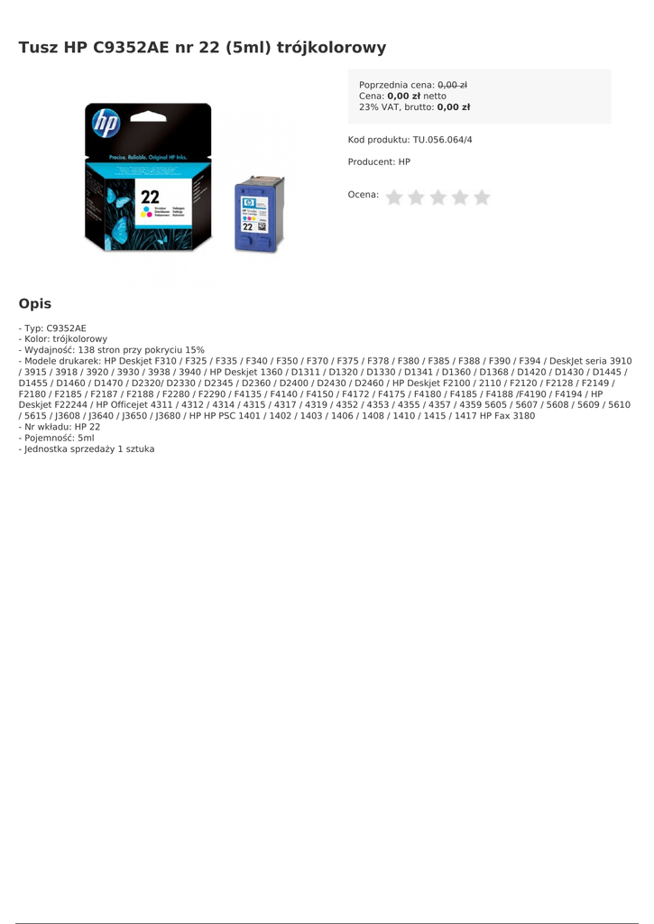 Tusz HP C9352AE nr 22 (5ml) trójkolorowy Poprzednia cena: 0,00 zł Cena: 0,00 zł netto 23% VAT, brutto: 0,00 zł Kod produktu: TU.056.064/4 Producent: HP Ocena: Opis - Typ: C9352AE - Kolor: trójkolorowy - Wydajność: 138 stron przy pokryciu 15% - Modele drukarek: HP Deskjet F310 / F325 / F335 / F340 / F350 / F370 / F375 / F378 / F380 / F385 / F388 / F390 / F394 / DeskJet seria 3910 / 3915 / 3918 / 3920 / 3930 / 3938 / 3940 / HP Deskjet 1360 / D1311 / D1320 / D1330 / D1341 / D1360 / D1368 / D1420 / D1430 / D1445 / D1455 / D1460 / D1470 / D2320/ D2330 / D2345 / D2360 / D2400 / D2430 / D2460 / HP Deskjet F2100 / 2110 / F2120 / F2128 / F2149 / F2180 / F2185 / F2187 / F2188 / F2280 / F2290 / F4135 / F4140 / F4150 / F4172 / F4175 / F4180 / F4185 / F4188 /F4190 / F4194 / HP Deskjet F22244 / HP Officejet 4311 / 4312 / 4314 / 4315 / 4317 / 4319 / 4352 / 4353 / 4355 / 4357 / 4359 5605 / 5607 / 5608 / 5609 / 5610 / 5615 / J3608 / J3640 / J3650 / J3680 / HP HP PSC 1401 / 1402 / 1403 / 1406 / 1408 / 1410 / 1415 / 1417 HP Fax 3180 - Nr wkładu: HP 22 - Pojemność: 5ml - Jednostka sprzedaży 1 sztuka Powered by TCPDF (www.tcpdf.org)