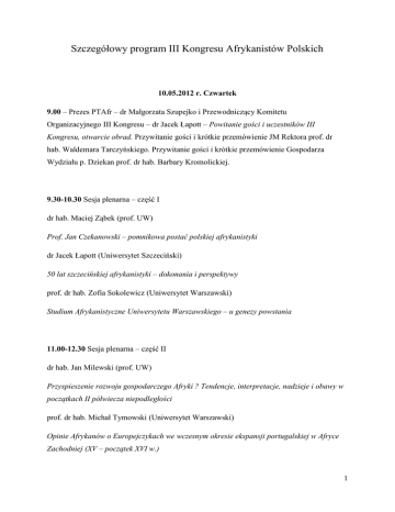 Szczegółowy program III Kongresu Afrykanistów Polskich 10.05.2012 r. Czwartek 9.00 – Prezes PTAfr – dr Małgorzata Szupejko i Przewodniczący Komitetu Organizacyjnego III Kongresu – dr Jacek Łapott – Powitanie gości i uczestników III Kongresu, otwarcie obrad. Przywitanie gości i krótkie przemówienie JM Rektora prof. dr hab. Waldemara Tarczyńskiego. Przywitanie gości i krótkie przemówienie Gospodarza Wydziału p. Dziekan prof. dr hab. Barbary Kromolickiej. 9.30-10.30 Sesja plenarna – część I dr hab. Maciej Ząbek (prof. UW) Prof. Jan Czekanowski – pomnikowa postać polskiej afrykanistyki dr Jacek Łapott (Uniwersytet Szczeciński) 50 lat szczecińskiej afrykanistyki – dokonania i perspektywy prof. dr hab. Zofia Sokolewicz (Uniwersytet Warszawski) Studium Afrykanistyczne Uniwersytetu Warszawskiego – u genezy powstania 11.00-12.30 Sesja plenarna – część II dr hab. Jan Milewski (prof. UW) Przyspieszenie rozwoju gospodarczego Afryki ? Tendencje, interpretacje, nadzieje i obawy w początkach II półwiecza niepodległości prof. dr hab. Michał Tymowski (Uniwersytet Warszawski) Opinie Afrykanów o Europejczykach we wczesnym okresie ekspansji portugalskiej w Afryce Zachodniej (XV – początek XVI w.) 1 dyskusja: 11.40-12.30 14.00-15.30 Referaty w grupach (4 grupy równoległe) Grupa 1 dr Beata Wójtowicz (Uniwersytet Warszawski) Polski wkład w historię leksykografii suahili red. Krzysztof Dubiński (Warszawa) Tonio Trzebinski – „Nowy Dziki” z Nairobi dr Małgorzata Szupejko (Instytut Kultur Śródziemnomorskich i Orientalnych PAN, Warszawa) Tożsamość a media w Afryce – studium kenijskie mgr Marta Jackowska (Uniwersytet Warszawski) Etos tuareski wczoraj i dziś Grupa 2 prof. dr hab. Elżbieta Rekłajtis (Instytut Kultur Śródziemnomorskich i Orientalnych, PAN) Wybory parlamentarne w Algierii (10.05.2012) w przededniu 50. rocznicy niepodległości dr Rafał Wiśniewski (Uniwersytet Kardynała Stefana Wyszyńskiego w Warszawie) Ruchy społeczno-kulturowe w Afryce Północnej w paradygmacie teorii dyskursów dr Lilianna Wdowiak (Pomorski Uniwersytet Medyczny), dr hab. n. med. Mirosław Parafiniuk (prof. PUM) Tradycyjne sposoby leczenia chorób oczu w Afryce Północnej mgr Wojciech Spirewski (Uniwersytet Mikołaja Kopernika w Toruniu) Polska wobec przemian w Afryce Północnej (2010-2012) Grupa 3 2 dr Margot Stańczyk-Minkiewicz (Akademia Marynarki Wojennej w Gdyni) Upadłość państw Afryki Subsaharyjskiej a przestrzeganie praw człowieka w regionie mgr Monika Różalska (Uniwersytet Jagielloński) Zaangażowanie Chińskiej Republiki Ludowej w działania pokojowe w Afryce Subsaharyjskiej ambasador Wojciech Jasiński (Instytut Afrykański w Łodzi) Meandry demokratyzacji w Afryce; na przykładzie Kenii 2002-2012 mgr Joanna Mormul (Uniwersytet Jagielloński) Afrykańskie success story? Przemiany polityczne i gospodarcze w Mozambiku po zakończeniu wojny domowej Grupa 4 mgr Henryk Paner (Muzeum Archeologiczne w Gdańsku) Projekt Bayuda. Archeologia obszarów pustynnych mgr Marta Kolbusz (Warszawa) Badania nad podgłówkami kobiecymi w Dolinie Omo mgr Wawrzyniec Kolbusz (Warszawa) W poszukiwaniu utraconej autentyczności, z podgłówkami afrykańskimi w tle 16.00-17.00 Referaty w grupach (4 grupy równoległe) Grupa 1 mgr Anna Bytyń-Buchajczyk (Uniwersytet Szczeciński) Ghana - Brandenburskie i europejskie pozostałości na Złotym Wybrzeżu dr hab. Michał Leśniewski (Uniwersytet Warszawski) Od rodzinnego klanu do państwa. O narodzinach kapitanatów Griqua w dolinie rzeki Oranje, 1780-1840 3 dr Paweł Oziębło (Łuków) Hajota, Rogoziński i „Fanny Po ladies”, czyli krótki szkic na temat związku pomiędzy demografią i obyczajowością na Fernando Poo, u schyłku XIX wieku. Grupa 2 dr hab. Marek Pawełczak (Uniwersytet Warszawski) Kilka uwag na temat globalizacji Afryki Wschodniej w XIX w. dr Hanna Rubinkowska-Anioł (Uniwersytet Warszawski) Architektura władzy – tymczasowe konstrukcje architektoniczne wzniesione z okazji koronacji cesarzowej Zeuditu (1917) i cesarza Hajle Syllasje I (1930) jako symbol nowych czasów dr Anna Nadolska-Styczyńska (Uniwersytet Mikołaja Kopernika w Toruniu) Jerzy Giżycki – afrykanista zapomniany Grupa 3 dr hab. Robert Kłosowicz (Uniwersytet Jagielloński) Etiopia – wyspa stabilności w Rogu Afryki czy tylko najmniej dysfunkcyjne państwo regionu? dr Sylwia Kulczyk (Uniwersytet Warszawski) Uwarunkowania rozwoju turystyki w krajach Sahelu; przykłady z Mali, Nigru i Burkina Faso dr Andrzej Polus (Uniwersytet Wrocławski) Diamentowa demokracja? Ewolucja reżimu politycznego Botswany Grupa 4 dr Dominik Kopiński (Uniwersytet Wrocławski) Zjawisko „nacjonalizmu surowcowego” na przykładzie Zambii dr Marta Nowakowska (Wrocław) Bieda w kontekście społeczno-politycznym. Sytuacja białej biedoty w RPA mgr Marcin Nowik (Uniwersytet Ekonomiczny we Wrocławiu) 4 Pomoc rozwojowa – wkład Indii 17.00 Prezentacja projektu „Afryka Nowaka” 11.05.2012 r. Piątek 9.00-10.30 Referaty w grupach (3 grupy równoległe) Grupa 1 dr Kinga Lendzion (Uniwersytet Kardynała Stefana Wyszyńskiego w Warszawie) Madagaskar – perspektywy rozwoju na początku XXI wieku mgr Krzysztof Tlałka (Uniwersytet Jagielloński) Implikacje projektu infrastrukturalnego LAPSSET dla Afryki Wschodniej i Środkowej dr Jerzy Gilarowski (Almamer Szkoła Wyższa, Warszawa)/University of Dodoma, Tanzania) Wpływ parków transgranicznych na rozwój społeczno-gospodarczy państw Afryki Subsaharyjskiej mgr Dariusz Skonieczko (Państwowe Muzeum Etnograficzne w Warszawie) Wyspa Lamu w obliczu zmian związanych z budową nowego portu Grupa 2 dr Renata Diaz-Szmidt (Uniwersytet Warszawski) Podmiot kulturowy według koncepcji Edmonda Crosa wobec doświadczenia dyktatury w „Mocy burzy” Donato Ndongo Bidyogi z Gwinei Równikowej – analiza postaci głównego bohatera mgr Jakub Kościółek (Uniwersytet Jagielloński) Władza i przywództwo w 