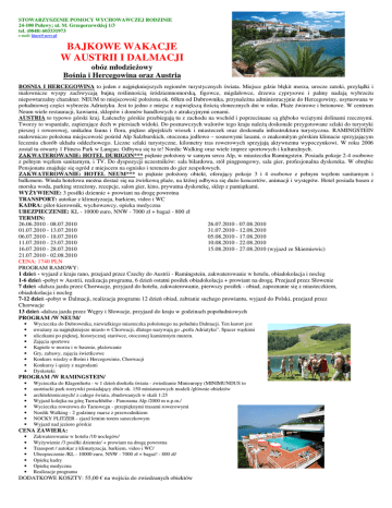 STOWARZYSZENIE POMOCY WYCHOWAWCZEJ RODZINIE 24-100 Puławy; ul. M. Grzegorzewskiej 1/3 tel. (0048) 603331973 e-mail: [email protected] BAJKOWE WAKACJE W AUSTRII I DALMACJI obóz młodzieżowy Bośnia i Hercegowina oraz Austria BOSNIA I HERCEGOWINA to jeden z najpiękniejszych regionów turystycznych świata. Miejsce gdzie błękit morza, urocze zatoki, przylądki i malownicze wyspy zachwycają bujną roślinnością śródziemnomorską, figowce, migdałowce, drzewa cyprysowe i palmy nadają wybrzeżu niepowtarzalny charakter. NEUM to miejscowość położona ok. 60km od Dubrownika, przynależna administracyjnie do Hercegowiny, usytuowana w południowej części wybrzeża Adriatyku. Jest to jedno z miejsc z największą ilością słonecznych dni w roku. Plaże żwirowe i betonowe. W centrum Neum wiele restauracji, kawiarni, sklepów i domów handlowych z atrakcyjnymi cenami. AUSTRIA to typowo górski kraj. Łańcuchy górskie przebiegają tu z zachodu na wschód i poprzecinane są głęboko wciętymi dolinami rzecznymi. Tworzy to wspaniałe, zapierające dech w piersiach widoki. Do poznawczych walorów tego kraju należą doskonale przygotowane szlaki do turystyki pieszej i rowerowej, unikalna fauna i flora, piękno alpejskich wiosek i miasteczek oraz doskonała infrastruktura turystyczna. RAMINGSTEIN malowniczo położona miejscowość pośród Alp Salzburskich, otoczona jodłowo – sosnowymi lasami, o znakomitym górskim klimacie sprzyjającym leczeniu chorób układu oddechowego. Liczne szlaki turystyczne, kilometry tras rowerowych sprzyjają aktywnemu wypoczynkowi. W roku 2006 został tu otwarty 1 Fitness Park w Lungau. Odbywa się tu te! Nordic Walking oraz wiele imprez sportowych i kulturalnych. ZAKWATEROWANIE: HOTEL DURIGON*** pięknie położony w samym sercu Alp, w miasteczku Ramingstein. Posiada pokoje 2-4 osobowe z pełnym węzłem sanitarnym, i TV. Do dyspozycji uczestników: sala bilardowa, stół pingpongowy, sala gier, profesjonalna dyskoteka. W obrębie Pensjonatu znajduje się ogród z miejscem na ognisko i terenem do gier zespołowych. ZAKWATEROWANIE: HOTEL NEUM*** to pięknie położony obiekt, oferujący pokoje 3 i 4 osobowe z pełnym węzłem sanitarnym i balkonem. Winda hotelowa można dostać się na żwirkową plaże, na której odbywa się dużo koncertów, animacji i występów. Hotel posiada basen z morska woda, parking strzeżony, recepcje, salon gier, kino, prywatna dyskotekę, sklep z pamiątkami. WYŻYWIENIE: 3 posiłki dziennie + prowiant na drogę powrotna TRANSPORT: autokar z klimatyzacja, barkiem, video i WC KADRA: pilot-kierownik, wychowawcy, opieka medyczna UBEZPIECZENIE: KL - 10000 euro, NNW - 7000 zł + bagaż - 800 zł TERMIN: 26.07.2010 - 07.08.2010 26.06.2010 - 08.07.2010 01.07.2010 - 13.07.2010 31.07.2010 - 12.08.2010 05.08.2010 - 17.08.2010 06.07.2010 - 18.07.2010 11.07.2010 - 23.07.2010 10.08.2010 - 22.08.2010 15.08.2010 - 27.08.2010 (wyjazd ze Skierniewic) 16.07.2010 - 28.07.2010 21.07.2010 - 02.08.2010 CENA: 1740 PLN PROGRAM RAMOWY: 1 dzień - wyjazd z kraju rano, przejazd przez Czechy do Austrii - Ramingstein, zakwaterowanie w hotelu, obiadokolacja i nocleg 1-6 dzień -pobyt w Austrii, realizacja programu, 6 dzień ostatni posiłek obiadokolacja + prowiant na drogę. Przejazd przez Słowenie 7 dzień -dalsza jazda przez Chorwacje, przyjazd do hotelu, zakwaterowanie, pierwszy posiłek - obiad, zapoznanie się z miasteczkiem, obiadokolacja i nocleg 7-12 dzień -pobyt w Dalmacji, realizacja programu 12 dzień obiad, zabranie suchego prowiantu, wyjazd do Polski, przejazd przez Chorwacje 13 dzień -dalsza jazda przez Węgry i Słowacje, przyjazd do kraju w godzinach popołudniowych PROGRAM /W NEUM/ • • • • • • • • • Wycieczka do Dubrownika, niewielkiego miasteczka położonego na południu Dalmacji. Ten kurort jest uważany za najpiękniejsze miasto w Chorwacji, dlatego nazywają go „perła Adriatyku”. Spacer wąskimi uliczkami po pięknej, historycznej starówce, otoczonej kamiennym murem. Zajęcia sportowe Kąpiele w morzu i w basenie, plażowanie Gry, zabawy, zajęcia świetlicowe Konkurs wiedzy o Bośni i Hercegowinie, Chorwacji Konkursy i quizy z nagrodami Dyskoteki PROGRAM /W RAMINGSTEIN/ • • • • • • • • Wycieczka do Klagenfurtu - w 1 dzień dookoła świata - zwiedzanie Minieuropy (MINIMUNDUS to austriacki park rozrywki posiadający zbiór ok. 150 miniaturowych modeli /głównie obiektów architektonicznych/ z całego świata, zbudowanych w skali 1:25 Wyjazd kolejka na górę Turrachhöhe - Panorama Alp /2000 m n.p.m./ Wycieczka rowerowa do Tamswegu - przepięknymi trasami rowerowymi Nordik Walking - 2 godzinny marsz z przewodnikiem NOCKY FLITZER - zjazd letnim torem saneczkowym Wyjazd nad jezioro górskie CENA ZAWIERA: • • • • • • • Zakwaterowanie w hotelu /10 noclegów/ Wyżywienie /3 posiłki dziennie/ + prowiant na drogę powrotna Transport / autokar z klimatyzacja, barkiem, video i WC/ Ubezpieczenie /KL - 10000 euro, NNW - 7000 zł + bagaż! - 800 zł/ Opiekę kadry Opiekę medyczna Realizacje programu DODATKOWE KOSZTY: 55,00 € na wejścia do zwiedzanych obiektów