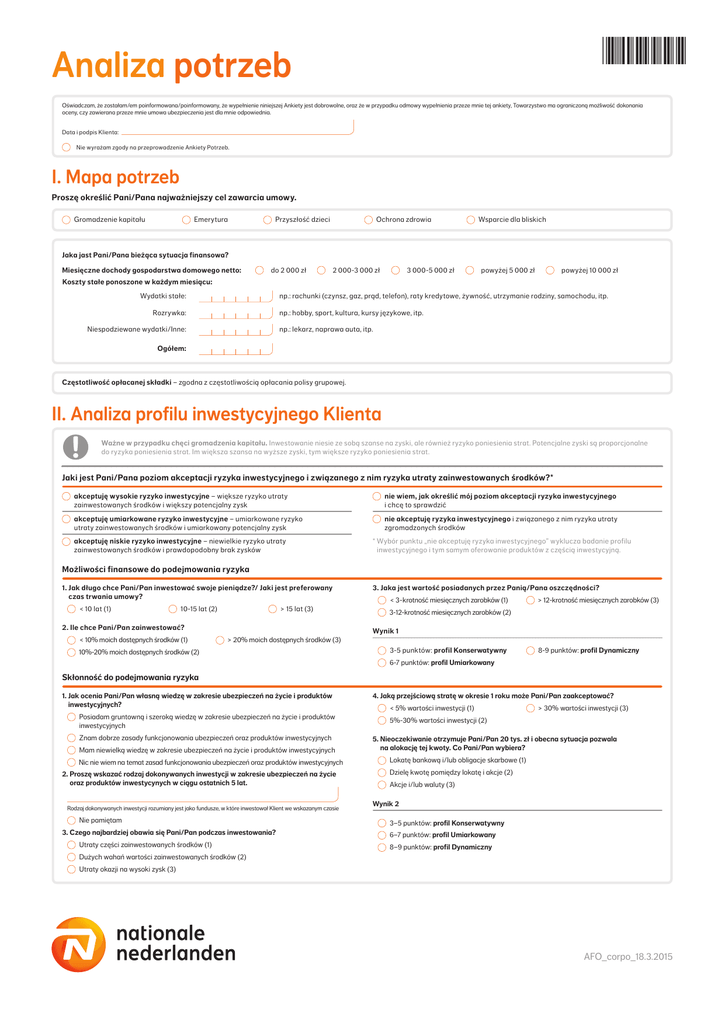 *Q080* Analiza potrzeb Oświadczam, że zostałam/em poinformowana/poinformowany, że wypełnienie niniejszej Ankiety jest dobrowolne, oraz że w przypadku odmowy wypełnienia przeze mnie tej ankiety, Towarzystwo ma ograniczoną możliwość dokonania oceny, czy zawierana przeze mnie umowa ubezpieczenia jest dla mnie odpowiednia. Data i podpis Klienta: Nie wyrażam zgody na przeprowadzenie Ankiety Potrzeb. I. Mapa potrzeb Proszę określić Pani/Pana najważniejszy cel zawarcia umowy. Gromadzenie kapitału Emerytura Przyszłość dzieci Ochrona zdrowia Wsparcie dla bliskich Jaka jast Pani/Pana bieżąca sytuacja finansowa? Miesięczne dochody gospodarstwa domowego netto: do 2 000 zł 2 000-3 000 zł 3 000-5 000 zł powyżej 5 000 zł powyżej 10 000 zł Koszty stałe ponoszone w każdym miesiącu: Wydatki stałe: np.: rachunki (czynsz, gaz, prąd, telefon), raty kredytowe, żywność, utrzymanie rodziny, samochodu, itp. Rozrywka: np.: hobby, sport, kultura, kursy językowe, itp. Niespodziewane wydatki/Inne: np.: lekarz, naprawa auta, itp. Ogółem: Częstotliwość opłacanej składki – zgodna z częstotliwością opłacania polisy grupowej. II. Analiza profilu inwestycyjnego Klienta Ważne w przypadku chęci gromadzenia kapitału. Inwestowanie niesie ze sobą szanse na zyski, ale również ryzyko poniesienia strat. Potencjalne zyski są proporcjonalne do ryzyka poniesienia strat. Im większa szansa na wyższe zyski, tym większe ryzyko poniesienia strat. Jaki jest Pani/Pana poziom akceptacji ryzyka inwestycyjnego i związanego z nim ryzyka utraty zainwestowanych środków?* akceptuję wysokie ryzyko inwestycyjne – większe ryzyko utraty zainwestowanych środków i większy potencjalny zysk n ie wiem, jak określić mój poziom akceptacji ryzyka inwestycyjnego i chcę to sprawdzić akceptuję umiarkowane ryzyko inwestycyjne – umiarkowane ryzyko utraty zainwestowanych środków i umiarkowany potencjalny zysk n ie akceptuję ryzyka inwestycyjnego i związanego z nim ryzyka utraty zgromadzonych środków akceptuję niskie ryzyko inwestycyjne – niewielkie ryzyko utraty zainwestowanych środków i prawdopodobny brak zysków * Wybór punktu „nie akceptuję ryzyka inwestycyjnego” wyklucza badanie profilu inwestycyjnego i tym samym oferowanie produktów z częścią inwestycyjną. Możliwości finansowe do podejmowania ryzyka 1. J ak długo chce Pani/Pan inwestować swoje pieniądze?/ Jaki jest preferowany czas trwania umowy? < 10 lat (1) 10-15 lat (2) > 15 lat (3) 2. Ile chce Pani/Pan zainwestować? < 10% moich dostępnych środków (1) 3. J aka jest wartość posiadanych przez Panią/Pana oszczędności? < 3-krotność miesięcznych zarobków (1) > 12-krotność miesięcznych zarobków (3) 3-12-krotność miesięcznych zarobków (2) Wynik 1 > 20% moich dostępnych środków (3) 10%-20% moich dostępnych środków (2) 3-5 punktów: profil Konserwatywny 8-9 punktów: profil Dynamiczny 6-7 punktów: profil Umiarkowany Skłonność do podejmowania ryzyka 1. Jak ocenia Pani/Pan własną wiedzę w zakresie ubezpieczeń na życie i produktów inwestycyjnych? Posiadam gruntowną i szeroką wiedzę w zakresie ubezpieczeń na życie i produktów inwestycyjnych Znam dobrze zasady funkcjonowania ubezpieczeń oraz produktów inwestycyjnych Mam niewielką wiedzę w zakresie ubezpieczeń na życie i produktów inwestycyjnych Nic nie wiem na temat zasad funkcjonowania ubezpieczeń oraz produktów inwestycyjnych 2. Proszę wskazać rodzaj dokonywanych inwestycji w zakresie ubezpieczeń na życie oraz produktów inwestycynych w ciągu ostatnich 5 lat. Rodzaj dokonywanych inwestycji rozumiany jest jako fundusze, w które inwestował Klient we wskazanym czasie Nie pamiętam 3. C zego najbardziej obawia się Pani/Pan podczas inwestowania? Utraty części zainwestowanych środków (1) 4. Jaką przejściową stratę w okresie 1 roku może Pani/Pan zaakceptować? < 5% wartości inwestycji (1) > 30% wartości inwestycji (3) 5%-30% wartości inwestycji (2) 5. Nieoczekiwanie otrzymuje Pani/Pan 20 tys. zł i obecna sytuacja pozwala na alokację tej kwoty. Co Pani/Pan wybiera? Lokatę bankową i/lub obligacje skarbowe (1) Dzielę kwotę pomiędzy lokatę i akcje (2) Akcje i/lub waluty (3) Wynik 2 3–5 punktów: profil Konserwatywny 6–7 punktów: profil Umiarkowany 8–9 punktów: profil Dynamiczny Dużych wahań wartości zainwestowanych środków (2) Utraty okazji na wysoki zysk (3) AFO_corpo_18.3.2015 Pani/Pana końcowy profil inwestycyjny*: Rekomendowane dla Pani/Pana fundusze inwestycyjne: Konserwatywny Fundusze niskiego ryzyka Umiarkowany Fundusze średniego i niskiego ryzyka Dynamiczny Fundusze wysokiego, średniego i niskiego ryzyka * Wybieramy niższy wynik z dwóch części ankiety. Przykład: Wynik 1 – profil Dynamiczny (8 pkt) Wynik 2 – profil Umiarkowany (6 pkt) Końcowy profil inwestycyjny – profil Umiarkowany Wybieram fundusze zgodne z moim profilem inwestycyjnym Jeśli NIE, decyduję się na: Tak Fundusze niskiego ryzyka Nie Fundusze średniego ryzyka Fundusze wysokiego ryzyka Jestem świadoma/y, że mój wybór funduszy nie odpowiada mojemu profilowi inwestycyjnemu. Akceptuję ryzyko związane z wyborem funduszy bardziej ryzykownych niż rekomendowane przez Nationale-Nederlanden. Nie decyduję się na produkt inwestycyjny Data i podpis Klienta Opis profilu Konserwatywny Akceptuje Pani/Pan ryzyko na niskim poziomie. Bezpieczeństwo środków jest dla Pani/Pana ważniejsze niż możliwość uzyskania dodatkowych zysków. Odpowiednia dla Pani/Pana jest strategia inwestycyjna oparta o fundusze niskiego ryzyka. Umiarkowany Akceptuje Pani/Pan wahania wartości inwestycji podczas jej trwania. Rozumie Pani/Pan, że inwestowanie wiąże się z ryzykiem i może je Pani/Pan zaakceptować, jeśli otwiera to szanse na większe zyski, ale nie za wszelką cenę. Oczekuje Pani/Pan, że będzie Pani/Pan w stanie zrekompensować ewentualne straty (na ograniczonym poziomie). Odpowiednia dla Pani/Pana jes