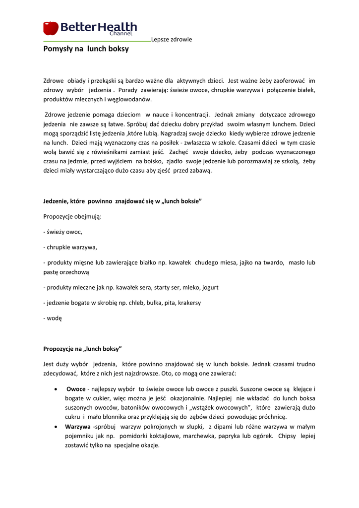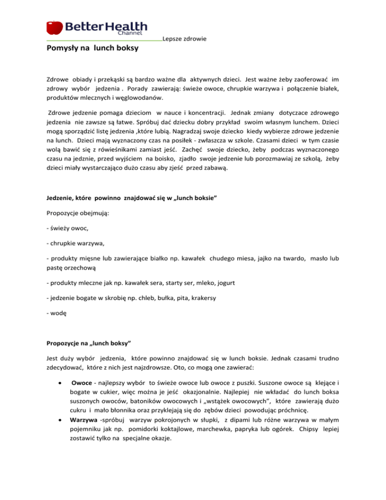 Lepsze zdrowie Pomysły na lunch boksy Zdrowe obiady i przekąski są bardzo ważne dla aktywnych dzieci. Jest ważne żeby zaoferować im zdrowy wybór jedzenia . Porady zawierają: świeże owoce, chrupkie warzywa i połączenie białek, produktów mlecznych i węglowodanów. Zdrowe jedzenie pomaga dzieciom w nauce i koncentracji. Jednak zmiany dotyczace zdrowego jedzenia nie zawsze są łatwe. Spróbuj dać dziecku dobry przykład swoim własnym lunchem. Dzieci mogą sporządzić listę jedzenia ,które lubią. Nagradzaj swoje dziecko kiedy wybierze zdrowe jedzenie na lunch. Dzieci mają wyznaczony czas na posiłek ‐ zwłaszcza w szkole. Czasami dzieci w tym czasie wolą bawić się z rówieśnikami zamiast jeść. Zachęć swoje dziecko, żeby podczas wyznaczonego czasu na jedznie, przed wyjściem na boisko, zjadło swoje jedzenie lub porozmawiaj ze szkolą, żeby dzieci miały wystarczająco dużo czasu aby zjeść przed zabawą. Jedzenie, które powinno znajdować się w „lunch boksie” Propozycje obejmują: ‐ świeży owoc, ‐ chrupkie warzywa, ‐ produkty mięsne lub zawierające białko np. kawałek chudego miesa, jajko na twardo, masło lub pastę orzechową ‐ produkty mleczne jak np. kawałek sera, starty ser, mleko, jogurt ‐ jedzenie bogate w skrobię np. chleb, bułka, pita, krakersy ‐ wodę Propozycje na „lunch boksy” Jest duży wybór jedzenia, które powinno znajdować się w lunch boksie. Jednak czasami trudno zdecydować, które z nich jest najzdrowsze. Oto, co mogą one zawierać: Owoce ‐ najlepszy wybór to świeże owoce lub owoce z puszki. Suszone owoce są klejące i bogate w cukier, więc można je jeść okazjonalnie. Najlepiej nie wkładać do lunch boksa suszonych owoców, batoników owocowych i „wstążek owocowych”, które zawierają dużo cukru i mało błonnika oraz przyklejają się do zębów dzieci powodując próchnicę. Warzywa ‐spróbuj warzyw pokrojonych w słupki, z dipami lub różne warzywa w małym pojemniku jak np. pomidorki koktajlowe, marchewka, papryka lub ogórek. Chipsy lepiej zostawić tylko na specjalne okazje. Lepsze zdrowie mleko, jogurt, kremy: można zapakować mały kartonik mleka (zamrożone przez noc i zawinięte w tkaninę) Jogurty owocowe powinny być przechowywane w niskiej temperaturze w izolowanym pojemniku. Najlepiej nie pakować do lunch boksów mlecznych deserów i mleka o różnych smakach, które zawierają dużo cukru. dipy ,sery i ciastka – ser w opakowaniach jednostkowych lub ser i krakersy w wersji domowej są dopuszczalne. Dzieci lubią „mini” sery. Unikaj słodkich dipów, jak np. masło czekoladowe. Pieczone w piekarniku herbatniki zawierają bardzo dużo soli i tłuszczu tak jak czipsy i lepiej ich unikac. różne rodzaje chleba sprawiaja, że jedzenie jest bardziej interesujące. Podawaj do jedzenia różne rodzaje chleba, zwłaszcza jeśli dziecko straciło chęć do jedzenia. Spróbuj: bułki, chleb pita, „plaski chleb”, obwarzanki/bajgle, bochenki owocowe, foccacie, skony, racuchy, muffiny, podpłomyki, chrupkie pieczywo, wafle ryżowe, chrupki kukurydziane. zmieniaj to co wkładzasz do kanapki. To co będzie znajdować się w kanapce może zawierać vegemite/Marmite (pasta zrobiona z wyciągu z drożdży)lub inny ekstrakt drożdżowy, masło orzechowe, ser (spróbuj różnych rodzajów), tuńczyka, jajka, plasterki zimnego mięsa, ugotowaną fasolę, startą marchewkę lub salatę, posiekane upieczone mięso z ogórkiem konserwowym lub chutney (gęsty sos używany w kuchni indyjskiej) i awokado. Dipy takie jak kawior (taramosalata), bakłażan, ciecierzyca (hommus), zielony ogórek, jogurt (tzatziki) lub szpinak, są również dobre do kanapek. Unikaj masła czekoladowego, dżemów i miodu oraz tlustego mięsa jak salami czy frankfurterki). muffiny i ciasta – spróbuj zrobić samemu muffiny i ciasta, ponieważ jest to super okazją do dodania warzyw i owoców. Można dodać: rodzynki, marchew, cukinie, banany czy dynie. Pączki i kremowe ciasta są dobre na przyjęcia i specjalne okazje niż do lunch boksów. musli i batoniki śniadaniowe ‐ prawie wszystkie batoniki zawierają bardzo dużo cukru, lecz batoniki typu „cereal” zawierające ziarna zbóż i są lepsze dla zębów niż klejące batoniki musli. Staraj się unikać batonów czekoladowych i batonów musli. Są one drogie i zazwyczaj zawierają dużo cukru i tluszczu. Praktyczne porady dla zabieganych rodzin Jedzenie powinno być proste i łatwe do przygotownaia, gotowe do zjedznia i apetyczne nawet po kilku godzinach znajdowania się w lunch boksie. Jedzenie takie jak kanapki może być przygotowane już poprzedniego wieczoru lub w weekend, zamrożone i później włożone do lunch boksu każdego dnia. Jedzenie nadające się do zamrożenia: chleb gotowane mięso masło orzechowe „pieczona” fasola (baked beans) tluczone, gotowane jajka oraz pasty z ekstraktami z drożdży (Vegamite, Marmite) Lepsze zdrowie Bezpieczeństwo żywnosci w lunch boksach W większości przypadków jedzenie przechowywane jest w lunch boksach przez kilka godzin, więc powininny one być trzymane w chłodnym miejscu. Sugestie dotyczące bezpieczeństwa w żywności: wybierz izolowany pojemnik na lunch, lunch boks z ”zamrażalną wkładką” albo dołącz dobrze owiniętą zamrożoną buteleczkę z wodą, żeby jedzenie pozostało w niskiej temperaturze, stosuj się do higienicznych metod przechowywania żywności. Jest to bardzo ważne , zwłaszcza wtedy gdy jedzenie będzie znajdowało się przez wiele godzin w pojemniku przed zjedzeniem, przygotuj lunch poprzedniego wieczoru i przechowaj w lodówce lub zamrażalce łatwo psujące się jedzenie ‐ jak produkty mleczne, jajka, plasterki mięsa powinny być przechowywane w zimnym miejscu i zjedzone po 4 godzinach od czasu ich przygotowania. Nie pakuj jedzenia zaraz po jego ugotowaniu, najpierw włóż je do lodówki żeby ostygło Najlepsze picie, które powinno znaleźć się