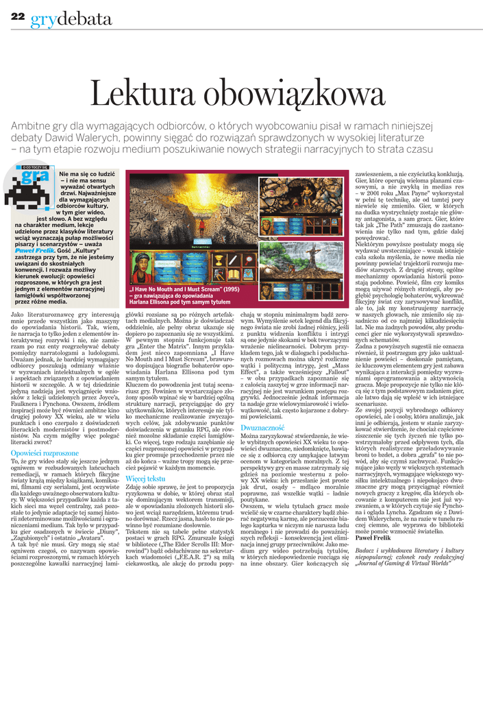 22 grydebata Lektura obowiązkowa Ambitne gry dla wymagających odbiorców, o których wyobcowaniu pisał w ramach niniejszej debaty Dawid Walerych, powinny sięgać do rozwiązań sprawdzonych w wysokiej literaturze – na tym etapie rozwoju medium poszukiwanie nowych strategii narracyjnych to strata czasu Nie ma się co łudzić – i nie ma sensu wyważać otwartych drzwi. Najważniejsze dla wymagających odbiorców kultury, w tym gier wideo, jest słowo. A bez względu na charakter medium, lekcje udzielone przez klasyków literatury wciąż wyznaczają pułap możliwości pisarzy i scenarzystów – uważa Paweł Frelik. Gość „Kultury” zastrzega przy tym, że nie jesteśmy uwiązani do skostniałych konwencji. I rozważa możliwy kierunek ewolucji: opowieści rozproszone, w których gra jest jednym z elementów narracyjnej łamigłówki współtworzonej przez różne media. Jako literaturoznawcę gry interesują mnie przede wszystkim jako maszyny do opowiadania historii. Tak, wiem, że narracja to tylko jeden z elementów interaktywnej rozrywki i nie, nie zamierzam po raz enty rozgrzebywać debaty pomiędzy narratologami a ludologami. Uważam jednak, że bardziej wymagający odbiorcy poszukują odmiany właśnie w wyzwaniach intelektualnych w ogóle i aspektach związanych z opowiadaniem historii w szczególe. A w tej dziedzinie jedyną nadzieją jest wyciągnięcie wniosków z lekcji udzielonych przez Joyce’a, Faulknera i Pynchona. Owszem, źródłem inspiracji może być również ambitne kino drugiej połowy XX wieku, ale w wielu punktach i ono czerpało z doświadczeń literackich modernistów i postmodernistów. Na czym mógłby więc polegać literacki zwrot? Opowieści rozproszone To, że gry wideo stały się jeszcze jednym ogniwem w rozbudowanych łańcuchach remediacji, w ramach których fikcyjne światy krążą między książkami, komiksami, filmami czy serialami, jest oczywiste dla każdego uważnego obserwatora kultury. W większości przypadków każda z takich sieci ma węzeł centralny, zaś pozostałe to jedynie adaptacje tej samej historii zdeterminowane możliwościami i ograniczeniami medium. Tak było w przypadku gier osadzonych w świecie „Diuny”, „Zagubionych” i ostatnio „Avatara”. A tak być nie musi. Gry mogą się stać ogniwem czegoś, co nazywam opowieściami rozproszonymi, w ramach których poszczególne kawałki narracyjnej łami- „I Have No Mouth and I Must Scream” (1995) – gra nawiązująca do opowiadania Harlana Ellisona pod tym samym tytułem główki rozsiane są po różnych artefaktach medialnych. Można je doświadczać oddzielnie, ale pełny obraz ukazuje się dopiero po zapoznaniu się ze wszystkimi. W pewnym stopniu funkcjonuje tak gra „Enter the Matrix”. Innym przykładem jest nieco zapomniana „I Have No Mouth and I Must Scream”, brawurowo dopisująca biografie bohaterów opowiadania Harlana Ellisona pod tym samym tytułem. Kluczem do powodzenia jest tutaj scenariusz gry. Powinien w wystarczająco złożony sposób wpinać się w bardziej ogólną strukturę narracji, przyciągając do gry użytkowników, których interesuje nie tylko mechaniczne realizowanie zwyczajowych celów, jak zdobywanie punktów doświadczenia w gatunku RPG, ale również mozolne składanie części łamigłówki. Co więcej, tego rodzaju zazębianie się części rozproszonej opowieści w przypadku gier promuje przechodzenie przez nie aż do końca – ważne tropy mogą się przecież pojawić w każdym momencie. Więcej tekstu Zdaję sobie sprawę, że jest to propozycja ryzykowna w dobie, w której obraz stał się dominującym wektorem transmisji, ale w opowiadaniu złożonych historii słowo jest wciąż narzędziem, któremu trudno dorównać. Rzecz jasna, hasło to nie powinno być rozumiane dosłownie. Tekstem nie są tabele pełne statystyk postaci w grach RPG. Zmurszałe księgi w bibliotece („The Elder Scrolls III: Morrowind”) bądź odsłuchiwane na sekretarkach wiadomości („F.E.A.R. 2”) są miłą ciekawostką, ale akcję do przodu popy- chają w stopniu minimalnym bądź zerowym. Wymyślenie setek legend dla fikcyjnego świata nie zrobi żadnej różnicy, jeśli z punktu widzenia konfliktu i intrygi są one jedynie skokami w bok tworzącymi wrażenie nielinearności. Dobrym przykładem tego, jak w dialogach i podsłuchanych rozmowach można ukryć rozliczne wątki i polityczną intrygę, jest „Mass Effect”, a także wcześniejszy „Fallout” – w obu przypadkach zapoznanie się z całością zaszytej w grze informacji narracyjnej nie jest warunkiem postępu rozgrywki. Jednocześnie jednak informacja ta nadaje grze wielowymiarowość i wielowątkowość, tak często kojarzone z dobrymi powieściami. Dwuznaczność Można zaryzykować stwierdzenie, że wiele wybitnych opowieści XX wieku to opowieści dwuznaczne, niedomknięte, bawiące się z odbiorcą czy umykające łatwym ocenom w kategoriach moralnych. Z tej perspektywy gry en masse zatrzymały się gdzieś na poziomie westernu z połowy XX wieku: ich przesłanie jest proste jak drut, osądy – mdląco moralnie poprawne, zaś wszelkie wątki – ładnie poutykane. Owszem, w wielu tytułach gracz może wcielić się w czarne charaktery bądź zbierać negatywną karmę, ale porzucenie białego kapturka w niczym nie narusza ładu moralnego i nie prowadzi do poważniejszych refleksji – konsekwencją jest eliminacja innej grupy przeciwników. Jako medium gry wideo potrzebują tytułów, w których niedopowiedzenie rozciąga się na inne obszary. Gier kończących się zawieszeniem, a nie czyściutką konkluzją. Gier, które operują wieloma planami czasowymi, a nie zwykłą in medias res – w 2001 roku „Max Payne” wykorzystał w pełni tę technikę, ale od tamtej pory niewiele się zmieniło. Gier, w których na dudka wystrychnięty zostaje nie główny antagonista, a sam gracz. Gier, które tak jak „The Path” zmuszają do zastanowienia ni