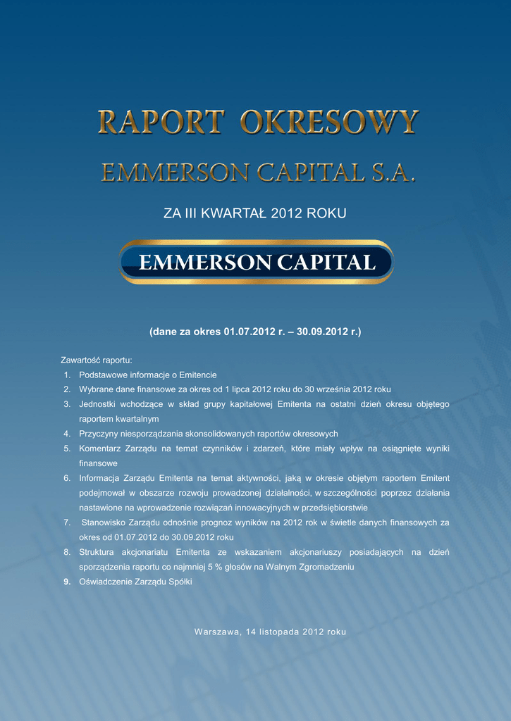 ZA III KWARTAŁ 2012 ROKU (dane za okres 01.07.2012 r. – 30.09.2012 r.) Zawartość raportu: 1. Podstawowe informacje o Emitencie 2. Wybrane dane finansowe za okres od 1 lipca 2012 roku do 30 września 2012 roku 3. Jednostki wchodzące w skład grupy kapitałowej Emitenta na ostatni dzień okresu objętego raportem kwartalnym 4. Przyczyny niesporządzania skonsolidowanych raportów okresowych 5. Komentarz Zarządu na temat czynników i zdarzeń, które miały wpływ na osiągnięte wyniki finansowe 6. Informacja Zarządu Emitenta na temat aktywności, jaką w okresie objętym raportem Emitent podejmował w obszarze rozwoju prowadzonej działalności, w szczególności poprzez działania nastawione na wprowadzenie rozwiązań innowacyjnych w przedsiębiorstwie 7. Stanowisko Zarządu odnośnie prognoz wyników na 2012 rok w świetle danych finansowych za okres od 01.07.2012 do 30.09.2012 roku 8. Struktura akcjonariatu Emitenta ze wskazaniem akcjonariuszy posiadających na dzień sporządzenia raportu co najmniej 5 % głosów na Walnym Zgromadzeniu 9. Oświadczenie Zarządu Spółki W arszawa, 14 listopada 2012 roku Raport okresowy za III kwartał 2012 r. 1 1. PODSTAWOWE INFORMACJE O EMITENCIE Firma EMMERSON CAPITAL S.A. Siedziba Warszawa Adres Ul. Stawki 40, 01-040 Warszawa Telefon +48 22 828 92 96 Faks +48 22 530 12 01 Adres poczty elektronicznej: [email protected] Adres strony internetowej www.emmersoncapital.pl NIP 527 26 37 300 REGON 142527214 Kapitał zakładowy 1.800.000,00 zł (w całości opłacony) 18.000.000 akcji o wartości nominalnej 0,10 zł każda, w tym: - 2.400.000 akcji uprzywilejowanych imiennych serii A - 2.600.000 akcji zwykłych na okaziciela serii B - 3.000.000 akcji zwykłych na okaziciela serii C - 2.500.000 akcji zwykłych na okaziciela serii D - 7.500.000 akcji zwykłych na okaziciela serii E Ilość akcji KRS 0000373802 Numer KRS wraz z organem prowadzącym rejestr Sąd Rejonowy dla m.st. Warszawy w Warszawie, XII Wydział Gospodarczy Krajowego Rejestru Sądowego Zarząd Tadeusz Popławski – Prezes Zarządu Źródło: Emitent Raport okresowy za III kwartał 2012 r. 2 2. WYBRANE DANE FINANSOWE ZA OKRES OD 01.07.2012 DO 30.09.2012 r. Tabela 1. Wybrane jednostkowe pozycje z bilansu Emitenta (PLN) Wyszczególnienie Kapitał własny Należności długoterminowe Należności krótkoterminowe Środki pieniężne i inne aktywa pieniężne Zobowiązania długoterminowe Zobowiązania krótkoterminowe Rzeczowe aktywa trwałe na dzień na dzień na dzień na dzień 30.09.2012 r. 30.09.2011 r. 30.06.2012 r. 30.06.2011 r. 9 505 941,24 11 539 680,00 7 676 762,11 11 792 871,11 0,00 0,00 0,00 0,00 818 891,04 2 398 198,92 770 835,81 3 172 074,21 2 193,70 978 884,48 44 196,89 383 937,53 31 443,07 89 308,21 31 443,07 88 355,08 2 172 794,01 8 677,2 677 977,74 13 273,42 66 128,91 84 583,48 70 742,56 89 197,12 Źródło: Emitent Tabela 2. Wybrane jednostkowe pozycje z rachunku zysków i strat Emitenta (PLN) Wyszczególnienie Przychody netto ze sprzedaży III kwartał 2012 r. (rok bieżący) 01.07.2012 – 30.09.2012 III kwartał 2011 r. (rok ubiegły) 01.07.2011 – 30.09.2011 Rok bieżący za okres od 01.01.2012 do 30.09.2012 Rok ubiegły za okres od 01.01.2011 do 30.09.2011 25 000,00 0,00 555 853,66 2 853,25 4613,65 4 613,64 13 840,93 7 689,40 Zysk/strata na sprzedaży -120 531,62 -74 341,95 -383 673,24 -248 508,68 Zysk/strata na działalności operacyjnej -121 436,61 -74 341,28 -384 585,03 -248 508,87 Zysk/strata brutto -606 415,87 -285 356,37 -3 635 873,15 -284 301,00 Zysk/strata netto -517 101,87 -253 190,37 -3 028 829,63 -289 341,00 Amortyzacja Źródło: Emitent Raport okresowy za III kwartał 2012 r. 3 3. JEDNOSTKI WCHODZĄCE W SKŁAD GRUPY KAPITAŁOWEJ EMITENTA NA OSTATNI DZIEŃ OKRESU OBJĘTEGO RAPORTEM KWARTALNYM Emitent posiada 100 % udziału w kapitale zakładowym oraz głosach na Walnym Zgromadzeniu następujących spółek: - EM-Inwestycje 2 Sp. z o.o. - EM INVEST Sp. z o.o. 4. PRZYCZYNY NIESPORZĄDZANIA SKONSOLIDOWANYCH RAPORTÓW OKRESOWYCH Emitent nie sporządza skonsolidowanego sprawozdania finansowego za 2011 rok, na podstawie rt.. 56 ust.1 Ustawy z dnia 29.09.1994 r. o rachunkowości z uwagi na niespełnienie trzech warunków: 1) poziom średniorocznego zatrudnienia w 2011 roku nie przekroczył 250 osób, 2) łączna suma bilansowa w walucie polskiej nie przekroczyła równowartości 7 500 000 EUR, 3) łączne przychody netto ze sprzedaży produktów, towarów oraz operacji finansowych nie przekroczyły 15 mln EUR. Wraz z wejściem nowego brzmienia przepisu § 5 ust. 2 Załącznika nr 3 do Regulaminu Alternatywnego Systemu Obrotu, Emitent będzie sporządzał jako jednostka dominująca raporty okresowe w formie skonsolidowanego raportu rocznego i kwartalnego, począwszy od raportu kwartalnego za IV kwartał 2012 roku. . 5. KOMENTARZ ZARZĄDU NA TEMAT CZYNNIKÓW I ZDARZEŃ, KTÓRE MIAŁY WPŁYW NA OSIĄGNIĘTE WYNIKI FINANSOWE W III kwartale 2012 roku Emitent osiągnął przychody ze sprzedaży netto w wysokości 25.000 zł, zaś od początku 2012 roku do końca III kwartału 2012 roku – w wysokości 555.853,66 zł. Zaplanowane przedsięwzięcia inwestycyjne na rynku Raport okresowy za III kwartał 2012 r. 4 nieruchomości zaczynają zatem przynosić już pierwsze efekty. Jednocześnie jednak strata netto wyniosła -517.101,87 zł, a więc w porównaniu z III kwartałem 2011 r. wzrosła ponad dwukrotnie. Strata netto narastająco, od początku 2012 r. do końca III kwartału 2012 r. wyniosła -3 028 829,63 zł. Nadal aktualny pozostaje komentarz zamieszczony w raporcie okresowym za II kwartał 2012 r. z dnia 14 sierpnia 2012 r., iż strata netto jest przede wszystkim rezultatem wyceny bilansowej instrumentów finansowych (niski kurs rynkowy posiadanych walorów finansowych). Spółka jest na etapie tworzenia solidnych podstaw działalności, poprzez budowanie portfela inwestycyjnego na rynku nieruchomości, które stwarzają dobre perspektywy dalszego rozwoju.