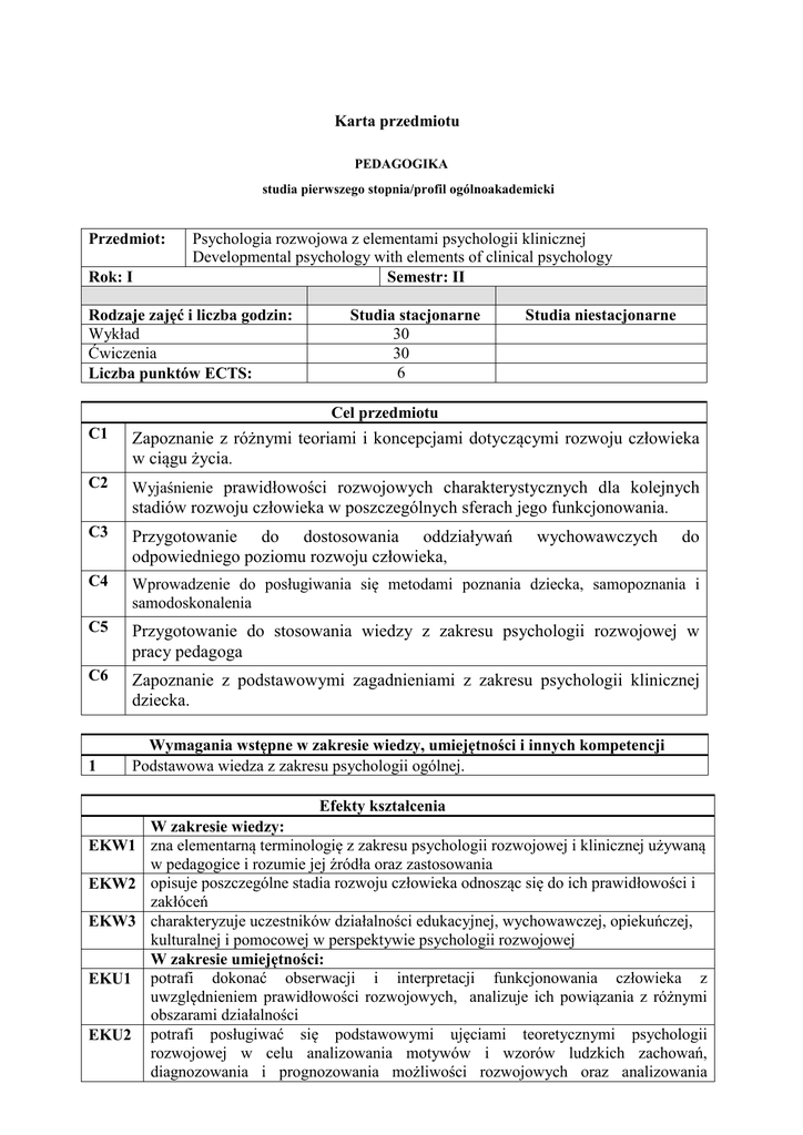 Karta przedmiotu PEDAGOGIKA studia pierwszego stopnia/profil ogólnoakademicki Przedmiot: Rok: I Psychologia rozwojowa z elementami psychologii klinicznej Developmental psychology with elements of clinical psychology Semestr: II Rodzaje zajęć i liczba godzin: Wykład Ćwiczenia Liczba punktów ECTS: Studia stacjonarne 30 30 6 Studia niestacjonarne Cel przedmiotu C1 Zapoznanie z różnymi teoriami i koncepcjami dotyczącymi rozwoju człowieka w ciągu życia. C2 Wyjaśnienie prawidłowości rozwojowych charakterystycznych dla kolejnych stadiów rozwoju człowieka w poszczególnych sferach jego funkcjonowania. C3 Przygotowanie do dostosowania oddziaływań odpowiedniego poziomu rozwoju człowieka, C4 Wprowadzenie do posługiwania się metodami poznania dziecka, samopoznania i samodoskonalenia C5 Przygotowanie do stosowania wiedzy z zakresu psychologii rozwojowej w pracy pedagoga C6 Zapoznanie z podstawowymi zagadnieniami z zakresu psychologii klinicznej dziecka. 1 wychowawczych do Wymagania wstępne w zakresie wiedzy, umiejętności i innych kompetencji Podstawowa wiedza z zakresu psychologii ogólnej. Efekty kształcenia W zakresie wiedzy: EKW1 zna elementarną terminologię z zakresu psychologii rozwojowej i klinicznej używaną w pedagogice i rozumie jej źródła oraz zastosowania EKW2 opisuje poszczególne stadia rozwoju człowieka odnosząc się do ich prawidłowości i zakłóceń EKW3 charakteryzuje uczestników działalności edukacyjnej, wychowawczej, opiekuńczej, kulturalnej i pomocowej w perspektywie psychologii rozwojowej W zakresie umiejętności: EKU1 potrafi dokonać obserwacji i interpretacji funkcjonowania człowieka z uwzględnieniem prawidłowości rozwojowych, analizuje ich powiązania z różnymi obszarami działalności potrafi posługiwać się podstawowymi ujęciami teoretycznymi psychologii EKU2 rozwojowej w celu analizowania motywów i wzorów ludzkich zachowań, diagnozowania i prognozowania możliwości rozwojowych oraz analizowania EKK1 W1 W2 W3 W4 W5 W6 strategii działań praktycznych W zakresie kompetencji społecznych: odpowiedzialnie przygotowuje się do swojej pracy uwzględniając prawidłowości rozwojowe podopiecznych, Treści programowe przedmiotu Forma zajęć – wykłady Treści programowe Psychologia rozwojowa. Przedmiot psychologii rozwojowej podstawowe definicje i pojęcia. Periodyzacja rozwoju. Rodzaje i cele zmian rozwojowych. Czynniki wywierające wpływ na charakter i wielkość zmian rozwojowych. Metody badań w psychologii rozwojowej. Diagnoza poziomu rozwoju i jej znaczenie dla optymalizacji rozwoju człowieka.. Charakterystyka okresów rozwojowych Okres prenatalny. Okres niemowlęcy. Okres poniemowlęcy. Charakterystyka okresów rozwojowych Okres przedszkolny. Okres szkolny. Definicja dojrzałości szkolnej. Charakterystyka okresów rozwojowych Adolescencja Charakterystyka okresów rozwojowych Okres dorosłości. Okres starzenia się. Liczba godzin 2 2 2 2 2 2 W7 W8 Rozwój poznawczy Rozwój biotyczny. Rozwój inteligencji. Rozwój mowy. 2 Rozwój motywacyjno-emocjonalny Rozwój społeczny Relacje społeczne w rodzinie i w grupie rówieśniczej. Mechanizmy rozwoju społecznego. 2 W9 Rozwój estetyczny Plastyczna ekspresja i twórczość dziecka. Teatr, film, muzyka. 4 W10 Rozwój moralny Fazy rozwoju religijnego według N. Bulla. Okresy rozwoju ocen moralnych według J. Piageta. Rozwój moralny według L. Kohlberga. Stadia i fazy rozwoju moralnego według H. 2 Muszyńskiego. W11 W12 W13 W14 W15 Rozwój religijny Religijność w okresie niemowlęcym. Religijność w okresie poniemowlęcym. Religijność dziecka przedszkolnego. Religijność w wieku wczesnoszkolnym. Religijność w średnim wieku szkolnym. Starszy wiek szkolny. Okres młodzieńczy. Wczesna dorosłość. Wiek średni. Późna dorosłość. Zaburzenia rozwojowe, zaburzenia zachowania (w tym zespół nadpobudliwości psychoruchowej), zaburzenia emocjonalne (w tym lęki i fobie). Zaburzenia lękowe i nastroju. Zaburzenia osobowości. 2 2 Agresja i przemoc (w tym agresja elektroniczna). Uzależnienia (w tym od środków psychoaktywnych i komputera). 2 Zaburzenia odżywiania. Problemy zdrowotne ucznia i ich wpływ na jego sytuację szkolną. Niepełnosprawność fizyczna i intelektualna oraz jej konsekwencje psychologiczne. Zaburzenia w procesie rozwoju językowego. Całościowe zaburzenia w rozwoju 2 2 30 Suma godzin: Forma zajęć – ćwiczenia Treści programowe ĆW1 Psychologia rozwojowa Przedmiot, zainteresowania i podstawowe pojęcia stosowane w psychologii rozwojowej. Periodyzacja życia człowieka. Obszary funkcjonowania i rozwoju człowieka. Pojęcie rozwoju i zmiany rozwojowej w ujęciu psychologicznym. ĆW2 ĆW4 2 Prenatalny okres rozwoju człowieka Rozwój fizyczny człowieka w okresie prenatalnym, faza zarodkowa, okres płodowy, rozwój umiejętności psychoruchowych, narządów zmysłów, nabywanie cech indywidualnych. Funkcjonowanie zmysłów, pamięci i uczenia się w okresie prenatalnym. Czynniki wspomagające i zakłócające rozwój. ĆW 3 Liczba godzin Wczesne dzieciństwo Wiek niemowlęcy – adaptacja do nowego środowiska, aktywność odruchowa, rozwój psychoruchowy. Wiekponiemowlęcy – rozwój fizyczny i psychiczny. Komunikacja, zabawa, kompetencje społeczne. Rozwójfunkcji poznawczych oraz sfery emocjonalnej. 2 2 2 ĆW5 Średnie dzieciństwo Rozwój somatyczny, procesy poznawcze, rozwój funkcji symbolicznej, sprawność językowa i komunikacyjna, rozwój emocjonalny, społeczny i moralny. Osobowość dziecka ĆW6 ĆW7 ĆW8 ĆW9 ĆW10 ĆW11 ĆW12 ĆW13 ĆW14 ĆW15 Późne dzieciństwo Charakterystyka zmian, rozwój poznawczy, poczucie kompetencji i sprawstwa, rozwój emocjonalno-społeczny, moralność, Osobowość dziecka Wiek dorastania. Podstawowe zadania okresu dorastania, zmiany fizjologiczne, rozwój funkcji poznawczych. Funkcjonowanie społeczne, grupa rówieśnicza. Rodzaje aktywności, postawy i przekonania, poczucie tożsamości i akce