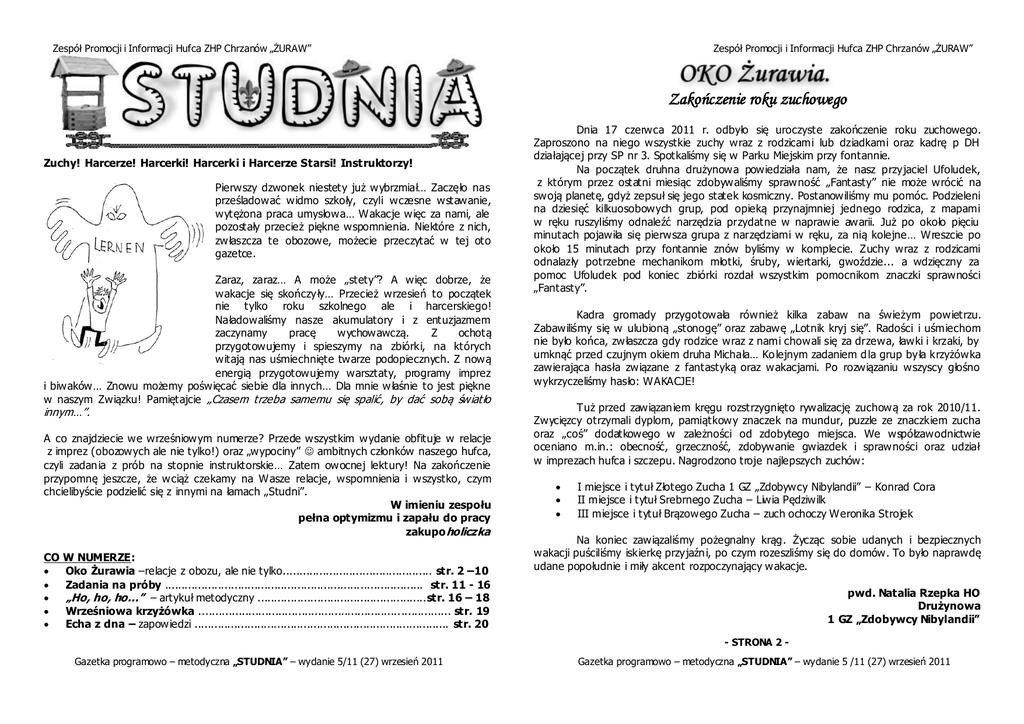 Zespół Promocji i Informacji Hufca ZHP Chrzanów „ŻURAW” Zespół Promocji i Informacji Hufca ZHP Chrzanów „ŻURAW” Zakończenie roku zuchowego Zuchy! Harcerze! Harcerki! Harcerki i Harcerze Starsi! Instruktorzy! Pierwszy dzwonek niestety już wybrzmiał… Zaczęło nas prześladować widmo szkoły, czyli wczesne wstawanie, wytężona praca umysłowa… Wakacje więc za nami, ale pozostały przecież piękne wspomnienia. Niektóre z nich, zwłaszcza te obozowe, możecie przeczytać w tej oto gazetce. Zaraz, zaraz… A może „stety”? A więc dobrze, że wakacje się skończyły… Przecież wrzesień to początek nie tylko roku szkolnego ale i harcerskiego! Naładowaliśmy nasze akumulatory i z entuzjazmem zaczynamy pracę wychowawczą. Z ochotą przygotowujemy i spieszymy na zbiórki, na których witają nas uśmiechnięte twarze podopiecznych. Z nową energią przygotowujemy warsztaty, programy imprez i biwaków… Znowu możemy poświęcać siebie dla innych… Dla mnie właśnie to jest piękne w naszym Związku! Pamiętajcie „Czasem trzeba samemu się spalić, by dać sobą światło innym…”. A co znajdziecie we wrześniowym numerze? Przede wszystkim wydanie obfituje w relacje z imprez (obozowych ale nie tylko!) oraz „wypociny” ambitnych członków naszego hufca, czyli zadan ia z prób na stopnie instruktorskie… Zatem owocnej lektury! Na zakończenie przypomnę jeszcze, że wciąż czekamy na Wasze relacje, wspomnienia i wszystko, czym chcielibyście podzielić się z innymi na łamach „Studni”. W imieniu zespołu pełna optymizmu i zapału do pracy zakupo holiczka CO W NUMERZE: Oko Żurawia –relacje z obozu, ale nie tylko............................................. str. 2 –10 Zadania na próby .............................................................................. str. 11 - 16 „Ho, ho, ho…” – artykuł metodyczny ...................................................str. 16 – 18 Wrześniowa krzyżówka ............................................................................ str. 19 Echa z dna – zapowiedzi ............................................................................. str. 20 Dnia 17 czerwca 2011 r. odbyło się uroczyste zakończenie roku zuchowego. Zaproszono na niego wszystkie zuchy wraz z rodzicami lub dziadkami oraz kadrę p DH działającej przy SP nr 3. Spotkaliśmy się w Parku Miejskim przy fontannie. Na początek druhna drużynowa powiedziała nam, że nasz przyjaciel Ufoludek, z którym przez ostatni miesiąc zdobywaliśmy sprawność „Fantasty” nie może wrócić na swoją planetę, gdyż zepsuł się jego statek kosmiczny. Postanowiliśmy mu pomóc. Podzieleni na dziesięć kilkuosobowych grup, pod opieką przynajmniej jednego rodzica, z mapami w ręku ruszyliśmy odnaleźć narzędzia przydatne w naprawie awarii. Już po około pięciu minutach pojawiła się pierwsza grupa z narzędziami w ręku, za nią kolejne… Wreszcie po około 15 minutach przy fontannie znów byliśmy w komplecie. Zuchy wraz z rodzicami odnalazły potrzebne mechanikom młotki, śruby, wiertarki, gwoździe... a wdzięczny za pomoc Ufoludek pod koniec zbiórki rozdał wszystkim pomocnikom znaczki sprawności „Fantasty”. Kadra gromady przygotowała również kilka zabaw na świeżym powietrzu. Zabawiliśmy się w ulubioną „stonogę” oraz zabawę „Lotnik kryj się”. Radości i uśmiechom nie było końca, zwłaszcza gdy rodzice wraz z nami chowali się za drzewa, ławki i krzaki, by umknąć przed czujnym okiem druha Michała… Ko lejnym zadaniem d la grup była krzyżówka zawierająca hasła związane z fantastyką oraz wakacjami. Po rozwiązaniu wszyscy głośno wykrzyczeliśmy hasło: WAKACJE! Tuż przed zawiązan iem kręgu rozstrzygnięto rywalizację zuchową za rok 2010/11. Zwycięzcy otrzymali dyplom, pamiątkowy znaczek na mundur, puzzle ze znaczkiem zucha oraz „coś” dodatkowego w zależności od zdobytego miejsca. We współzawodnictwie oceniano m.in.: obecność, grzeczność, zdobywanie gwiazdek i sprawności oraz udział w imprezach hufca i szczepu. Nagrodzono troje najlepszych zuchów: I miejsce i tytuł Złotego Zucha 1 GZ „Zdobywcy Nibylandii” – Konrad Cora II miejsce i tytuł Srebrnego Zucha – Liw ia Pędziwilk III miejsce i tytuł Brązowego Zucha – zuch ochoczy Weronika Strojek Na koniec zawiązaliśmy pożegnalny krąg. Życząc sobie udanych i bezpiecznych wakacji puściliśmy iskierkę przyjaźn i, po czym rozeszliśmy się do domów. To było naprawdę udane popołudnie i miły akcent rozpoczynający wakacje. pwd. Natalia Rzepka HO Drużynowa 1 GZ „Zdobywcy Nibylandii” - STRONA 2 - Gazetka programowo – metodyczna „STUDNIA” – wydanie 5/11 (27) wrzesień 2011 Gazetka programowo – metodyczna „STUDNIA” – wydanie 5 /11 (27) wrzesień 2011 Zespół Promocji i Informacji Hufca ZHP Chrzanów „ŻURAW” Zespół Promocji i Informacji Hufca ZHP Chrzanów „ŻURAW” Liczba, wielkość, cyfry, ilość, masa, liczebność … Obozowe życie Tropicieli Leśnych Tajemnic Tuż przed wakacjami na tablicy informacyjnej hufca oraz na skrzynkach mailowych pojawiło się intrygujące zaproszenie od Namiestniczki Zuchowej. Pojawiło się w nim wiele informacji dotyczących liczb… Np. lęk przed liczbą 13 nazywany jest triskaidekafobią lub informacja na temat liczb doskonałych, że jest to taka liczba, która jest równa sumie wszystkich swoich dzielników mniejszych od niej samej (przykład 28 = 1 + 2 + 4 + 7 + 14)… Zaproszenie było intrygujące. Tylko na końcu kolorowego plakatu pojawiło się rzeczowe zdanie: „Robin Hood i Mały John to sławne postacie, Siala lala, siala lala, każdy o tym wie…” „serdecznie zapraszam wszystkich zucholi (i przyszłą kadrę zuchową) na warsztaty poświęcone Akcji Naborowej”. Podano także termin i miejsce – harcówka hufca, 20 czerwca, godzina 16:30. W warsztatach wzięło udział 7 osób. Porównano na nich trad
