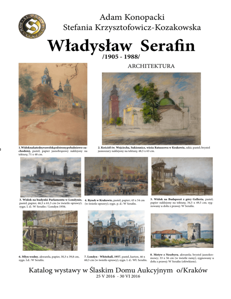 Adam Konopacki Stefania Krzysztofowicz-Kozakowska Władysław Serafin /1905 - 1988/ ARCHITEKTURA 1. Widok na katedrę wawelską od strony południowo-zachodniej, pastel; papier jasnobrązowy naklejony na tekturę; 71 x 48 cm. 2. Kościół św. Wojciecha, Sukiennice, wieża Ratuszowa w Krakowie, szkic pastel; brystol jasnoszary naklejony na tekturę; 48,5 x 63 cm. 3. Widok na budynki Parlamentu w Londynie, 4. Rynek w Krakowie, pastel, papier; 43 x 54 cm pastel, papier, 46,5 x 61,5 cm (w świetle oprawy); (w świetle oprawy); sygn. p. d.: W Serafin. sygn. l. d.: W Serafin / Londyn 1956. 6. Młyn wodny, akwarela, papier, 30,3 x 39,8 cm, sygn. l.d.: W Serafin. 5. Widok na Budapeszt z góry Gellerta, pastel; papier naklejony na tekturę; 34,5 x 49,5 cm; sygnowany u dołu z prawej: W Serafin. 8. Motyw z Nesebyru, akwarela; brystol jasnokre7. Londyn - Whitehall, 1957, pastel, karton, 46 x mowy; 33 x 56 cm (w świetle ramy); sygnowany u 60,5 cm (w świetle oprawy); sygn. l. d.: Wł. Serafin. dołu z prawej: W Serafin (ołówkiem). Katalog wystawy w Ślaskim Domu Aukcyjnym o/Kraków 25 V 2016 - 30 VI 2016 POLSKIE GÓRY 9. Morskie Oko, pastel; papier kremowy naklejony na tekturę; 40 x 51 cm; sygnowany u dołu z lewej: W Serafin (czarną kredką). 12. Zima w górach w słoneczny dzień, ok.1950, pastel; papier naklejony na tekturę; 30 x 22,4 cm; sygnowany u dołu z prawej: W Serafin. 10. Morskie Oko, pastel; papier jasnobrązowy; 34 x 48 cm (w świetle oprawy); sygnowany u dołu z prawej: W Serafin. 13. Znad Morskiego Oka I, ok.1950, pastel; papier naklejony na tekturę; 22,5 x 20,2 cm; sygnowany u dołu z lewej: W Serafin. PEJZAŻ, KWIATY, MARTWA NATURA 11. Pejzaż podgórski V, akwarela, tektura, 45 x 53 cm, sygn. l.d.: W Serafin. 21. Artysta przy sztalugach w plenerze , olej, płótno; 48,5 x 64,5 cm. 22. Pejzaż ze stawem i wiejską chałupą w tle, pastel; tektura jasnobrązowa; 25,5 x 31 cm; sygnowany u dołu z prawej: W Serafin. 23. Sad , akwarela; brystol jasnokremowy; 28 x 38 cm; sygnowany u dołu z prawej: W Serafin (ołówkiem). 14. Limba nad Morskim Okiem, pastel; papier naklejony na tekturę; 49 x 36 cm; sygnowany u dołu z lewej: W Serafin. 24. Sosna, 1970? , pastel; papier jasnobrązowy; 45 x 32 cm (w świetle oprawy); sygnowany dwukrotnie u dołu z lewej: W Serafin/ 1970. 25. Droga w lesie, akwarela, papier; 59 x 38 cm (w świetle oprawy); sygn. l. d.: W Serafin (ołówkiem). 26. Las , akwarela, papier, 51 x 36,5 cm, sygn. p.d.: Wł Serafin. 15. Widok Giewontu, akwarela, papier, 38 x 56 cm, 16. Pejzaż górski z szałasami, 1952, pastel; papier 17. Pejzaż wiejski z chmurami, akwarela, papier; sygn. p.d.: SERAFIN 52 jasnobrązowy naklejony na tekturę; 26,8 x 33,8 cm; 36,5 x 54,5 cm (w swietle oprawy); sygn. p. d.: W Serafin (ołówkiem). sygnowany u dołu z prawej: W Serafin. 18. Pejzaż ze stogami, akwarela; brystol naklejony na tekturę; 32 x 47 cm; sygnowany u dołu z prawej: W Serafin (ołówkiem). 19. Dunajec, pastel; papier naklejony na tekturę; 30,5 x 44,5 cm; sygnowany u dołu z prawej: W Serafin (czarną kredką). 20. Słoneczniki, akwarela, gwasz, papier, 30,5 x 43 cm, niesygnowany. 27. Dziki ogród , pastel; brystol jasnokremowy 28. Drzewa I, akwarela; brystol jasnokremowy; 36 x 29. W lesie , pastel; brystol jasnokremowy; 36,5 x naklejony na tekturę; 35,5 x 50,5 cm; sygnowany u 50 cm (w świetle oprawy); sygnowany u dołu z lewej: 50,5 cm; sygnowany u dołu z prawej: W Serafin. W Serafin (ołówkiem). dołu z prawej: W Serafin. 30. Martwa natura z owocami, olej, tektura; 35,5 x 50 cm; sygn. p. d.: W. Serafin. 31. Maki w wazonie, akwarela; brystol szary naklejony na tekturê; 31 x 48 cm; sygnowany u dołu z lewej: W Serafin (ołówkiem). 32. Tulipany, akwarela; brystol; 26,5 x 33 cm; sygnowany u dołu z prawej: Wł Serafin (ołówkiem). MARYNISTYKA 33. W porcie II, 1967, pastel; papier żeberkowy 34. W porcie Stavanger, 1956, pastel; papier nakjasnobrązowy; 49 x 64 cm (w świetle ramy); syg- lejony na tekturę; 32 x 48 cm; sygnowany u dołu z nowany u dołu z lewej: W Serafin 1967. lewej: W Serafin/ Stavenger 1956. 35. W stoczni I, 1967, pastel; papier żeberkowy jasnoszary naklejony na tekturę; 49,5 x 65,5 cm; sygnowany u dołu z lewej: W Serafin 1967 (sepią). 36. W porcie I, 1967, akwarela, pastel; papier na- 37. W porcie, akwarela, papier, 35,5 x 52 cm (w klejony na tekturę; 48,3 x 62,5 cm; sygnowany u świetle oprawy), sygn. l.d.: Wł. Serafin 1971. dołu z prawej: W Serafin 1967. 38. W porcie, 1967, akwarela, papier: 46 x 62 cm (w świetle oprawy); sygn. l. d.: W. Serafin 1967. 39. MS „Batory” przy nabrzeżu w Gdyni , pastel; 40. TSS Stefan Batory wpływający do portu w Gdyni, akwarela; brystol; 38 x 57 cm. karton jasnobrązowy naklejony na tekturę; 23 x 32,3 cm (tektura 24 x 33 cm); sygnowany u dołu z lewej: W Serafin (brązowym pastelem). 41. W porcie II, 1967, akwarela, pastel; papier żeberkowy jasnokremowy naklejony na tekturę; 48,5 x 62,8 cm; sygnowany u dołu z prawej: W Serafin 1967 (czarną kredką). Szanowni Państwo! Po raz kolejny pragniemy zaprezentować Państwu wystawę malarstwa, tym razem poświęconą twórczości mistrza techniki pastelu– Władysława Serafina. Student Krakowskiej Akademii w latach 1932-1938, a następnie jej profesor, dał się poznać przede wszystkim jako wszechstronny pejzażysta, czego dowodem są prace publikowane w niniejszym katalogu. Chcielibyśmy serdecznie podziękować za pomoc udzieloną przy organizacji naszej wystawy oraz opracowaniu katalogu następującym osobom: przede wszystkim wspomnianemu synowi Artysty – Wojciechowi Serafinowi za udostępnienie prac, Adamowi i Grażynie Piątek z krakowskiej „Galerii 7”, jak również naszym stałym współautorom – Stefanii Krzysztofowicz Kozakowskiej oraz Adamowi Konopackiemu. Kraków, maj 2016r. Karolina Mrowiec