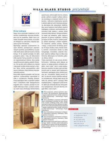 VILLA GLASS STUDIO 5 1. Drzwi przesuwne, szklane wykonane meto- Drzwi szklane dĆ fusingu. Dla podniesienia bezpieczeĕstwa i wygody uīytkowania drzwi zostaây wykonane ze szkâa bezpiecznego – hartowanego. Projekt indywidualny. 2. Drzwi wahadâowe z bocznymi elementami staâymi oddzielajĆce wiatroâap od hallu. Dodatkowo wnċtrze ozdabiajĆ bulaje, które zostaây wykonane tĆ samĆ technikĆ, stylistycznie pasujĆce do drzwi. Dla podniesienia bezpieczeĕstwa i wygody uīytkowania drzwi zostaây wykonane ze szkâa bezpiecznego – hartowanego. Projekt indywidualny. 3. Drzwi standardowe montowane na klasycznej regulowanej oğcieīnicy drewnianej. Szkâo bezpieczne hartowane. 4. Drzwi standardowe montowane na klasycznej regulowanej oğcieīnicy drewnianej. Szkâo bezpieczne hartowane. 5. Kabina prysznicowa wykonana ze szkâa fusowanego. System montaīu zostaâ dostosowany do poddasza na którym sufit jest dwuspadowy. Kabina zostaâa wykonana ze szkâa bezpiecznego hartowanego. 1 2 3 4 A D R E S F I R M Y: VILLA GLASS STUDIO Sp. z o.o. ul. Biaïobrzeska 100 A 38-400 Krosno tel. 013 436 44 63, faks 013 436 44 75 www.villa.com.pl e-mail: [email protected] 183 2010 Nasza firma rozpoczċâa dziaâalnoğý od absolutnie nowatorskiego wówczas produktu, jakim byâ īel parafinowy. Dziċki niemu powstaây niezwykâe ğwiece īelowe, do zâudzenia imitujĆce np. kufel piwa, marynaty owocowe czy teī mini-akwaria. WychodzĆc naprzeciw oczekiwaniom naszych klientów, zachwyconych artyzmem naszych wyrobów, wprowadziliğmy na rynek maâe dzieâa sztuki: szkâo formowane metodĆ fusingu. W ten sposób powstaây nie tylko przepiċkne patery i misy, ale dekorowanie szkâa poprzez fusing pozwoliâo na stworzenie niepowtarzalnych kolekcji, które zostaây uzupeânione przez wazony, salaterki i ğwieczniki. Do tej pory szkâo zdobione tĆ metodĆ i dekoracje na szkle budzĆ zachwyt u klientów. Nieco póĩniej wprowadziliğmy szkâo rċcznie malowane, które zadziwia niepowtarzalnoğciĆ wzorów. Kiedy szkâo stapiane przestaâo mieý dla nas tajemnice, postanowiliğmy wykorzystaý to szkâo w architekturze. Powstaây pierwsze, wciĆī zapierajĆce dech w piersiach szklane drzwi i przeszklenia staâe. Nieograniczone bogactwo form i kolorów pozwala na niezwykâe dekoracje wnċtrz, a szklane aranīacje wnċtrz wrċcz olğniewajĆ. Szklane kabiny prysznicowe, szklane pâytki ğcienne, szklane panele, szklane umywalki i szklane dekoracje pozwalajĆ na urzĆdzenie âazienki w niebanalny i caâkowicie indywidualny sposób, a szklane pâytki do kuchni stanowiĆ atrakcyjnĆ alternatywċ dla tradycyjnych kafelków. Aby nasze fusowane drzwi szklane idealnie wspóâgraây z wnċtrzem, wprowadziliğmy nowoczesne stoây szklane i szklane stoliki (fusowane blaty szklane). ZresztĆ architektura wnċtrz jest dziedzinĆ, gdzie jedynymi granicami sĆ granice wyobraĩni: robiliğmy juī ğciany ze szkâa, fontanny, szklane podâogi, szklane balustrady i szklane wypeânienia balustrad, szklane schody, kinkiety i lampy, a nawet ponad 10-metrowy īyrandol. W swym dorobku mamy równieī obiekty sakralne: nowoczesne witraīe ze szkâa fusingowego, chrzcielnice, wizerunki ğwiċtych, ogromny szklany krzyī na oâtarz oraz elementy dekoracyjne do koğcioâów, gâównie oâtarzy i ambon. Trzeba zaznaczyý, īe caây proces obróbki, formowania i dekoracja szkâa odbywa siċ rċcznie, co nadaje wyrobom unikatowy charakter „hand made”. Jest to warte podkreğlenia tym bardziej, īe nasze szkâo architektoniczne jest to zawsze szkâo bezpieczne, hartowane, speâniajĆce normy zarówno polskie, jak i europejskie. Naleīy równieī dodaý, īe zlecenia naszych klientów realizujemy kompleksowo, oferujĆc takīe okucia do szkâa (np. zawiasy, zamki i uchwyty). Stale wspóâpracujemy z najlepszymi producentami, takimi jak niemiecka Dorma, której jesteğmy dystrybutorem, francuski Stremler, belgijski Mab, i wielu innych. prezentuje