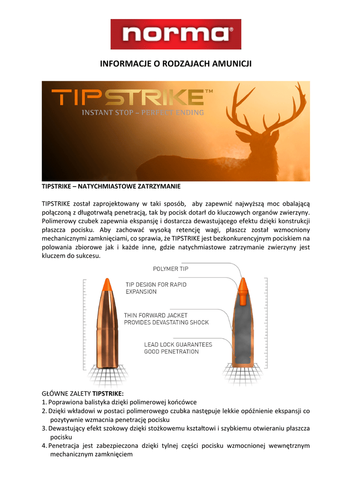 INFORMACJEORODZAJACHAMUNICJI TIPSTRIKE–NATYCHMIASTOWEZATRZYMANIE TIPSTRIKE został zaprojektowany w taki sposób, aby zapewnić najwyższą moc obalającą połączonązdługotrwałąpenetracją,takbypociskdotarłdokluczowychorganówzwierzyny. Polimerowyczubekzapewniaekspansjęidostarczadewastującegoefektudziękikonstrukcji płaszcza pocisku. Aby zachować wysoką retencję wagi, płaszcz został wzmocniony mechanicznymizamknięciami,cosprawia,żeTIPSTRIKEjestbezkonkurencyjnympociskiemna polowania zbiorowe jak i każde inne, gdzie natychmiastowe zatrzymanie zwierzyny jest kluczemdosukcesu. GŁÓWNEZALETYTIPSTRIKE: 1. Poprawionabalistykadziękipolimerowejkońcówce 2. Dziękiwkładowiwpostacipolimerowegoczubkanastępujelekkieopóźnienieekspansjico pozytywniewzmacniapenetracjępocisku 3. Dewastującyefektszokowydziękistożkowemukształtowiiszybkiemuotwieraniupłaszcza pocisku 4. Penetracja jest zabezpieczona dzięki tylnej części pocisku wzmocnionej wewnętrznym mechanicznymzamknięciem EKSPANSJAPOCISKUTIPSTRIKE: Ekspansjapociskurozpoczynasiębezpośredniopouderzeniucelu: Blokżelatyny(35cm)prezentujeuderzeniepociskuTIPSTRIKEzprędkością800m/s.Pocisk jestzaprojektowanytak,abyuwolnićenergiębezpośredniopouderzeniu.Dajetomocnyefekt szokowy dla zwierzyny. Dzięki szybkiemu oddawaniu energii prędkość pocisku gwałtownie spada. Mechaniczne zamknięcie gwarantuje zapewnienie możliwie największej masy resztkowejpociskucobezpośrednioprzekładasięnadoskonałąpenetrację. NATYCHMIASTOWEZATRZYMANIE–ZFABRYKIDORZECZYWISTOŚCI Oba pociski w kalibrze 30-06 uderzyły w swój cel z prędkością 800 m/s. Pocisk z lewej został wyciągnięty z bloku żelatyny podczas testów.Pociskzprawejzostałwyjętyztuszydzikapo udanym polowaniu. W obu przypadkach zamknięcie mechaniczne wypełniło swoje zadanie przekładając sięnajwyższąmasęresztkową. „TIPSTRIKEna300m–najwyższa precyzjatozamałopowiedziane gdyskupienienatakimdystansie wynosi22mm!” Dostępnekalibryw2016roku:308Win,30-06,300 WinMag,300WSM. ECOSTRIKE–PRZEMYŚLANEUDERZENIE Lekki pocisk nie doścignie ciężkiego? ECOSTRIKE obraca niemożliwe w rzeczywistość. Aby zrobićpocisklżejszymiuchronićgoodfragmentacji,ołówzostałzastąpionymiedziąiniklem. ZECOSTRIKErozpoczynasięnowaeramyślistwa,gdziesensbyciajednościąznaturąosiąga nowy nieznany dotąd poziom. Pocisk i jego charakterystyka biorą pod uwagę zwierzynę, środowisko,tuszęorazbrońzktórejoddanyjeststrzał.AmbicjąukrytąwpociskachECOSTRIKE jestnieustannypozytywnywpływnaostatecznywynikpolowaniaiodczuciezadowoleniapo każdorazowymdoświadczaniułowiectwa. GŁÓWNEZALETYECOSTRIKE: 1. Bezołowiowymiedzianypocisk 2. Polimerowyczubekpoprawiaekspansjęizmniejszatarcie 3. Zoptymalizowanewgłębieniegwarantujeekspansjęnawetprzyniskiejprędkości 4. Właściweplaterowaniechronimiedźprzedodpadaniemiwydłużażywotnośćlufy 5. Konstrukcja z czystej miedzi poprawiająca precyzję. 6. Unikatowa talia pocisku dla maksymalizacji prędkościiredukcjipowierzchninośnej 7. Specjalny ogon zaprojektowany do poprawy balistykiiodpornościnapodmuchywiatru PrzystrzelaniebronizECOSTRIKEprzedpolowaniem. Kaliber 300 Win Mag na 100m. 3 strzały z 4mm rozrzutem.Ciasno!//JensUlrikHogh,Dania EKSPNANSJAPOCISKUNARÓŻNYCHDYSTANSACH Diagram prezentuje ekspansje w zależności od kalibru i dystansu. Prędkość wpływa na ekspansjęmiedziowegopociskubardziejniżwprzypadkumiękkichpocisków.ECOSTRIKEma wysokie parametry balistyczne. Pociski te grzybkowały w żelatynowym bloku. Blokżelatynyprezentujeuderzeniepociskuprzyprędkości800m/s.ECOSTRIKEszybkouwalnia energięidobrzepenetrujezwierzynę.Mawyjątkowowysokiwspółczynnikzachowaniamasy resztkowejpocisku. 100%PRECYZJIZFABRYKIDORZECZYWISTOŚCI Oba pociski (kal. 308Win) uderzyły cel z prędkością 800m/s. Pocisk z lewej został wyjęty z bloku żelatyny po testach. Pocisk z prawej wyjęty został po polowaniu na łosie i strzału zodległości60m.Klępaprzeszłapostrzale40metrów. Obapociskizachowały100%masyresztkowej. Dostępnekalibryw2016: 7x65R,7x64,7mmRM,308Win,30-06, 300WM,300WSM,8x57JRS,8x57JS, 9,3x62,9,3x74R NORMAORYX ORYXnależydonowejgeneracjipociskówmyśliwskichwktórychrdzeńipłaszczsąpołączone (Bonded). Wynikiem tego jest pocisk z zupełnie nową charakterystyką. Skrupulatnie zaprojektowanypłaszcz,połączonyzrdzeniemdajepocisk,którynawetpouderzeniuwgrubą kośćnieulegniefragmentacjialepoddasięcałkowiciegrzybkowaniu,nawetgdyzetkniesię tylkoztkankąmiękką.Dużarzeszamyśliwychchcepociskuktóregomasacałkowitapozostanie największairesztkipociskunierozejdąsiępotuszyupolowanegozwierzęcia.Rygorystyczne tolerancjepłaszczatokluczdosukcesu.KonstrukcjapociskuORYXpozwalanawykorzystanie stosunkowo cienkiego płaszcza. Nieustannego dążenie do doskonałości w użytych materiałach,pomiarachikombinacjiwagposzczególnychelementóworazwyjątkowyproces produkcyjnyzapewniadoskonałącelność.Polowanienamałąiśredniązwierzynęczystrzały natkankęmiękkąwymagająszybkiejekspansjipocisku.KonstrukcjatypuBondedorazcienki płaszczpozwalająnaszybkierozwinięciesiępociskuORYX. NORMAVULCAN VULCAN był ewolucją z amunicji myśliwskiej Norma Cup przeznaczonej do broni krótkiej. Efektywny Hollow-point oraz grube ściany otaczające płaszcz opóźniają ekspansję pocisku okilkacaliabynastępnietakjakpocisktypuplasticpointgrzybkowaćbłyskawicznie.Pierścień zabezpieczający jest zaprojektowany w celu zminimalizowania oddzielania się płaszcza od rdzenia. Wewnętrzne prowadnice skutkują załamaniem przedniej części pocisku na 6głównychczęści.VULCANznalazłswojemiejscewśródmyśliwychpolującychnadzikiktórzy oczekują, że pocisk zdąży dotrzeć do płuc zanim rozpocznie proces grzybkowania, tak aby zminimalizowaćstratywmięsieprzyjednoczesnymzapewnieniumaksymalnejsiłyobalającej. Statystyczne zachowanie masy tylnej sekcji (która trzyma się razem w przeciwieństwie do plastic pointa) to 55-65% w zależ