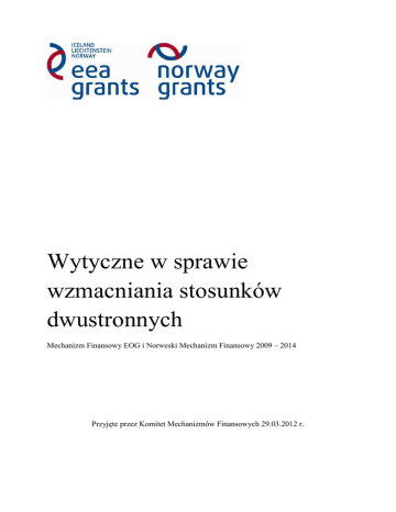 Wytyczne w sprawie wzmacniania stosunków dwustronnych Mechanizm Finansowy EOG i Norweski Mechanizm Finansowy 2009 – 2014 Przyjęte przez Komitet Mechanizmów Finansowych 29.03.2012 r. Mechanizm Finansowy EOG i Norweski Mechanizm Finansowy 2009 – 2014: Wytyczne w sprawie wzmacniania stosunków dwustronnych Spis treści 1. Cel wytycznych................................................................................................................................ 5 2. Założenia określające rezultat wzmacniania stosunków dwustronnych..................................... 6 3. 2.1 Definicja wzmacniania stosunków dwustronnych............................................................... 6 2.2 Oczekiwane wyniki współpracy dwustronnej ...................................................................... 6 2.3 Wyniki ramowe w skrócie..................................................................................................... 8 Fundusze współpracy dwustronnej na poziomie krajowym i programu...................................... 9 3.1 Fundusz współpracy dwustronnej na poziomie krajowym ................................................. 9 3.1.1 Cel funduszu ...................................................................................................................... 9 3.1.2 Plan działań ..................................................................................................................... 11 3.1.3 System wdrażania ........................................................................................................... 12 3.1.4 Konsultacje i zatwierdzenie planu działań ..................................................................... 13 3.2 Fundusz współpracy dwustronnej na poziomie programu................................................ 13 3.2.1 Środki na rozpoczęcie działalności (ang. seed money) – działanie „a”......................... 14 3.2.2 Tworzenie sieci współpracy i wymiana doświadczeń – działanie „b”........................... 15 3.3 Inne źródła finansowania – jak uniknąć pokrywania się źródeł finansowania ........................ 16 4. Partnerstwo w programach z darczyńcami.................................................................................. 17 4.1 4.1.1 Rola i główne zadania PPPD ........................................................................................... 17 4.1.2 Rola PPPD na etapie wdrażania programu .................................................................... 18 4.2 6. Umowy ramowe z PPPD...................................................................................................... 19 4.2.1 Plany działań PPPD.......................................................................................................... 19 4.2.2 Opis roli PPPD w propozycji programu .......................................................................... 19 4.3 5. Partnerzy programów z państw-darczyńców (PPPD)......................................................... 17 Komitet Współpracy............................................................................................................ 20 4.3.1 Ustanowienie Komitetu Współpracy ............................................................................. 20 4.3.2 PPPD występujący również jako partnerzy projektu – konflikt interesów?................. 22 Partnerstwo w projektach z darczyńcami.................................................................................... 23 5.1 Definicja partnera w projekcie z darczyńcami.................................................................... 23 5.2 Ułatwianie partnerstw w projektach z darczyńcami.......................................................... 24 5.3 Umowy w sprawie projektów partnerskich ....................................................................... 24 5.4 Aspekty finansowe .............................................................................................................. 25 Budowanie potencjału i współpraca instytucjonalna (ObP 25) .................................................. 27 6.1 Sugerowane działania w ObP 25......................................................................................... 27 6.2 Status partnera: PPPD a partner projektu.......................................................................... 28 Mechanizm Finansowy EOG i Norweski Mechanizm Finansowy 2009 – 2014: Wytyczne w sprawie wzmacniania stosunków dwustronnych 7. Mierzenie i raportowanie wyników dotyczących celu współpracy dwustronnej ...................... 29 7.1 Regularne raportowanie ..................................................................................................... 29 7.1.1 Raporty opisowe ............................................................................................................. 29 7.1.2 Wybór wskaźników dla badania stosunków dwustronnych ......................................... 30 7.1.2.1 Standardowe wskaźniki ilościowe ................................................................................... 31 7.1.2.2 Wskaźniki jakościowe....................................................................................................... 32 7.1.3 Informacje na temat partnerstwa w projekcie w DoRIS ............................................... 33 7.2 Przeglądy zewnętrzne ......................................................................................................... 34 7.3 Uwagi końcowe ................................................................................................................... 34 Załącznik 1 ............................................................................................................................................. 36 Załącznik 2 ............................................................................................................................................. 39 Mechanizm Finansowy EOG i Norweski 