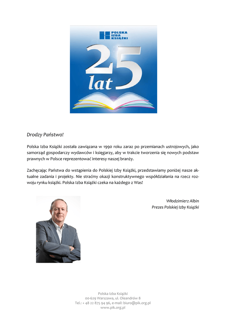 Drodzy Państwo! Polska Izba Książki została zawiązana w 1990 roku zaraz po przemianach ustrojowych, jako samorząd gospodarczy wydawców i księgarzy, aby w trakcie tworzenia się nowych podstaw prawnych w Polsce reprezentować interesy naszej branży. Zachęcając Państwa do wstąpienia do Polskiej Izby Książki, przedstawiamy poniżej nasze aktualne zadania i projekty. Nie straćmy okazji konstruktywnego współdziałania na rzecz rozwoju rynku książki. Polska Izba Książki czeka na każdego z Was! Włodzimierz Albin Prezes Polskiej Izby Książki Polska Izba Książki 00-629 Warszawa, ul. Oleandrów 8 Tel.: + 48 22 875 94 96, e-mail: [email protected] www.pik.org.pl PROJEKTY POLSKIEJ IZBY KSIĄŻKI 2015 Projekty legislacyjne Projekt Ustawy o książce Ustawa o jednolitej cenie książki – przez 12 miesięcy od jej wprowadzenia na rynek – ma za przedmiot regulację rynku wydawniczego i dystrybucji książek w Polsce. Celem ustawy jest wprowadzenie do polskiego porządku prawnego regulacji siostrzanej do funkcjonujących w innych państwach Europy, a umożliwiającej wydawcy i importerowi książek ustalenie, na określony ustawą czas, jednolitej ceny książek obowiązującej wszystkich sprzedawców końcowych – księgarzy, księgarnie sieciowe, sklepy wielobranżowe, kioski, itp. Jest to projekt poselski wypracowany przez Polską Izbę Książki, Izbę Księgarstwa Polskiego, Polskie Towarzystwo Wydawców Książek, Stowarzyszenie Wydawców Katolickich i inne organizacje środowiska książki, który uzyskał poparcie ministra kultury i dziedzictwa narodowego oraz dyrektora Instytutu Książki. Ambasadorami projektu są znani naukowcy i pisarze (prof. Jerzy Bralczyk, Olga Tokarczuk, Sylwia Chutnik, Małgorzata Gutowska-Adamczyk, Ignacy Karpowicz, Zygmunt Miłoszewski i Grzegorz Kasdepke) oraz znani wydawcy i księgarze. Na przełomie 2014 i 2015 roku przeprowadzono akcję zbierania podpisów pod listem otwartym do premier Ewy Kopacz „Polska książka potrzebuje ratunku”. List podpisało 2360 osób, w tym 70 znanych postaci kultury. Od kwietnia do września 2015 roku prowadzona była kampania medialna #ocalksiążki (Facebook, media tradycyjne i internetowe), budująca społeczne poparcie dla projektu, w ramach której kolejnych 1000 osób imiennie poparło projekt ustawy. 08.04.2015 r. projekt ustawy został wniesiony do Sejmu, w szybkim czasie otrzymał numer druku (3744) i został przesłany do Sejmowej Komisji Kultury i Środków Przekazu do dalszego procedowania. Ze względów czasowych (wybory parlamentarne 25.10.2015 r.) nie zakończono prac nad projektem. Redukcja liczby obowiązkowych egzemplarzy bibliotecznych (EO) Starania Izby o redukcję liczby obowiązkowych egzemplarzy bibliotecznych (17 egz.!) trwają od wielu lat. W wyniku pisma Izby z grudnia 2012 roku Rzecznik Praw Obywatelskich interweniował w tej sprawie w Ministerstwie Kultury i Dziedzictwa Narodowego. Minister Bogdan Zdrojewski na spotkaniu w maju 2013 roku zapewnił przedstawicieli PIK, że podjęto niezwłocznie prace nad redukcją liczby EO. Branża oczekiwała zmian jeszcze w 2012, względnie najpóźniej w roku 2013. Z informacji Departamentu Mecenatu Państwa (maj 2014 r.) wynikało, że projekt Rozporządzenia jest gotowy i będzie poddany konsultacji społecznej. W grudniu 2014 roku z inicjatywy Minister Małgorzaty Omilanowskiej doszło do spotkania wszystkich interesariuszy i ustalono optymalny Polska Izba Książki 00-629 Warszawa, ul. Oleandrów 8 Tel.: + 48 22 875 94 96, e-mail: [email protected] www.pik.org.pl wariant zmiany regulacji EO. Oczekiwane wdrożenie zmian zaakceptowanych przez przedstawicieli wydawców, bibliotek i samą Minister Kultury nie nastąpiło. Izba przygotowuje nową formę walki o tę sprawę. Udział w pracach Forum Prawa Autorskiego Departament Własności Intelektualnej i Mediów w MKIDN, w ścisłej współpracy z organizacjami pozarządowymi twórców, przemysłów kreatywnych oraz instytucjami kultury, rozpoczął w 2013 roku intensywne prace nad dostosowaniem niektórych zapisów prawa autorskiego do współczesnych wymogów. W pracach Forum Izba uczestniczy bardzo aktywnie, przedstawiając pisemne, szczegółowe stanowiska wobec zagadnień, których pilne uregulowanie jest w żywotnym interesie branży: Fundusz Promocji Twórczości – reforma systemu finansowania; Dzieła osierocone i Dzieła niedostępne w handlu – udrożnienie cyfrowego dostępu; Dozwolony użytek publiczny – konieczne nowe regulacje w dobie cyfrowej; w tym: projekt PIK szerszego udostępniania treści niewidomym poprzez bezpieczne, cyfrowe udostępnianie; Public Lending Right – forma wdrożenia w Polsce; Cywilne i karne środki egzekwowania prawa własności intelektualnej. Część ustalonych zmian procedowana była w 2015 r. w trybie pilnym ze względu na grożące Polsce kary za niewdrożenie Dyrektyw Unii Europejskiej. Tak zwana mała nowelizacja prawa autorskiego obejmująca m.in. wydłużenie okresu ochronnego dla dzieł muzycznych została uchwalona przez Sejm w kwietniu br. i podpisana przez Prezydenta RP 01.07.2015 r. Uchwalono także tzw. dużą nowelizację prawa autorskiego – Public Lending Right, likwidacja dotychczasowej formy Funduszu Promocji Twórczości, regulacja w sprawie dzieł osieroconych i pozostających poza handlem oraz licencjonowania przedruków prasowych –Prezydent RP podpisał ją w październiku br. Nadal nieuregulowane jest wdrożenie art. 8. 3 Dyrektywy UE o prawie autorskim, warunkującej prawidłową ochronę własności intelektualnej w sieci. PIK złoży skargę w tej sprawie do Komisji Europejskiej. Starania o wdrożenie zmian w Ustawie o Świadczeniu Usług Drogą Elektroniczną (UŚUDE) Wraz z innymi organizacjami twórców i przemysłów kreatywnych Izba uczestniczy w procesie ustalenia i wdrożenia koniecznych zmian w UŚUDE, które zapobiegałyby nielegalnemu obrotowi treści w cyfrowej przestrzeni. Projekt zmian prowadzi M