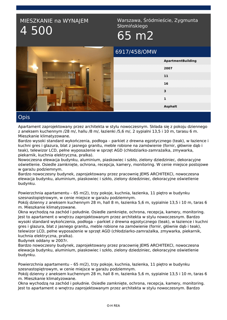 MIESZKANIE na WYNAJEM 4 500 Warszawa, Śródmieście, Zygmunta Słomińskiego 65 m2 6917/458/OMW ApartmentBuilding 2007 11 16 3 1 Asphalt Opis Apartament zaprojektowany przez architekta w stylu nowoczesnym. Składa się z pokoju dziennego z aneksem kuchennym /28 m/, hallu /8 m/, łazienki /5,6 m/, 2 sypialni 13,5 i 10 m, tarasu 6 m. Mieszkanie klimatyzowane. Bardzo wysoki standard wykończenia, podłoga – parkiet z drewna egzotycznego (teak), w łazience i kuchni gres i glazura, blat z jasnego granitu, meble robione na zamówienie (fornir, głównie dąb i teak), telewizor LCD, pełne wyposażenie w sprzęt AGD (chłodziarko-zamrażalka, zmywarka, piekarnik, kuchnia elektryczna, pralka). Nowoczesna elewacja budynku, aluminium, piaskowiec i szkło, zielony dziedziniec, dekoracyjne oświetlenie. Osiedle zamknięte, ochrona, recepcja, kamery, monitoring. W cenie miejsce postojowe w garażu podziemnym. Bardzo nowoczesny budynek, zaprojektowany przez pracownię JEMS ARCHITEKCI, nowoczesna elewacja budynku, aluminium, piaskowiec i szkło, zielony dziedziniec, dekoracyjne oświetlenie budynku. Powierzchnia apartamentu – 65 m(2), trzy pokoje, kuchnia, łazienka, 11 piętro w budynku szesnastopiętrowym, w cenie miejsce w garażu podziemnym. Pokój dzienny z aneksem kuchennym 28 m, hall 8 m, łazienka 5,6 m, sypialnie 13,5 i 10 m, taras 6 m. Mieszkanie klimatyzowane. Okna wychodzą na zachód i południe. Osiedle zamknięte, ochrona, recepcja, kamery, monitoring. Jest to apartament o wnętrzu zaprojektowanym przez architekta w stylu nowoczesnym. Bardzo wysoki standard wykończenia, podłoga – parkiet z drewna egzotycznego (teak), w łazience i kuchni gres i glazura, blat z jasnego granitu, meble robione na zamówienie (fornir, głównie dąb i teak), telewizor LCD, pełne wyposażenie w sprzęt AGD (chłodziarko-zamrażalka, zmywarka, piekarnik, kuchnia elektryczna, pralka). Budynek oddany w 2007r. Bardzo nowoczesny budynek, zaprojektowany przez pracownię JEMS ARCHITEKCI, nowoczesna elewacja budynku, aluminium, piaskowiec i szkło, zielony dziedziniec, dekoracyjne oświetlenie budynku. Powierzchnia apartamentu – 65 m(2), trzy pokoje, kuchnia, łazienka, 11 piętro w budynku szesnastopiętrowym, w cenie miejsce w garażu podziemnym. Pokój dzienny z aneksem kuchennym 28 m, hall 8 m, łazienka 5,6 m, sypialnie 13,5 i 10 m, taras 6 m. Mieszkanie klimatyzowane. Okna wychodzą na zachód i południe. Osiedle zamknięte, ochrona, recepcja, kamery, monitoring. Jest to apartament o wnętrzu zaprojektowanym przez architekta w stylu nowoczesnym. Bardzo O-H REA wysoki standard wykończenia, podłoga – parkiet z drewna egzotycznego (teak), w łazience i kuchni gres i glazura, blat z jasnego granitu, meble robione na zamówienie (fornir, głównie dąb i teak), telewizor LCD, pełne wyposażenie w sprzęt AGD (chłodziarko-zamrażalka, zmywarka, piekarnik, kuchnia elektryczna, pralka). Budynek oddany w 2007r. Bardzo nowoczesny budynek, zaprojektowany przez pracownię JEMS ARCHITEKCI, nowoczesna elewacja budynku, aluminium, piaskowiec i szkło, zielony dziedziniec, dekoracyjne oświetlenie budynku. Powierzchnia apartamentu – 65 m(2), trzy pokoje, kuchnia, łazienka, 11 piętro w budynku szesnastopiętrowym, w cenie miejsce w garażu podziemnym. Pokój dzienny z aneksem kuchennym 28 m, hall 8 m, łazienka 5,6 m, sypialnie 13,5 i 10 m, taras 6 m. Mieszkanie klimatyzowane. Okna wychodzą na zachód i południe. Osiedle zamknięte, ochrona, recepcja, kamery, monitoring. Jest to apartament o wnętrzu zaprojektowanym przez architekta w stylu nowoczesnym. Bardzo wysoki standard wykończenia, podłoga – parkiet z drewna egzotycznego (teak), w łazience i kuchni gres i glazura, blat z jasnego granitu, meble robione na zamówienie (fornir, głównie dąb i teak), telewizor LCD, pełne wyposażenie w sprzęt AGD (chłodziarko-zamrażalka, zmywarka, piekarnik, kuchnia elektryczna, pralka). Budynek oddany w 2007r. Bardzo nowoczesny budynek, zaprojektowany przez pracownię JEMS ARCHITEKCI, nowoczesna elewacja budynku, aluminium, piaskowiec i szkło, zielony dziedziniec, dekoracyjne oświetlenie budynku. Powierzchnia apartamentu – 65 m(2), trzy pokoje, kuchnia, łazienka, 11 piętro w budynku szesnastopiętrowym, w cenie miejsce w garażu podziemnym. Pokój dzienny z aneksem kuchennym 28 m, hall 8 m, łazienka 5,6 m, sypialnie 13,5 i 10 m, taras 6 m. Mieszkanie klimatyzowane. Okna wychodzą na zachód i południe. Osiedle zamknięte, ochrona, recepcja, kamery, monitoring. Jest to apartament o wnętrzu zaprojektowanym przez architekta w stylu nowoczesnym. Bardzo wysoki standard wykończenia, podłoga – parkiet z drewna egzotycznego (teak), w łazience i kuchni gres i glazura, blat z jasnego granitu, meble robione na zamówienie (fornir, głównie dąb i teak), telewizor LCD, pełne wyposażenie w sprzęt AGD (chłodziarko-zamrażalka, zmywarka, piekarnik, kuchnia elektryczna, pralka). Budynek oddany w 2007r. Powyższa oferta nie stanowi oferty handlowej w rozumieniu art. 66 § 1 kodeksu cywilnego oraz innych właściwych przepisów prawnych. Informacje umieszczone w ofertach przekazywane są przez właścicieli nieruchomości i mogą ulegać zmianom. Staramy się aby wszystkie oferty były jak najbardziej aktualne i odpowiadały stanowi rzeczywistemu. Elżbieta Bartosiak tel. +48 502 10 30 30 email: [email protected] O-H REA Powered by TCPDF (www.tcpdf.org)