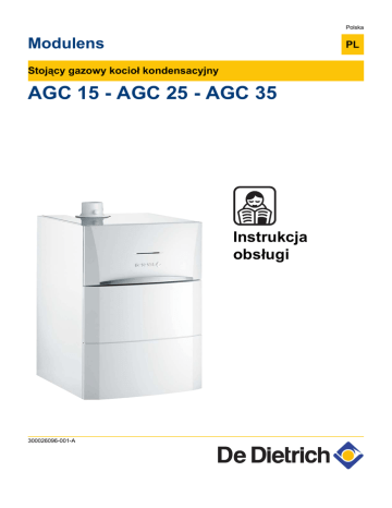 Polska Modulens PL Stojący gazowy kocioł kondensacyjny AGC 15 - AGC 25 - AGC 35 Instrukcja obsługi 300026096-001-A Spis treści 1 Wprowadzenie ............................................................................................4 1.1 Używane symbole .................................................4 1.2 Skróty .....................................................................4 1.3 Informacje ogólne .................................................5 1.3.1 1.3.2 1.3.3 1.4 2 3 Certyfikaty .............................................................6 Wskazówki dotyczące bezpieczeństwa oraz zalecenia ..........................7 2.1 Wskazówki dotyczące bezpieczeństwa ..............7 2.2 Zalecenia ...............................................................8 Opis .............................................................................................................9 3.1 Zasada działania ...................................................9 3.1.1 3.1.2 Główne elementy ................................................10 3.3 Konsola sterownicza ..........................................11 Opis przycisków ....................................................11 Opis wyświetlacza .................................................12 Nawigacja w menu ................................................15 Obsługa urządzenia .................................................................................16 4.1 Uruchomienie urządzenia ..................................16 4.2 Wyświetlenie mierzonych wartości ...................16 4.3 Zmiana nastaw ....................................................18 4.3.1 4.3.2 4.3.3 4.3.4 4.3.5 4.3.6 4.3.7 1 Regulacja gaz-powietrze .........................................9 Spalanie ..................................................................9 3.2 3.3.1 3.3.2 3.3.3 4 Odpowiedzialność producenta ................................5 Odpowiedzialność instalatora .................................5 Obowiązki użytkownika ...........................................5 Nastawa wartości zadanej temperatury ................18 Wybór trybu pracy .................................................19 Wymuszenie wytwarzania ciepłej wody użytkowej ..............................................................20 Nastawa kontrastu i podświetlenia wyświetlacza .........................................................20 Nastawa czasu/daty ..............................................21 Wybór programu ...................................................21 Dopasowanie programu do własnych potrzeb ..................................................................22 19/07/2011 - 300026096-001-A Spis treści 5 6 7 4.4 Wyłączenie instalacji ..........................................24 4.5 Ochrona przeciwzamarzaniowa ........................24 Kontrole i konserwacja ............................................................................26 5.1 Ogólne zalecenia ................................................26 5.2 Kontrole okresowe .............................................26 Wyszukiwanie usterek .............................................................................28 6.1 Cykl antytaktu .....................................................28 6.2 Komunikaty (kod typu Bxx lub Mxx) .................28 6.3 Usterki (kod typu Lxx lub Dxx) ..........................30 Dane techniczne .......................................................................................37 7.1 8 9 2 Dane techniczne .................................................37 Oszczędność energii ................................................................................38 8.1 Zalecenia odnośnie oszczędzania energii ........38 8.2 Zalecenia .............................................................38 Gwarancja .................................................................................................39 9.1 Informacje ogólne ...............................................39 9.2 Warunki gwarancji ..............................................39 19/07/2011 - 300026096-001-A 3 19/07/2011 - 300026096-001-A AGC 15 - AGC 25 - AGC 35 1 Wprowadzenie 1.1 Używane symbole 1. Wprowadzenie W niniejszej instrukcji informuje się o różnych poziomach zagrożenia, aby zwrócić uwagę użytkownika na konkretne ostrzeżenia. Dzięki temu chcielibyśmy zagwarantować użytkownikowi bezpieczeństwo, pomóc w unikaniu problemów i zapewnić prawidłową pracę urządzenia. NIEBEZPIECZEŃSTWO Ostrzeżenie przed zagrożeniem, które może prowadzić do ciężkiego uszkodzenia ciała. OSTRZEŻENIE Ostrzeżenie przed ryzykiem lekkiego uszkodzenia ciała. UWAGA Ryzyko szkód materialnych. Ważna informacja. ¼ Odsyłacz do innych instrukcji lub stron instrukcji. Przed zainstalowaniem i uruchomieniem urządzenia uważnie przeczytać dostarczone instrukcje obsługi. 1.2 Skróty 4 3CE: Przewód zbiorczy 4 c.w.u.: Ciepła woda użytkowa 4 Przełącznik scenariuszy: Przełącznik dla automatyzacji budynku, który przy wielu scenariuszach można przełączać centralnie 4 Hi : Wartość opałowa dolna 4 Hs : Wartość opałowa górna 4 PPS: polipropylen trudnopalny 4 PCU: Primary Control Unit - Pierwotna płyta sterowania 4 PSU: Parameter Storage Unit - Pamięć parametrów płyt PCU i SU 4 SCU: Secondary Control Unit - Wtórna płyta sterowania 4 SU: Safety Unit - Płyta zabezpieczeń 4 Z3D: 3-drogowy zawór mieszający 4 HL: High Load - Podgrzewacz c.w.u. z wymiennikiem płytowym 4 SL: Standard Load - Podgrzewacz c.w.u. z wężownicą grzejną 19/07/2011 - 300026096-001-A 4 1. Wprowadzenie AGC 15 - AGC 25 - AGC 35 4 SHL: Solar High Load - Solarny podgrzewacz c.w.u. z wymiennikiem płytowym 4 SSL: Solar Standard Load - Solarny podgrzewacz c.w.u. z wężownicą grzejną 1.3 Informacje ogólne 1.3.1. Odpowiedzialność producenta Nasze produkty są wytwarzane z dotrzymaniem istotnych wymagań różnych obowiązujących przepisów, z tego powodu dostarcza się je z oznakowaniem [