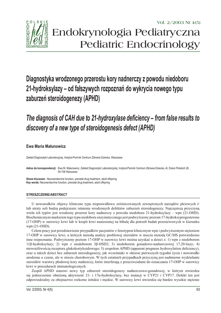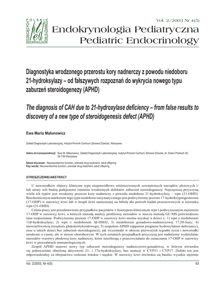 Vol. 2/2003 Nr 4(5) Endokrynologia Pediatryczna Pediatric Endocrinology Diagnostyka wrodzonego przerostu kory nadnerczy z powodu niedoboru 21-hydroksylazy – od fałszywych rozpoznań do wykrycia nowego typu zaburzeń steroidogenezy (APHD) The diagnosis of CAH due to 21-hydroxylase deficiency – from false results to discovery of a new type of steroidogenesis defect (APHD) Ewa Maria Małunowicz Zakład Diagnostyki Laboratoryjnej, Instytut-Pomnik Centrum Zdrowia Dziecka, Warszawa Adres do korespondencji: Ewa M. Małunowicz, Zakład Diagnostyki Laboratoryjnej, Instytut-Pomnik Centrum Zdrowia Dziecka, Al. Dzieci Polskich 20, 04-736 Warszawa Słowa kluczowe: Neuroendocrine function, prenatal drug treatment, adult offspring Key words: Neuroendocrine function, prenatal drug treatment, adult offspring STRESZCZENIE/ STRESZCZENIE/ABSTRACT U noworodków objawy kliniczne typu nieprawidłowo zróżnicowanych zewnętrznych narządów płciowych i/ lub utraty soli budzą podejrzenie istnienia wrodzonych defektów zaburzeń steroidogenezy. Najczęstszą przyczyną wielu ich typów jest wrodzony przerost kory nadnerczy z powodu niedoboru 21-hydroksylazy – wpn (21-OHD). Biochemicznym markerem tego typu niedoboru enzymatycznego jest podwyższony poziom 17-hydroksyprogesteronu (17-OHP) w surowicy krwi lub w kropli krwi naniesionej na bibułę dla potrzeb badań przesiewowych w kierunku wpn (21-OHD). Celem pracy jest przedstawienie przypadków pacjentów z fenotypem klinicznym wpn i podwyższonym stężeniem 17-OHP w surowicy krwi, u których metodą analizy profilowej steroidów w moczu metodą GC/MS potwierdzono inne rozpoznanie. Podwyższony poziom 17-OHP w surowicy krwi można uzyskać u dzieci z: 1) wpn z niedoborem 11β-hydroksylazy; 2) wpn z niedoborem 3β-HSD2; 3) niedoborem gonadowo-nadnerczowej 17,20-liazy; 4) niewrażliwością receptora glukokortykoidowego; 5) zespołem APHD (apparent pregnene hydroxylation deficiency), oraz u takich dzieci bez zaburzeń steroidogenezy, jak wcześniaki w okresie pierwszych tygodni życia i noworodki urodzone o czasie, ale w stresie chorobowym. W tych ostatnich przypadkach przyczyną jest nadmierne wydzielanie steroidów warstwy płodowej kory nadnerczy, które interferują z przeciwciałami do oznaczania 17-OHP w surowicy krwi w procedurach immunologicznych. Zespół APHD stanowi nowy typ zaburzeń steroidogenezy nadnerczowo-gonadowej, w którym stwierdza się jednocześnie obniżoną aktywność 21- i 17α-hydroksylazy, bez mutacji w CYP21 i CYP17. Defekt ten jest odpowiedzialny za obojnactwo rzekome żeńskie i męskie. W surowicy krwi stwierdza się bardzo wysokie stężenie Vol. 2/2003, Nr 4(5) 63 Praca przeglądowa Endokrynol. Ped., 2/2003;4(5):63-68 pregnenolonu, progesteronu, kortykosteronu, 17-OHP i 21-deoksykortyzolu, a w moczu ich metabolitów. Ponadto, pomimo prawidłowego podstawowego stężenia kortyzolu w surowicy krwi, brakuje prawidłowej odpowiedzi po ACTH. Istnieje hipoteza nieprawidłowej funkcji reduktazy P450 lub cytochromu b5, niezbędnych kofaktorów obu mikrosomalnych enzymów CYP17 i CYP21. In newborns presenting with genital ambiguity and/or salt loss inherited defects of steroidogenesis are suspected. Among them, the commonest cause is congenital adrenal hyperplasia due to 21-hydroxylase deficiency – CAH (21OHD). The increased level of 17-hydroxyprogesterone (17-OHP) in serum, or in case of newborn screening for CAH (21-OHD) in blood spot, is a biochemical marker of this defect. The aim of this work is to show at-risk CAH patients with the increased serum 17-OHP level, in which by urinary steroid profile analysis (GC/MS) other diagnosis has been confirmed. The increased level of serum 17-OHP can be observed also in children presenting with: 1) CAH due to 11β-hydroxylase deficiency; 2) CAH due to 3β-HSD2 deficiency; 3) adrenal-gonadal 17,20-lyase deficiency; 4) glucocorticoid receptor insensitivity; 5) APHD (apparent pregnene hydroxylation defect) syndrome and in children without steroidogenesis defects such as preterm newborns during the first weeks of life and born at-term newborns, but seriously ill. In regard to this last group of patients, the high amounts of fetal adrenal zone steroids are responsible for interference with antibodies used in 17-OHP immunoassays. The APHD syndrome is a new type of adrenal–gonadal steroidogenesis defect caused by combined 21- and 17α-hydroxylase deficiency, without CYP21 and CYP17 mutations. This defect is responsible for genital ambiguity in the both sex patients. The high secretion of serum pregnenolone, progesterone, corticosterone, 17-OHP and 21-deoxycortisol (in urine their metabolites) is observed. Basal serum cortisol is normal, but without response after ACTH stimulation. Abnormal function of P450 reductase or cytochrome b5, which are required co-factors of both microsomal CYP21 and CYP17 enzymes, is suspected. U noworodków objawy kliniczne typu nieprawidłowo zróżnicowanych zewnętrznych narządów płciowych (wirylizacja u 46, XX, a niepełna maskulinizacja u 46, XY osobników) i/lub zaburzenia równowagi wodno-elektrolitowej budzą podejrzenie istnienia wrodzonych defektów biosyntezy hormonów steroidowych. Najczęstszą przyczyną wielu ich typów (zaburzenia steroidogenezy nadnerczowej i/lub gonadowej, zaburzenia konwersji obwodowej steroidów, a w okresie płodowym zaburzenia steroidogenezy łożyskowej) jest tak zwany wrodzony przerost kory nadnerczy (wpn). Nazwa ta obejmuje grupę zaburzeń steroidogenezy nadnerczowej, przekazywanej przez zmutowane autosomalnie recesywne geny, które kodują jeden z enzymów niezbędny do syntezy kortyzolu (F). Brak syntezy F stymuluje wydzielanie ACTH, który pobudza zwiększone wytwarzanie prekursorów F, zwłaszcza znajdujących się bezpośrednio przed miejscem zablokowanej przemiany. Patofizjologia wpn manifestuje się już w okresie życia płodowego, powodując przerost kory nadnerczy u płodów pod koniec drugiego trymestru ci