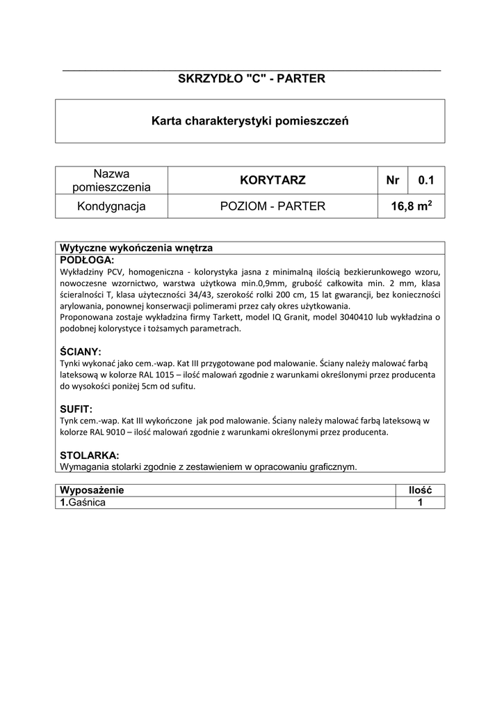 ___________________________________________________________________ SKRZYDŁO "C" - PARTER Karta charakterystyki pomieszczeń Nazwa pomieszczenia KORYTARZ Kondygnacja POZIOM - PARTER Nr 0.1 16,8 m2 Wytyczne wykończenia wnętrza PODŁOGA: Wykładziny PCV, homogeniczna - kolorystyka jasna z minimalną ilością bezkierunkowego wzoru, nowoczesne wzornictwo, warstwa użytkowa min.0,9mm, grubość całkowita min. 2 mm, klasa ścieralności T, klasa użyteczności 34/43, szerokość rolki 200 cm, 15 lat gwarancji, bez konieczności arylowania, ponownej konserwacji polimerami przez cały okres użytkowania. Proponowana zostaje wykładzina firmy Tarkett, model IQ Granit, model 3040410 lub wykładzina o podobnej kolorystyce i tożsamych parametrach. ŚCIANY: Tynki wykonać jako cem.-wap. Kat III przygotowane pod malowanie. Ściany należy malować farbą lateksową w kolorze RAL 1015 – ilość malowań zgodnie z warunkami określonymi przez producenta do wysokości poniżej 5cm od sufitu. SUFIT: Tynk cem.-wap. Kat III wykończone jak pod malowanie. Ściany należy malować farbą lateksową w kolorze RAL 9010 – ilość malowań zgodnie z warunkami określonymi przez producenta. STOLARKA: Wymagania stolarki zgodnie z zestawieniem w opracowaniu graficznym. Wyposażenie 1.Gaśnica Ilość 1 ___________________________________________________________________ SKRZYDŁO "C" - PARTER Karta charakterystyki pomieszczeń Nazwa pomieszczenia POMIESZCZENIE TECHNICZNE Kondygnacja POZIOM - PARTER Nr 0.2 4,3 m2 Wytyczne wykończenia wnętrza PODŁOGA: Wykładziny PCV, homogeniczna - kolorystyka jasna z minimalną ilością bezkierunkowego wzoru, nowoczesne wzornictwo, warstwa użytkowa min.0,9mm, grubość całkowita min. 2 mm, klasa ścieralności T, klasa użyteczności 34/43, szerokość rolki 200 cm, 15 lat gwarancji, bez konieczności arylowania, ponownej konserwacji polimerami przez cały okres użytkowania. Proponowana zostaje wykładzina firmy Tarkett, model IQ Granit, model 3040410 lub wykładzina o podobnej kolorystyce i tożsamych parametrach. ŚCIANY: Tynki wykonać jako cem.-wap. Kat III przygotowane pod malowanie. Ściany należy malować farbą emulsyjną w kolorze RAL 9010 – ilość malowań zgodnie z warunkami określonymi przez producenta. SUFIT: Tynk cem.-wap. Kat III wykończone jak pod malowanie. Ściany należy malować farbą emulsyjną w kolorze RAL 9010 – ilość malowań zgodnie z warunkami określonymi przez producenta. STOLARKA: Wymagania stolarki zgodnie z zestawieniem w opracowaniu graficznym. Wyposażenie 1.Wózek czyszczący 2.Spust wody 3.Wąż do zmywania wody Ilość 1 1 1 ___________________________________________________________________ SKRZYDŁO "C" - PARTER Karta charakterystyki pomieszczeń Nazwa pomieszczenia POKÓJ DZIENNY DO 20 OSÓB Kondygnacja POZIOM - PARTER Nr 0.3 50,0 m2 Wytyczne wykończenia wnętrza PODŁOGA: Parkiet tradycyjny, deski grubości 22mm (powierzchnia robocza 10mm), długość 30cm, układany w cegiełkę nieregularną. Proponowane drewno dębowe ze względu na duża wytrzymałość materiału, jednak szczegółowy dobór materiału zostanie ustalony na etapie wykonawstwa robót w porozumieniu z inwestorem. ŚCIANY: Tynki wykonać jako cem.-wap. Kat III przygotowane pod malowanie. Ściany należy malować farbą lateksową w kolorze RAL 1015 – ilość malowań zgodnie z warunkami określonymi przez producenta do wysokości poniżej 5cm od sufitu. SUFIT: Tynk cem.-wap. Kat III wykończone jak pod malowanie. Ściany należy malować farbą lateksową w kolorze RAL 9010 – ilość malowań zgodnie z warunkami określonymi przez producenta. STOLARKA: Wymagania stolarki zgodnie z zestawieniem w opracowaniu graficznym. Wyposażenie 1. Stół TIRAMISU, wymiar blatu 80x80, blat w kolorze jasnego drewna lub równoważny 2. Krzesło Mio, kolor czarny lub równoważne 3. Regał BILLY, okl.brzoza lub równoważne w kolorze jasnego drewna. Ilość 8 20 2 ___________________________________________________________________ SKRZYDŁO "C" - PARTER Karta charakterystyki pomieszczeń Nazwa pomieszczenia ZAPLECZE Kondygnacja POZIOM - PARTER Nr 0.3a 7,9 m2 Wytyczne wykończenia wnętrza PODŁOGA: Płytki gresowe nieszkliwione, rektyfikowane, format 60x60, gres pełny w masie, grubość min. 0,94 cm, powierzchnia naturalna, antypoślizgowość R10, kolorystyka - odcienie beżu, jasnej szarości, fuga o szerokości nie większej niż 2 mm w wykonaniu antybakteryjnym. Proponowane zostają płytki firmy NOWA GALA, model MM 01 lub płytki o podobnym kolorze i tożsamych parametrach. ŚCIANY: Płytki gresowe, polerowane, rektyfikowane, format 30x60, powierzchnia naturalna, grubość min. 9 mm, kolorystyka-odcienie beżu, bieli, jasnej szarości. Przy umywalkach i zlewach przewidzieć należy fartuchy z glazury. Wokół luster zaprojektowano opaskę obwodową z trzech kostek mozaiki szklanej w kolorze kremowym lub srebrnym. Fuga o szerokości nie większej niż 2 mm w wykonaniu antybakteryjnym. Proponowane zostają płytki firmy NOWA GALA, model MM 01 lub płytki o podobnym kolorze i tożsamych parametrach. Płytki należy układać do wysokości 2,1 m. Powyżej tej wysokości nałożyć tynk cem.-wap. kat. III i wykończyć jak pod malowanie i nałożyć farbę lateksową w kolorze RAL 9010 – ilość malowań zgodnie z warunkami określonymi przez producenta. SUFIT: Tynk cem.-wap. Kat III wykończone jak pod malowanie. Ściany należy malować farbą emulsyjną w kolorze RAL 9003 – ilość malowań zgodnie z warunkami określonymi przez producenta. STOLARKA: Wymagania stolarki zgodnie z zestawieniem Wyposażenie 1. Kosz na śmieci 30l FREEDOM stal połysk lub równoważne 2. Lodówka Indesit LI7 FF2 S B, w kolorze srebrnym lub równoważne 3. Zlewozmywak nakładany, PYRAMIS INTL, 2-komorowy 80x60cm, stal gładka lub równoważny 4. Dozownik na mydło firmy FANECO typ DUO 500 ml. lub równoważne 5. Kuchnia Amica 58IE2.320HTab (Xv) lub równoważna 6. Zmywarka 
