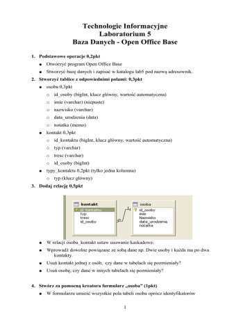 Technologie Informacyjne Laboratorium 5 Baza Danych - Open Office Base 1. Podstawowe operacje 0,2pkt ● Otworzyć program Open Office Base ● Stworzyć bazę danych i zapisać w katalogu lab5 pod nazwą adresownik. 2. Stworzyć tablice z odpowiednimi polami: 0,3pkt ● ● ● osoba 0,3pkt ○ id_osoby (bigInt, klucz główny, wartość automatyczna) ○ imie (varchar) (niepuste) ○ nazwisko (varchar) ○ data_urodzenia (data) ○ notatka (memo) kontakt 0,3pkt ○ id_kontaktu (bigInt, klucz główny, wartość automatyczna) ○ typ (varchar) ○ tresc (varchar) ○ id_osoby (bigInt) typy_kontaktu 0,2pkt (tylko jedna kolumna) ○ typ (klucz główny) 3. Dodaj relację 0,5pkt ● W relacji osoba_kontakt ustaw usuwanie kaskadowe. ● Wprowadź dowolne powiązane ze sobą dane np. Dwie osoby i każda ma po dwa kontakty. ● Usuń kontakt jednej z osób, czy dane w tabelach się pozmieniały? ● Usuń osobę, czy dane w innych tabelach się pozmieniały? 4. Stwórz za pomocną kreatora formularz „osoba” (1pkt) ● W formularzu umieść wszystkie pola tabeli osoba oprócz identyfikatorów 1 ● Dodaj pod-formularz bazujący na relacji 0,5pkt ● Pole typ zmień na „pole kombi” ● Dane pola „typ” wyświetlaj z tabeli typy_kontaktu 0,5pkt 5. Wprowadź następujące dane (nie kolumny): 0,5pkt ● ● tabela typy_kontaktu ○ adres ○ mail ○ telefon ○ faks ○ gadu gadu ○ skype ○ tlen ○ strona domowa Tabela osoby z odpowiednimi danymi w tabeli kontakt (można posłużyć się formularzem) ○ ○ ○ ○ Jan Nowak ur. 1970.01.01 notatka: „Wujek Janek” ■ telefon +48500123123 ■ adres: ul. Sienkiewicza 2/4 25-000 Kielce ■ gadu gadu: 123123 Anna Kowalska ur. 1971.02.02 notatka „Znajoma mamy” ■ telefon +48411231234 ■ adres: ul. Armi Czerwonej 4/23 25-432 Kielce Edward Ącki ur. 1980.03.03 ■ skype: edek ■ strona: edek.acki.pl Kuba Puchatek ur. 1945.04.04 notatka: „miś” ■ ○ ○ ○ Filemon Kot ur. 1965.05.05 notatka: „Poczciwy sierściuch” ■ mail: [email protected] ■ mail: [email protected] Bonifacy Kot ur 1939.06.06 notatka „Starszy krewniak Filemona” ■ telefon: +48323332221 ■ telefon: +48232223345 Wanda Coniechciałaniemca ■ ○ telefon: +485432109 sype: wandzia Rudolf Renifer 2 ■ ○ mail: [email protected] Kuba Rozpruwacz ur. 1979.09.09. notatka „Lepiej go unikać” ■ strona domowa kubus.pl 6. Kwerendy 2pkt ● ● Wykonaj kwerendę znajdującą zawierającą imię nazwisko oraz kontakt typu skype. Powinniśmy otrzymać takie dane 0,3pkt imię Nazwisko treść Edward Ącki edek Wanda Coniechciałaniemca wandzia Wykonaj kwerendę znajdującą imię, nazwisko datę urodzenia oraz kontakt osób które urodziły się po 1970.01.01. Powinniśmy otrzymać mniej więcej takie dane: 0,4pkt data_urodzenia imie Nazwisko tresc 2.02.1971 Anna Kowalska +48411231234 2.02.1971 Anna Kowalska ul. Armi Czerwonej 4/23 25-432 Kielce 3.03.1980 Edward Ącki edek ● 9.09.1979 Kuba Rozpruwacz kubus.pl Zrób kwerendę wszystkich danych w tabeli osoby i kontakty zapisz ją jako „wszystkie” 0,4pkt ● Zrób listę osób wraz z liczbą kontaktów jakie mają: 0,4pkt Ilość imie ● Nazwisko 3 Jan Nowak 2 Anna Kowalska 1 Edward Ącki 1 Kuba Puchatek 2 Filemon Kot 2 Bonifacy Kot 1 Wanda Coniechciałaniemca 1 Rudolf Renifer 1 Kuba Rozpruwacz Znajdź wszystkie osoby które nie mają numeru telefonu, powinniśmy otrzymać takie dane: 0,5pkt imie Nazwisko Edward Ącki Filemon Kot Wanda Coniechciałaniemca Rudolf Renifer 3 Kuba Rozpruwacz 7. Raport 0,5pkt ● Wykonaj raport dla zapytania „wszystkie”. Dane mają być pogrupowane po imieniu i nazwisku. Na raporcie nie powinno być identyfikatorów tablic. Nazwy pól powinny być pozmieniane. Np. typ_kontaktu -> Typ kontaktu. 4