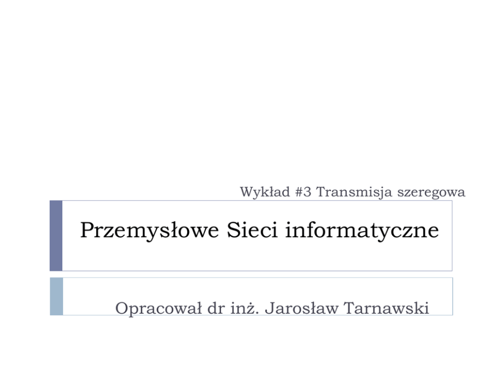 Wykład #3 Transmisja szeregowa Przemysłowe Sieci informatyczne Opracował dr inż. Jarosław Tarnawski Plan wykładu Transmisja szeregowa i równoległa Transmisja synchroniczna i asynchroniczna Simpleks, pół dupleks, pełny dupleks Eliminowanie bledów RS232 opis i charakterystyka RS422 RS485 USB Transmisja szeregowa i równoległa Przesyłana informacja zwykle grupowana jest w słowo – najczęściej bajt (8 bitów) Do przesłania jest znak ‘a’ w kodzie ascii oznaczony: Dziesiętnie: 97 Hexadecymalnie: 61 Binarnie: 01100001 Transmisja szeregowa i równoległa Znak ‘a’ binarnie 01100001 97 dziesiętnie MSB MSB LSB Wagi bitów 0*27 + 1*26 + 1*25 + 0*24 + 0*23 + 0*22 + 0*21 + 1*20=97 MSB – (ang. Most Significant Bit) Najbardziej znaczący bit – mający największą wagę LSB – (ang. Least Significant Bit) Najmniej znaczący bit – mający najmniejszą wagę Transmisja szeregowa i równoległa Transmisja równoległa - w jednej chwili przesyłane są wszystkie bity słowa, każdy innym kanałem transmisyjnym (np. przewodem) Transmisja szeregowa – przesyłane słowo dzielone jest na bity i wysyłana jest informacja bit po bicie jednym kanałem transmisyjnym Transmisja równoległa Znak ‘a’ Nadawca binarnie MSB 01100001 LSB N N N N N N N N 0 1 1 0 0 0 0 1 O O O O O O O O Odbiorca W jednej chwili przesyłane są wszystkie bity słowa, każdy innym kanałem transmisyjnym Transmisja szeregowa Znak ‘a’ binarnie MSB 01100001 LSB 01100001 Nadawca N O Odbiorca przesyłane słowo dzielone jest na bity i wysyłana jest informacja bit po bicie jednym kanałem transmisyjnym począwszy od LSB do MSB Transmisja równoległa Zalety Duża szybkość przesyłania danych (wszystkie bity przesyłane są jednocześnie) Prosta budowa układów transmisji Wady Duży koszt łączy (okablowanie) zwłaszcza przy dużych odległościach Na każdy bit słowa potrzebna jest odrębny kanał transmisyjny i para nadajnik odbiornik (modemy) zwielokrotniona wrażliwość na zakłócenia elektromagnetyczne Transmisja szeregowa Wady Mniejsza prędkość transmisji Złożona budowa układów nadawczo odbiorczych (realizujących podział i składanie słowa na/z bitów) Zalety Jeden kanał transmisyjny niski koszt okablowania mniejsza podatność na zakłócenia elektromagnetyczne Powszechność transmisji szeregowej Praktycznie łączność równoległa nadaje się do zastosowania wyłącznie na niewielkie (kilka metrów) odległości (głównie nietypowe rzadkie zastosowania) Ze względu na niższy koszt, większą odporność na zakłócenia i większy zasięg transmisja szeregowa jest powszechnie wykorzystywana w zastosowaniach PSI a także w technice komputerowej (np. USB) Transmisja synchroniczna Ma miejsce wtedy, gdy nadajnik i odbiornik taktowane są tym samym sygnałem zegarowym przekazywanym pomiędzy nadajnikiem i odbiornikiem Sygnał zegarowy Wyjście Sygnału zegarowego Nadawca Wyjście sygnału danych Wejście sygnału zegarowego Sygnał danych Odbiorca Wejście sygnału danych 01100001 Transmisja asynchroniczna Zegar nadajnika i odbiornika mają tą samą częstotliwość a sygnał zegarowy nie jest przesyłany pomiędzy odbiornikiem i nadajnikiem. Zamiast tego każde przesyłane słowo zawiera dodatkowe specjalne znaczniki początku i końca słowa Odbiorca S t o p S t a r t 01100001 Nadawca Transmisja asynchroniczna Wymaga: przesyłania nadmiarowych bitów przesyłanych w każdym słowie Zsychronizowania (nadania takich samych nastaw dotyczących prędkości transmisji, liczby bitów w słowie, liczby bitów stopu, kontroli parzystości w nadajniku i odbiorniku) Zaletą jest brak konieczności przesyłania sygnału zegarowego – stąd ogromna popularność takiego rozwiązania Kontrola przesyłanych danych Ze względu na potencjalne przekłamanie danych podczas transmisji do wysyłanego asynchronicznie słowa dodaje się tzw. bity kontrolne Mechanizm ten nazywany jest kontrolą parzystości/nieparzystości Dodaje on kolejny bit do każdego wysyłanego słowa (kod nadmiarowy) Kontrola parzystości/nieparzystości Przy kontroli parzystości uzupełniamy bit kontrolny tak, aby liczba 1 w słowie była parzysta Odbiorca S t a r t p a r z y s t o ś ć 011000011 S t o p Nadawca Rodzaje komunikacji Simpleks – w jedną stronę N O Półdupleks – w obie strony niejednocześnie N N O O Dupleks – w obie strony równocześnie N O O N RS232 rys historyczny RS232 (rok 1962) organizacja EIA (Electronic Industries Association) ustanawia standard wymiany danych pomiędzy urządzeniem końcowym dla danych DTE (Data Terminal Equipment), a urządzeniem komunikacyjnym dla danych DCE (Data Communication Equipment). RS232C (sierpień 1969) ustalono ostateczny standard Przedmiotem standardu RS232C jest zestaw sygnałów i ich funkcje Elektryczne charakterystyki sygnałów Rodzaj złączy Oryginalne zastosowanie RS232C DTE RS232C Modem DCE Sieć telefoniczna DTE RS232C Modem DCE Specyficzne połączenie nullmodem to umożliwia bezpośrednie połączenie dwóch urządzeń DTE bez użycia modemów Gniazda i wtyki w RS232C DB9 Wtyk męski gniazdo żeńskie DB25 Wtyk męski Gniazdo żeńskie Sygnały w RS232C - DB25 NAZ WA 1 GND 2 TXD 3 RXD 4 RTS 5 CTS 6 DSR 7 GND 8 DCD 9 10 11 STF PIN OPIS Masa ochronna Dane nadawane Dane odbierane Żądanie nadawania (włączenie nadajnika) Zwolnienie dla nadawania (gotowość nadawania) Gotowość danych (DCE) Masa (powrót) Wskaźnik sygnału linii odbiorczej Zarezerwowane Testowanie zbioru danych Wybież kanał transmisji 12 S.CD Wtórna DCD 13 S.CTS Wtórne zwolnienie dla nadawania 14 S.TXD Wtórnie nadawane dane 15 TCK Impulsy synchronizacji sygnału nadajnika (źródło DCE) 16 S.RXD Wtórnie odbierane dane 17 RCK 18 LL Impulsy synchronizacji sygnału odbiornika (źródło DCE) 19 S.RTS Wtórne żądanie nadawania 20 DTR 21 RL 22 RI 23 DSR 24 XCK 25 TI DTR terminal danych gotów (DTE) Wskaźnik jakości sygnału Wskaźnik dzwonka (wywołanie stacji) Selektor p
