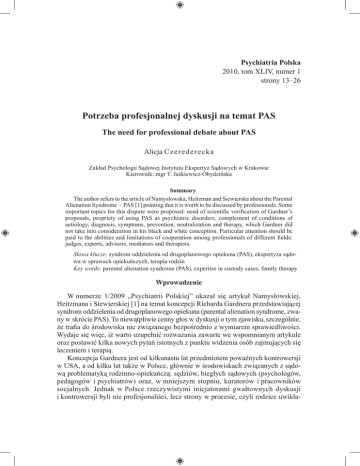 Psychiatria Polska 2010, tom XLIV, numer 1 strony 13–26 Potrzeba profesjonalnej dyskusji na temat PAS The need for professional debate about PAS Alicja Cze r e d e r e c k a Zakład Psychologii Sądowej Instytutu Ekspertyz Sądowych w Krakowie Kierownik: mgr T. Jaśkiewicz-Obydzińska Summary The author refers to the article of Namysłowska, Heitzman and Siewierska about the Parental Alienation Syndrome – PAS [1] pointing that it is worth to be discussed by professionals. Some important topics for this dispute were proposed: need of scientific verification of Gardner’s proposals, propriety of using PAS as psychiatric disorders, complement of conditions of aetiology, diagnosis, symptoms, prevention, neutralization and therapy, which Gardner did not take into consideration in his black and white conception. Particular attention should be paid to the abilities and limitations of cooperation among professionals of different fields: judges, experts, advisors, mediators and therapists. Słowa klucze: syndrom oddzielenia od drugoplanowego opiekuna (PAS), ekspertyza sądowa w sprawach opiekuńczych, terapia rodzin Key words: parental alienation syndrome (PAS), expertise in custody cases, family therapy Wprowadzenie W numerze 1/2009 „Psychiatrii Polskiej” ukazał się artykuł Namysłowskiej, Heitzmana i Siewierskiej [1] na temat koncepcji Richarda Gardnera przedstawiającej syndrom oddzielenia od drugoplanowego opiekuna (parental alienation syndrome, zwany w skrócie PAS). To niewątpliwie cenny głos w dyskusji o tym zjawisku, szczególnie, że trafia do środowiska nie związanego bezpośrednio z wymiarem sprawiedliwości. Wydaje się więc, iż warto uzupełnić rozważania zawarte we wspomnianym artykule oraz postawić kilka nowych pytań istotnych z punktu widzenia osób zajmujących się leczeniem i terapią. Koncepcja Gardnera jest od kilkunastu lat przedmiotem poważnych kontrowersji w USA, a od kilku lat także w Polsce, głównie w środowiskach związanych z sądową problematyką rodzinno-opiekuńczą: sędziów, biegłych sądowych (psychologów, pedagogów i psychiatrów) oraz, w mniejszym stopniu, kuratorów i pracowników socjalnych. Jednak w Polsce rzeczywistymi inicjatorami gwałtownych dyskusji i kontrowersji byli nie profesjonaliści, lecz strony w procesie, czyli rodzice uwikła- 14 Alicja Czerederecka ni w sądowy spór o uregulowanie opieki, u których rozpoznano indukowanie PAS u dzieci, lub ci, którzy sami „rozpoznali” indukowanie PAS przez swoich współmałżonków. Oczywiście pierwsi z nich występują z ostrą krytyką „pozbawionej walorów naukowych szkodliwej koncepcji”, drudzy zaś starają się rozpowszechniać informacje o PAS, żądając rozpoznania go i zastosowania radykalnych rozwiązań zaproponowanych przez Gardnera w konkretnych sprawach. Jedni i drudzy dążą do nagłośnienia swoich poglądów i przedstawienia swoich racji, wykorzystując do tego Internet oraz popularną prasę i interwencyjne reportaże w telewizji, co wiąże się ze swobodnym manipulowaniem argumentami, pogłębia emocjonalny ton argumentowania i nie służy rzeczowej dyskusji. Tymczasem koncepcja Gardnera poruszyła kilka problemów, które nie powinny zostać zlekceważone, nawet jeśli poziom naukowy i radykalizm propozycji budzi uzasadnione wątpliwości [2, 3, 4]. Warto podkreślić, że to zwaśnieni rodzice skłonili profesjonalistów do zabrania głosu w sprawie, żądając od Ministerstwa Sprawiedliwości ustosunkowania się do zasadności posługiwania się terminem PAS w opiniowaniu w sprawach opiekuńczych. Rozpoznawanie Pierwsza wątpliwość dotyczy celowości (zasadności) rozpoznawania PAS. Dla porządku warto raz jeszcze przypomnieć, iż przez PAS Gardner rozumiał zaburzenia prezentowane przez dziecko, które pod wpływem manipulacji ze strony jednego z opiekunów, zwykle pełniącego pierwszoplanową rolę w wychowaniu, przesadnie krytykuje i dewaluuje drugiego opiekuna, nie przejawiając przy tym poczucia winy i wstydu; niezbędnym warunkiem stwierdzenia PAS jest przekonanie dziecka, iż wyraża własne opinie. Gardner podkreślał, że zaburzenia te ujawniają się niemal wyłącznie w kontekście sądowej walki pomiędzy rodzicami o uregulowanie opieki. Czy zjawisko takie rzeczywiście istnieje, tzn., czy można wskazać ścisłą zależność pomiędzy indukowaniem przez głównego opiekuna niechęci dziecka do drugiego opiekuna a wskazywanymi przez Gardnera objawami występującymi u dziecka? Czy jego częstość jest na tyle znacząca, aby w ogóle poświęcać mu uwagę? Specjaliści zajmujący się problematyką rodzinną znają dobrze zjawisko angażowania dziecka w konflikt pomiędzy rodzicami, wzbudzania u niego konfliktu lojalności, skłaniania do wchodzenia w koalicje przeciw drugiemu opiekunowi, „przeciągania go na swoją stronę”. Wielokrotnie podkreśla się w literaturze psychologicznej, iż adaptację do warunków kryzysu, jakim jest rozwód, utrudnia dziecku nie tyle sam fakt rozstania rodziców, co przedłużanie przez nich konfliktu [5, 6], angażowanie go w ten konflikt, manipulowanie nim oraz indoktrynacja – wymierzona w drugiego opiekuna [7, 8, 9, 10, 11, 12, 13, 14, 15, 16, 17, 18, 19, 20]. Dzieje się to nie tylko w rodzinach rozbitych, ale także pełnych, lecz wewnętrznie skonfliktowanych. Kiedy rodzice rozstają się ze sobą i nie są w stanie uzgodnić kwestii dotyczących podziału praw i obowiązków wychowawczych i z tego powodu wnoszą sprawę do sądu, konflikt narasta w związku z dokonywaną oceną kompetencji wychowawczych każdego z nich. Potrzeba profesjonalnej dyskusji na temat PAS 15 Niejednokrotnie, dodatkowo motywowani przez adwokatów, podejmują rywalizację, eskalując konflikt, w który zazwyczaj angażują swoje dzieci. Główny opiekun, czyli osoba, z którą pozostaje dziecko, dysponuje znacznie większymi możliwościami oddziaływania na nie i zwykle z tych możliwości korzysta, n