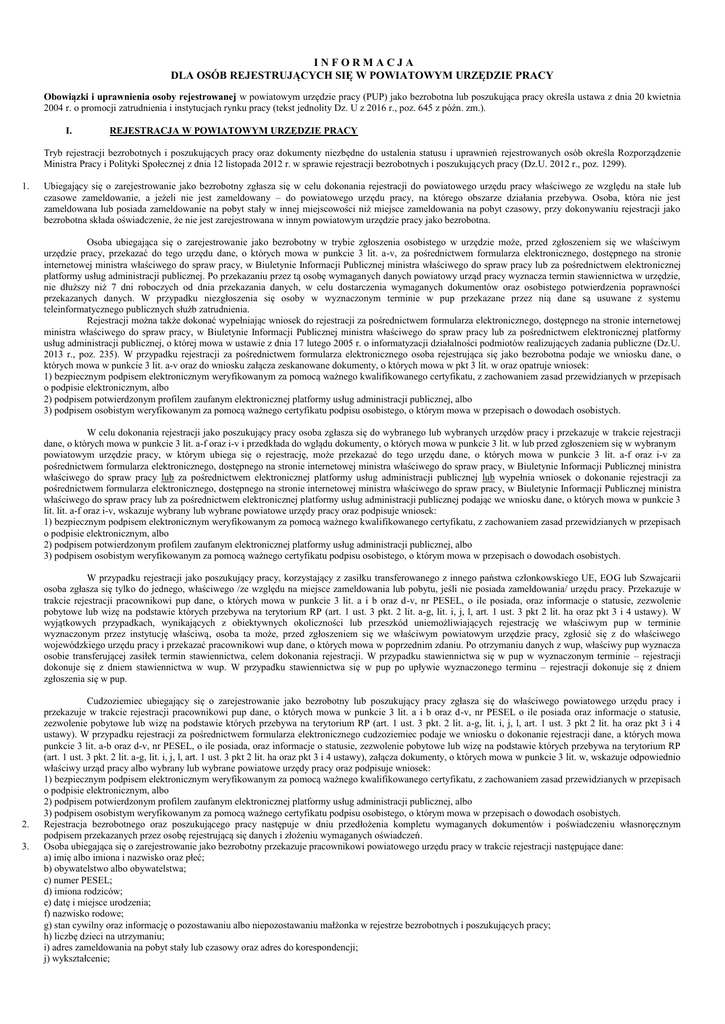 INFORMACJA DLA OSÓB REJESTRUJĄCYCH SIĘ W POWIATOWYM URZĘDZIE PRACY Obowiązki i uprawnienia osoby rejestrowanej w powiatowym urzędzie pracy (PUP) jako bezrobotna lub poszukująca pracy określa ustawa z dnia 20 kwietnia 2004 r. o promocji zatrudnienia i instytucjach rynku pracy (tekst jednolity Dz. U z 2016 r., poz. 645 z późn. zm.). I. REJESTRACJA W POWIATOWYM URZĘDZIE PRACY Tryb rejestracji bezrobotnych i poszukujących pracy oraz dokumenty niezbędne do ustalenia statusu i uprawnień rejestrowanych osób określa Rozporządzenie Ministra Pracy i Polityki Społecznej z dnia 12 listopada 2012 r. w sprawie rejestracji bezrobotnych i poszukujących pracy (Dz.U. 2012 r., poz. 1299). 1. Ubiegający się o zarejestrowanie jako bezrobotny zgłasza się w celu dokonania rejestracji do powiatowego urzędu pracy właściwego ze względu na stałe lub czasowe zameldowanie, a jeżeli nie jest zameldowany – do powiatowego urzędu pracy, na którego obszarze działania przebywa. Osoba, która nie jest zameldowana lub posiada zameldowanie na pobyt stały w innej miejscowości niż miejsce zameldowania na pobyt czasowy, przy dokonywaniu rejestracji jako bezrobotna składa oświadczenie, że nie jest zarejestrowana w innym powiatowym urzędzie pracy jako bezrobotna. Osoba ubiegająca się o zarejestrowanie jako bezrobotny w trybie zgłoszenia osobistego w urzędzie może, przed zgłoszeniem się we właściwym urzędzie pracy, przekazać do tego urzędu dane, o których mowa w punkcie 3 lit. a-v, za pośrednictwem formularza elektronicznego, dostępnego na stronie internetowej ministra właściwego do spraw pracy, w Biuletynie Informacji Publicznej ministra właściwego do spraw pracy lub za pośrednictwem elektronicznej platformy usług administracji publicznej. Po przekazaniu przez tą osobę wymaganych danych powiatowy urząd pracy wyznacza termin stawiennictwa w urzędzie, nie dłuższy niż 7 dni roboczych od dnia przekazania danych, w celu dostarczenia wymaganych dokumentów oraz osobistego potwierdzenia poprawności przekazanych danych. W przypadku niezgłoszenia się osoby w wyznaczonym terminie w pup przekazane przez nią dane są usuwane z systemu teleinformatycznego publicznych służb zatrudnienia. Rejestracji można także dokonać wypełniając wniosek do rejestracji za pośrednictwem formularza elektronicznego, dostępnego na stronie internetowej ministra właściwego do spraw pracy, w Biuletynie Informacji Publicznej ministra właściwego do spraw pracy lub za pośrednictwem elektronicznej platformy usług administracji publicznej, o której mowa w ustawie z dnia 17 lutego 2005 r. o informatyzacji działalności podmiotów realizujących zadania publiczne (Dz.U. 2013 r., poz. 235). W przypadku rejestracji za pośrednictwem formularza elektronicznego osoba rejestrująca się jako bezrobotna podaje we wniosku dane, o których mowa w punkcie 3 lit. a-v oraz do wniosku załącza zeskanowane dokumenty, o których mowa w pkt 3 lit. w oraz opatruje wniosek: 1) bezpiecznym podpisem elektronicznym weryfikowanym za pomocą ważnego kwalifikowanego certyfikatu, z zachowaniem zasad przewidzianych w przepisach o podpisie elektronicznym, albo 2) podpisem potwierdzonym profilem zaufanym elektronicznej platformy usług administracji publicznej, albo 3) podpisem osobistym weryfikowanym za pomocą ważnego certyfikatu podpisu osobistego, o którym mowa w przepisach o dowodach osobistych. W celu dokonania rejestracji jako poszukujący pracy osoba zgłasza się do wybranego lub wybranych urzędów pracy i przekazuje w trakcie rejestracji dane, o których mowa w punkcie 3 lit. a-f oraz i-v i przedkłada do wglądu dokumenty, o których mowa w punkcie 3 lit. w lub przed zgłoszeniem się w wybranym powiatowym urzędzie pracy, w którym ubiega się o rejestrację, może przekazać do tego urzędu dane, o których mowa w punkcie 3 lit. a-f oraz i-v za pośrednictwem formularza elektronicznego, dostępnego na stronie internetowej ministra właściwego do spraw pracy, w Biuletynie Informacji Publicznej ministra właściwego do spraw pracy lub za pośrednictwem elektronicznej platformy usług administracji publicznej lub wypełnia wniosek o dokonanie rejestracji za pośrednictwem formularza elektronicznego, dostępnego na stronie internetowej ministra właściwego do spraw pracy, w Biuletynie Informacji Publicznej ministra właściwego do spraw pracy lub za pośrednictwem elektronicznej platformy usług administracji publicznej podając we wniosku dane, o których mowa w punkcie 3 lit. lit. a-f oraz i-v, wskazuje wybrany lub wybrane powiatowe urzędy pracy oraz podpisuje wniosek: 1) bezpiecznym podpisem elektronicznym weryfikowanym za pomocą ważnego kwalifikowanego certyfikatu, z zachowaniem zasad przewidzianych w przepisach o podpisie elektronicznym, albo 2) podpisem potwierdzonym profilem zaufanym elektronicznej platformy usług administracji publicznej, albo 3) podpisem osobistym weryfikowanym za pomocą ważnego certyfikatu podpisu osobistego, o którym mowa w przepisach o dowodach osobistych. W przypadku rejestracji jako poszukujący pracy, korzystający z zasiłku transferowanego z innego państwa członkowskiego UE, EOG lub Szwajcarii osoba zgłasza się tylko do jednego, właściwego /ze względu na miejsce zameldowania lub pobytu, jeśli nie posiada zameldowania/ urzędu pracy. Przekazuje w trakcie rejestracji pracownikowi pup dane, o których mowa w punkcie 3 lit. a i b oraz d-v, nr PESEL, o ile posiada, oraz informacje o statusie, zezwolenie pobytowe lub wizę na podstawie których przebywa na terytorium RP (art. 1 ust. 3 pkt. 2 lit. a-g, lit. i, j, l, art. 1 ust. 3 pkt 2 lit. ha oraz pkt 3 i 4 ustawy). W wyjątkowych przypadkach, wynikających z obiektywnych okoliczności lub przeszkód uniemożliwiających rejestrację we właściwym pup w terminie wyznaczonym przez instytucję właściwą, osoba ta może, przed zgłoszeniem się we właściwym powiatowym urzędzie pracy, zgłosić się z