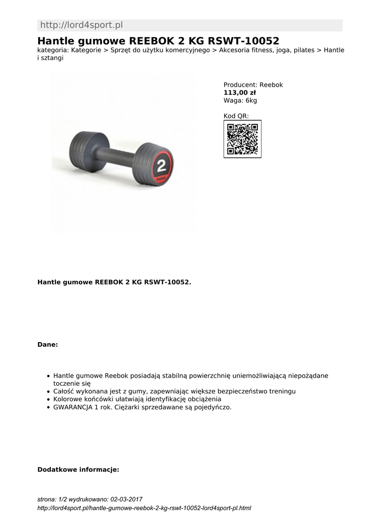 http://lord4sport.pl Hantle gumowe REEBOK 2 KG RSWT-10052 kategoria: Kategorie > Sprzęt do użytku komercyjnego > Akcesoria fitness, joga, pilates > Hantle i sztangi Producent: Reebok 113,00 zł Waga: 6kg Kod QR: Hantle gumowe REEBOK 2 KG RSWT-10052. Dane: Hantle gumowe Reebok posiadają stabilną powierzchnię uniemożliwiającą niepożądane toczenie się Całość wykonana jest z gumy, zapewniając większe bezpieczeństwo treningu Kolorowe końcówki ułatwiają identyfikację obciążenia GWARANCJA 1 rok. Ciężarki sprzedawane są pojedyńczo. Dodatkowe informacje: strona: 1/2 wydrukowano: 02-03-2017 http://lord4sport.pl/hantle-gumowe-reebok-2-kg-rswt-10052-lord4sport-pl.html Towar na zamówienie - przed zakupem prosimy o kontakt Koszt transportu i montażu ustalamy indywidualnie Czas oczekiwania 7 dni roboczych Nie znalazłeś produktu który Cię interesuje ? Skontaktuj się z nami tel. 32-270-77-22 - postaramy się rozwiązać ten problem strona: 2/2 wydrukowano: 02-03-2017 http://lord4sport.pl/hantle-gumowe-reebok-2-kg-rswt-10052-lord4sport-pl.html