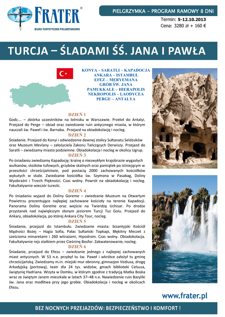 PIELGRZYMKA - PROGRAM RAMOWY 8 DNI Termin: 5-12.10.2013 Cena: 3280 zł + 160 € KONYA – SARATLI – KAPADOCJA ANKARA – ISTAMBUŁ EFEZ – MERYEMANA GRÓB ŚW. JANA PAMUKKALE – HIERAPOLIS NEKROPOLIS – LAODYCEA PERGE – ANTALYA DZIEŃ 1 Godz…. – zbiórka uczestników na lotnisku w Warszawie. Przelot do Antalyi. Przejazd do Perge – obiad oraz zwiedzanie ruin antycznego miasta, w którym nauczali św. Paweł i św. Barnaba. Przejazd na obiadokolację i nocleg. DZIEŃ 2 Śniadanie. Przejazd do Konyi i odwiedzenie dawnej stolicy Sułtanatu Seldżuków oraz Muzeum Mevlany – założyciela Zakonu Tańczących Derwiszy. Przejazd do Saratli – zwiedzamy miasto podziemne. Obiadokolacja i nocleg w okolicy Ugrup. DZIEŃ 3 Po śniadaniu zwiedzamy Kapadocję: krainę o niezwykłym krajobrazie wygasłych wulkanów, stożków tufowych, grzybów skalnych oraz pamiątek po istniejącym w przeszłości chrześcijaństwie, pod postacią 2000 zachowanych kościółków wykutych w skale. Zwiedzanie kościółka św. Szymona w Pasabag, Doliny Wyobraźni i Trzech Piękności. Czas wolny. Powrót na obiadokolację i nocleg. Fakultatywnie wieczór turecki. DZIEŃ 4 Po śniadaniu wyjazd do Doliny Goreme – zwiedzanie Muzeum na Otwartym Powietrzu prezentujące najlepiej zachowane kościoły na terenie Kapadocji. Panorama Doliny Goreme oraz wejście na Twierdzę Uchisar. Po drodze przystanek nad największym słonym jeziorem Turcji Tuz Golu. Przejazd do Ankary, obiadokolacja, po której Ankara City Tour, nocleg. DZIEŃ 5 Śniadanie, przejazd do Istambułu. Zwiedzanie miasta: bizantyjski Kościół Mądrości Bożej – Hagia Sofia, Pałac Sułtański Topkapi, Błękitny Meczet z sześcioma minaretami i 260 witrażami, Hipodrom. Czas wolny. Obiadokolacja. Fakultatywnie rejs statkiem przez Cieśninę Bosfor. Zakwaterowanie, nocleg. DZIEŃ 6 Śniadanie, przejazd do Efezu – zwiedzanie jednego z najlepiej zachowanych miast antycznych. W 53 n.e. przybył tu św. Paweł i wkrótce założył tu gminę chrześcijańską. Zwiedzamy m.in. miejski mur obronny, gimnazjon Vediusa, drogę Arkadyjską (portową), teatr dla 24 tys. widzów, gmach biblioteki Celsusa, świątynię Hadriana. Wizyta w Domku, w którym zgodnie z tradycją Matka Boska wraz ze świętym Janem mieszkała w latach 37–48 n.e. Nawiedzenie ruin Bazyliki św. Jana oraz modlitwa przy jego grobie. Obiadokolacja i nocleg w okolicach Efezu. PIELGRZYMKA - PROGRAM RAMOWY 8 DNI Termin: 5-12.10.2013 Cena: 3280 zł + 160 € OSOBY, KTÓRE PODRÓŻOWAŁY Z BTP „FRATER” - UPUST 5%; DLA NICH CENA PIELGRZYMKI: 3116 ZŁ + 160 € DZIEŃ 7 Po śniadaniu pobyt na tarasach wapiennych w Pamukkale, nazywanych ze względu na swój kolor „Bawełnianą Twierdzą”. Fakultatywnie – kąpiel w basenie Kleopatry z wodą termalną. Zwiedzanie starożytnego uzdrowiska Hierapolis z największą nekropolią w Anatolii. Czas wolny. Przejazd do Laodycei – zwiedzamy starożytne kolosy, pozostałości stadionu z czasów Wespazjana oraz ruiny dwóch teatrów z czasów Hadriana. Przejazd na obiadokolację i nocleg w okolice Antalyi. DZIEŃ 8 Przydział pakietów śniadaniowych, po którym transfer na lotnisko, Odprawa – wylot. Przelot do Polski. Lądowanie, zakończenie pielgrzymki. Godziny zbiórki , godziny odlotów i przylotów na Lotniskach w Warszawie i w Antalyi zostaną podane pod koniec stycznia 2013. Loty będą realizowane w soboty. Transfer na trasie Łódź – Lotnisko Okęcie Warszawa – Łodź za dodatkową opłatą ok. 70 zł/os. Maksymalna liczebność grupy pielgrzymów z opiekunem duchowym – 45 osób + 1 osoba – pilot. Po uzgodnieniu terminu pielgrzymki zakładamy rezerwację lotu. W ciągu ok. 7 dni musimy wpłacić zaliczkę 500 zł/os., aby rezerwacja nie uległa kasacji. • przelot na trasie Polska – Turcja – Polska wraz z opłatami lotniskowymi • przejazd luksusowym autokarem przez wszystkie dni pobytu w Turcji, • 7 noclegów w hotelach ***, pokoje 2-3 os. z łazienkami, • 7 śniadań, 7 obiadokolacji • opiekę i informację turystyczną pilota • opiekę duchową kapłana; • ubezpieczenie KL + Assistance wraz z KL chorób przewlekłych do 10 000 € i NNW do 1300 € • na bilety wstępu, przewodników lokalnych, wizę turecką, napiwki i inne wydatki związane z programem należy posiadać około 160 € - kwota ta nie podlega rozliczeniu; • zapisy: wpłata 500 zł , dopłata 30 dni przed wyjazdem; • dokument niezbędny do wyjazdu: paszport. • program jest ramowy i może ulec drobnym zmianom. Zapisu dokonujemy tylko i wyłącznie w biurze Frater do 31 stycznia 2013 według adresu podanego w tym programie z wpłatą 500 zł. Konto Bankowe: Bank Millenium S.A. 76 1160 2202 0000 0000 4190 3630