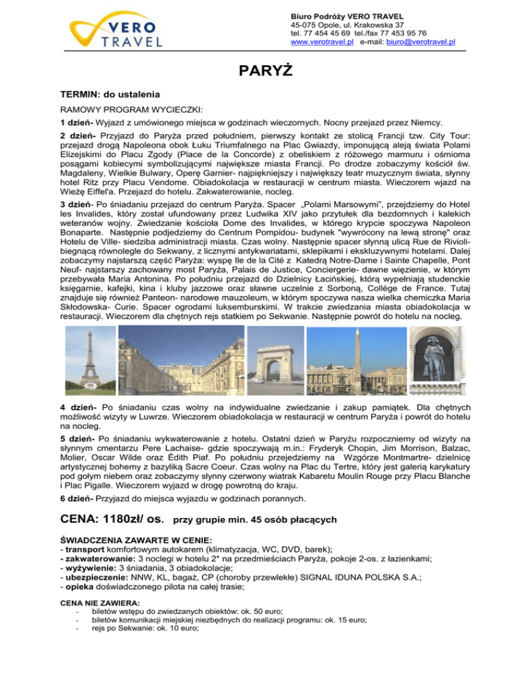 Biuro Podróży VERO TRAVEL 45-075 Opole, ul. Krakowska 37 tel. 77 454 45 69 tel./fax 77 453 95 76 www.verotravel.pl e-mail: [email protected] PARYŻ TERMIN: do ustalenia RAMOWY PROGRAM WYCIECZKI: 1 dzień- Wyjazd z umówionego miejsca w godzinach wieczornych. Nocny przejazd przez Niemcy. 2 dzień- Przyjazd do Paryża przed południem, pierwszy kontakt ze stolicą Francji tzw. City Tour: przejazd drogą Napoleona obok Łuku Triumfalnego na Plac Gwiazdy, imponującą aleją świata Polami Elizejskimi do Placu Zgody (Place de la Concorde) z obeliskiem z różowego marmuru i ośmioma posągami kobiecymi symbolizującymi największe miasta Francji. Po drodze zobaczymy kościół św. Magdaleny, Wielkie Bulwary, Operę Garnier- najpiękniejszy i największy teatr muzycznym świata, słynny hotel Ritz przy Placu Vendome. Obiadokolacja w restauracji w centrum miasta. Wieczorem wjazd na Wieżę Eiffel'a. Przejazd do hotelu. Zakwaterowanie, nocleg. 3 dzień- Po śniadaniu przejazd do centrum Paryża. Spacer „Polami Marsowymi”, przejdziemy do Hotel les Invalides, który został ufundowany przez Ludwika XIV jako przytułek dla bezdomnych i kalekich weteranów wojny. Zwiedzanie kościoła Dome des Invalides, w którego krypcie spoczywa Napoleon Bonaparte. Następnie podjedziemy do Centrum Pompidou- budynek "wywrócony na lewą stronę" oraz Hotelu de Ville- siedziba administracji miasta. Czas wolny. Następnie spacer słynną ulicą Rue de Riviolibiegnącą równolegle do Sekwany, z licznymi antykwariatami, sklepikami i ekskluzywnymi hotelami. Dalej zobaczymy najstarszą część Paryża: wyspę Ile de la Cité z Katedrą Notre-Dame i Sainte Chapelle, Pont Neuf- najstarszy zachowany most Paryża, Palais de Justice, Conciergerie- dawne więzienie, w którym przebywała Maria Antonina. Po południu przejazd do Dzielnicy Łacińskiej, którą wypełniają studenckie księgarnie, kafejki, kina i kluby jazzowe oraz sławne uczelnie z Sorboną, Collége de France. Tutaj znajduje się również Panteon- narodowe mauzoleum, w którym spoczywa nasza wielka chemiczka Maria Skłodowska- Curie. Spacer ogrodami luksemburskimi. W trakcie zwiedzania miasta obiadokolacja w restauracji. Wieczorem dla chętnych rejs statkiem po Sekwanie. Następnie powrót do hotelu na nocleg. 4 dzień- Po śniadaniu czas wolny na indywidualne zwiedzanie i zakup pamiątek. Dla chętnych możliwość wizyty w Luwrze. Wieczorem obiadokolacja w restauracji w centrum Paryża i powrót do hotelu na nocleg. 5 dzień- Po śniadaniu wykwaterowanie z hotelu. Ostatni dzień w Paryżu rozpoczniemy od wizyty na słynnym cmentarzu Pere Lachaise- gdzie spoczywają m.in.: Fryderyk Chopin, Jim Morrison, Balzac, Molier, Oscar Wilde oraz Édith Piaf. Po południu przejedziemy na Wzgórze Montmartre- dzielnicę artystycznej bohemy z bazyliką Sacre Coeur. Czas wolny na Plac du Tertre, który jest galerią karykatury pod gołym niebem oraz zobaczymy słynny czerwony wiatrak Kabaretu Moulin Rouge przy Placu Blanche i Plac Pigalle. Wieczorem wyjazd w drogę powrotną do kraju. 6 dzień- Przyjazd do miejsca wyjazdu w godzinach porannych. CENA: 1180zł/ os. przy grupie min. 45 osób płacących ŚWIADCZENIA ZAWARTE W CENIE: - transport komfortowym autokarem (klimatyzacja, WC, DVD, barek); - zakwaterowanie: 3 noclegi w hotelu 2* na przedmieściach Paryża, pokoje 2-os. z łazienkami; - wyżywienie: 3 śniadania, 3 obiadokolacje; - ubezpieczenie: NNW, KL, bagaż, CP (choroby przewlekłe) SIGNAL IDUNA POLSKA S.A.; - opieka doświadczonego pilota na całej trasie; CENA NIE ZAWIERA: biletów wstępu do zwiedzanych obiektów: ok. 50 euro; biletów komunikacji miejskiej niezbędnych do realizacji programu: ok. 15 euro; rejs po Sekwanie: ok. 10 euro; Biuro Podróży VERO TRAVEL 45-075 Opole, ul. Krakowska 37 tel. 77 454 45 69 tel./fax 77 453 95 76 www.verotravel.pl e-mail: [email protected] - fakultatywnie uroczysta obiadokolacja z winem i muzyką na żywo (dopłata do zwykłej obiadokolacji 25 euro/os.)