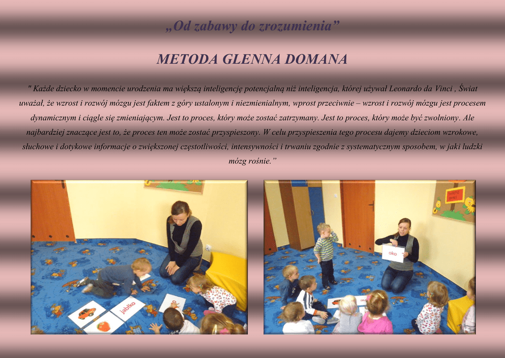 „Od zabawy do zrozumienia” METODA GLENNA DOMANA " Każde dziecko w momencie urodzenia ma większą inteligencję potencjalną niż inteligencja, której używał Leonardo da Vinci , Świat uważał, że wzrost i rozwój mózgu jest faktem z góry ustalonym i niezmienialnym, wprost przeciwnie – wzrost i rozwój mózgu jest procesem dynamicznym i ciągle się zmieniającym. Jest to proces, który może zostać zatrzymany. Jest to proces, który może być zwolniony. Ale najbardziej znaczące jest to, że proces ten może zostać przyspieszony. W celu przyspieszenia tego procesu dajemy dzieciom wzrokowe, słuchowe i dotykowe informacje o zwiększonej częstotliwości, intensywności i trwaniu zgodnie z systematycznym sposobem, w jaki ludzki mózg rośnie.” Im wcześniej zacznie się proces usprawniania lub nauczania dziecka tym będzie on łatwiejszy, szybszy i przyniesie wiele sukcesów, inteligencja to w zasadzie produkt trzech zjawisk: umiejętności czytania, umiejętności matematyki, pewien zasób wiedzy encyklopedycznej. Metody nauczania małych dzieci " Małe dzieci raczej uczą się niż bawią lub jedzą. Można je nauczyć absolutnie wszystkiego, co prezentuje się im w sposób rzetelny za pomocą faktów - fakty są podstawą wiedzy " Glenn Doman Wprowadzenie procesu nauczania od najmłodszych lat (a nawet miesięcy) jest bardzo trafne, ponieważ im młodszy mózg tym większe ma potencjalne możliwości. Do szóstego roku życia następuje rzeczywisty rozwój mózgu, dlatego im młodsze dziecko, tym szybciej i łatwiej przyswaja sobie nowe informacje dostępne w otaczającym je środowisku, jak i te, które przekazuje się mu w sposób celowy. Małe dzieci często wydają się być rodzicom i zbyt ruchliwe i męczące, a przecież wynika to z faktu, iż pragną one wszystko zobaczyć, usłyszeć, dotknąć, wziąć do ręki, polizać - pragną poznawać wszystko, co je otacza. Jeżeli zostawia się dziecko na dłuższy czas samo w łóżeczku z jedną zabawką to w ten sposób poprzez eliminację wielu bodźców stymulujących hamuje się jego naturalny pęd do poznawania świata. O nieograniczonych możliwościach młodego mózgu świadczy również fakt w jak krótkim czasie dziecko opanowuje podstawowe czynności, uczy się chodzić oraz mówić. Patrząc na całe życie człowieka najwięcej i najszybciej uczy się w tym najmłodszym okresie, (z czego nie zdajemy -sobie sprawy). Dlatego gdyby rozpocząć proces nauczania dziecka od początku jego życia nauka byłaby dla niego czymś naturalnym, automatycznym i bezwysiłkowym oraz stymulowałaby mózg w czasie jego najlepszego i najbardziej dynamicznego rozwoju. To, czego dziecko szybko nauczy się w tym okresie będzie procentowało w całym przyszłym życiu. Im później mózg przyswaja nowe informacje tym dłużej trwa ten proces i jest on coraz trudniejszy, dlatego powinno się wykorzystać ten naturalnie tkwiący w mózgu potencjał. Nauczanie czytania małego dziecka Małe dzieci (2-3 letnie) mają "nieograniczony głód wiedzy połączony z łatwością przyswajania sobie nowych informacji" (G. Doman 1992). Łatwość ta zanika w przyszłym życiu. Małe dziecko chce i potrafi uczyć się wszystkiego bardzo szybko. Pragnienie uczenia się osiąga swój szczyt między 1 a 5 rokiem życia. Jest to okres, w którym mózg dziecka jest całkowicie otwarty na wszelkie informacje, które przyswajane są bez jakiegokolwiek świadomego wysiłku. Dziecko chce poznać każdą rzecz wielozmysłowo - dotknąć, usłyszeć i zobaczyć. Może ono skojarzyć i przyswoić sobie równie szybko słowo mówione jak i pisane, dlatego od wczesnego okresu życia może ono nauczyć się czytać łatwo i w naturalny sposób, jeżeli tylko stworzy się mu ku temu odpowiednie warunki. "Dzieci mogą czytać słowa, gdy mają rok, zdania gdy mają dwa lata i całe książki gdy mają trzy lata - i uwielbiają to" (G. Doman 1992). Zaczynając program nauki czytania małego dziecka należy bezwzględnie pamiętać o wytworzeniu atmosfery wielkiej radości i entuzjazmu oraz bardzo szybkim prezentowaniu kolejno eksponowanych słów. Program nauki czytania należy podzielić na pięć kolejnych etapów: 1. Nauka pojedynczych słów 2. Wyrażenie dwuwyrazowe 3. Proste zdania 4. Rozbudowane zdania 5. Książeczki