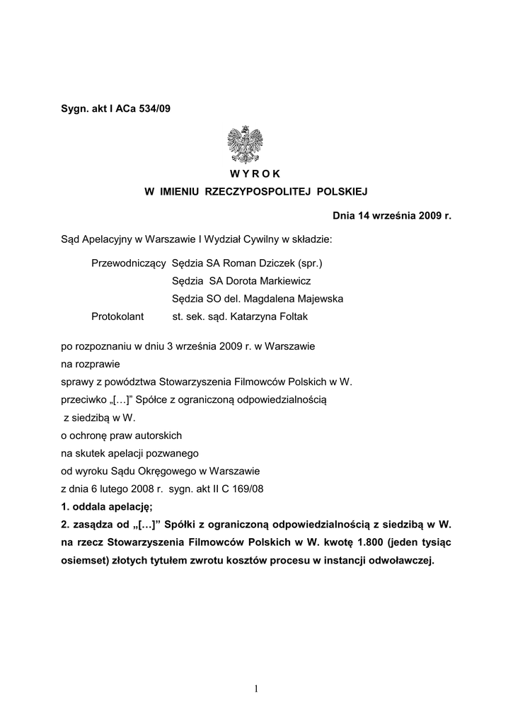 Sygn. akt I ACa 534/09 WYROK W IMIENIU RZECZYPOSPOLITEJ POLSKIEJ Dnia 14 września 2009 r. Sąd Apelacyjny w Warszawie I Wydział Cywilny w składzie: Przewodniczący Sędzia SA Roman Dziczek (spr.) Sędzia SA Dorota Markiewicz Sędzia SO del. Magdalena Majewska Protokolant st. sek. sąd. Katarzyna Foltak po rozpoznaniu w dniu 3 września 2009 r. w Warszawie na rozprawie sprawy z powództwa Stowarzyszenia Filmowców Polskich w W. przeciwko „[…]” Spółce z ograniczoną odpowiedzialnością z siedzibą w W. o ochronę praw autorskich na skutek apelacji pozwanego od wyroku Sądu Okręgowego w Warszawie z dnia 6 lutego 2008 r. sygn. akt II C 169/08 1. oddala apelację; 2. zasądza od „[…]” Spółki z ograniczoną odpowiedzialnością z siedzibą w W. na rzecz Stowarzyszenia Filmowców Polskich w W. kwotę 1.800 (jeden tysiąc osiemset) złotych tytułem zwrotu kosztów procesu w instancji odwoławczej. 1 Sygn. akt I ACa 534/09 UZASADNIENIE Stowarzyszenie Filmowców Polskich wniosło o zasądzenie od […] sp. z o.o. w W. kwoty 51 961 złotych wraz z odsetkami od dnia wniesienia pozwu do dnia zapłaty. W uzasadnieniu powód podniósł, iż do pozwanego należy hotel […], w którym jest 518 pokoi hotelowych wyposażonych w telewizor, za pomocą którego goście mogą odbierać telewizję kablową i satelitarną. Ponadto w innych pomieszczeniach ogólnodostępnych, takich jak bary, restauracje i sale konferencyjne odbywa się odbiór telewizji kablowej i satelitarnej. Udostępniając te pomieszczenia gościom hotelowym oraz innych osobom, które przebywając w pomieszczeniach ogólnodostępnych pozwany nie zawarł umowy licencyjnej na korzystanie z utworów audiowizualnych, wyświetlanych w telewizji. Również z mocy art. 70 ust 2 ustawy z dnia 4 lutego 1994 r. o prawie autorskim i prawach pokrewnych (Dz. U. Nr 90 z 2006 r., poz. 631 ze zmianami, dalej PAU), począwszy od dnia 22 lipca 2000 r. powinien dokonywać płatności tzw. tantiem ustawowych, jako dodatkowego wynagrodzenia należnego współtwórcom utworu audiowizualnego z tytułu publicznego odtwarzania utworu audiowizualnego, ewentualnie z tytułu jego nadawania w telewizji lub poprzez środki publicznego udostępniania utworu. Wynagrodzenie z tego tytułu powód wyliczył jako iloczyn 571 punktów odtwarzania utworów audiowizualnych oraz 91 miesięcy, tj. od dnia […] sierpnia 2000 r. do dnia […] lutego 2008 r. oraz kwoty 1 zł za każde gniazdko antenowe. Pismem z […] maja 2008 r. powód zmienił żądanie, domagając się dodatkowo zakazania […] Spółka z ograniczoną odpowiedzialnością z siedzibą w W. dokonywania publicznego odtwarzania i reemisji w hotelu […] przy […] w W. utworów audiowizualnych nadawanych w programach telewizyjnych do 2 czasu zawarcia ze Stowarzyszeniem Filmowców Polskich umowy licencyjnej na korzystanie z autorskich praw majątkowych, jako działań naruszających prawa autorskie. Uzasadniając rozszerzenie żądania podniósł, iż pozwany dokonując odtwarzania i reemisji utworów audiowizualnych, nadawanych w telewizji bez zgody podmiotu, któremu prawa autorskie służą narusza prawa, które stosownie do art. 79 ust. 1 pkt 1 PAU uprawniają do wystąpienia z żądaniem zaniechania naruszenia, (pismo k. 196 i następne) Pozwany wniósł o oddalenie powództwa i zasądzenie kosztów procesu. Wyrokiem z dnia 6 lutego 2008 roku Sąd Okręgowy w Warszawie zasądził od pozwanego na rzecz powoda kwotę 47.138 złotych wraz z ustawowymi odsetkami liczonymi: a. od kwoty 41.440 złotych od dnia 10 marca 2008 roku do dnia zapłaty, b. od kwoty 5.698 złotych od dnia 5 kwietnia 2008 roku do dnia zapłaty, w pozostałym zakresie powództwo oddalił. Zakazał pozwanemu dokonywania w hotelu […] w […] w W. publicznego odtwarzania i reemisji utworów audiowizualnych nadawanych w programach telewizyjnych, do czasu zawarcia ze Stowarzyszeniem Filmowców Polskich, umowy licencyjnej na korzystanie z autorskich praw majątkowych i orzekł o kosztach procesu. Sąd ten oparł swe rozstrzygnięcie na następujących ustaleniach: […] sp. z o.o. z siedzibą w W. prowadzi hotel o nazwie […], przy […] w W. Obiekt ten dysponuje 518 pokojami hotelowymi (w tym 95 apartamentami). W każdym pokoju hotelowym zainstalowany jest w pełni interaktywny zestaw TV, za pomocą którego goście hotelowi mogą odbierać telewizję kablową i satelitarną, w tym różne programy telewizyjne, nadawane zarówno przez telewizję publiczną jak i polskie i zagraniczne telewizje komercyjne. Także w pomieszczeniach ogólnodostępnych znajdujących się w hotelu, takich jak: pomieszczenie do opieki nad dziećmi, bar ([…]) z ponad 30 telewizorami oraz dwoma olbrzymimi ekranami projekcyjnymi, bar ([…]), bar ([…]), restauracja 3 ([…]), restauracja ([…]), kawiarnia ([…]) odbywa się odbiór telewizji kablowych i satelitarnych. Na terenie hotelu jest również szesnaście sal konferencyjnych, wyposażonych również w gniazdka telewizyjne. Gniazdka telewizyjne, do których dociera sygnał telewizyjny znajdują się także w innych miejscach w budynku hotelu np: na sali balowej czy słupach, które nie są używane i zostały tam zainstalowane w trakcie wymiany instalacji w 1989 r. Znaczna część zawartości programów telewizyjnych stanowią utwory audiowizualne przede wszystkim seriale, filmy fabularne, filmy dokumentalne oraz widowiska. Na odbiornikach telewizyjnych w częściach ogólnodostępnych dla osób z zewnątrz odbierany jest jedynie programy informacyjne typu CNN czy Bloomberg. Tak jest w pomieszczeniach […] i […], które mają po jednym odbiorniku telewizyjnym. W pierwszym z nich został on zainstalowany na wnioski gości w sierpniu 2008 r., zaś w[ …] funkcjonuje od około 3 - 4 lat. W […], zainstalowanych jest 38 odbiorników telewizyjnych, które zostały tam zainstalowane około 10 lat temu i od samego początku odtwarzane są jedynie programy sportowe. Możliwa jest tam także