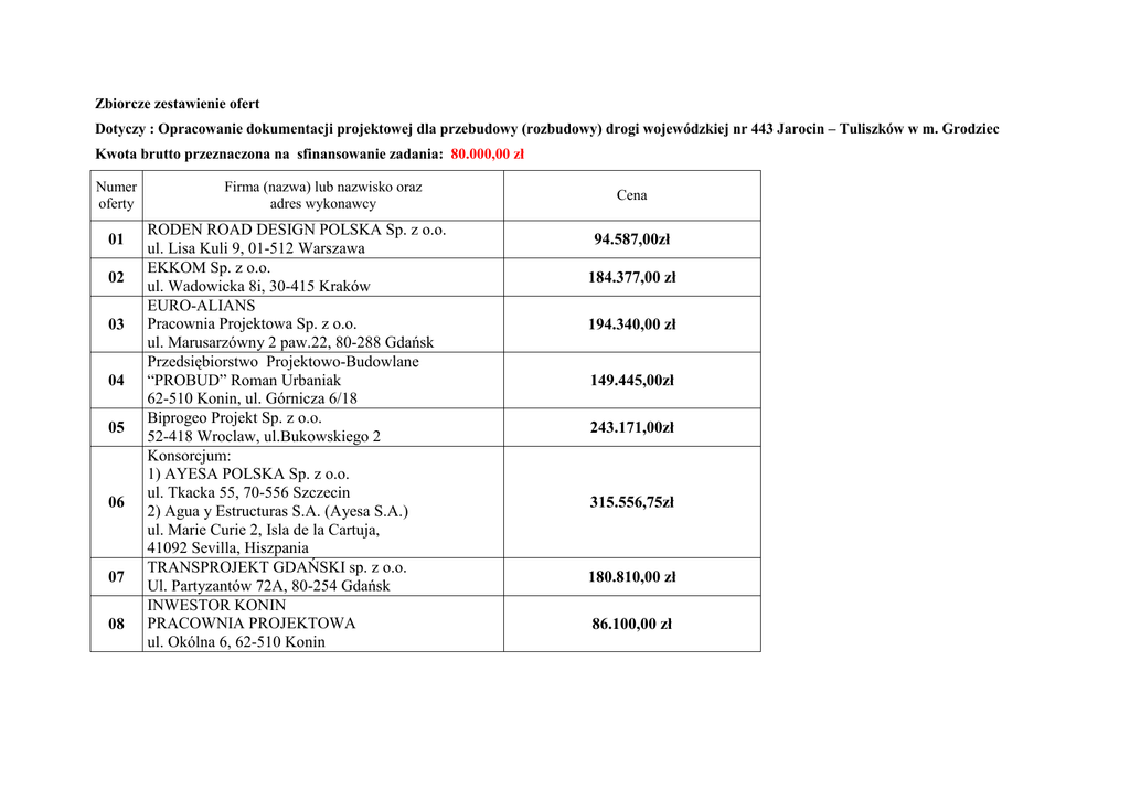 Zbiorcze zestawienie ofert Dotyczy : Opracowanie dokumentacji projektowej dla przebudowy (rozbudowy) drogi wojewódzkiej nr 443 Jarocin – Tuliszków w m. Grodziec Kwota brutto przeznaczona na sfinansowanie zadania: 80.000,00 zł Numer oferty 01 02 03 04 05 06 07 08 Firma (nazwa) lub nazwisko oraz adres wykonawcy RODEN ROAD DESIGN POLSKA Sp. z o.o. ul. Lisa Kuli 9, 01-512 Warszawa EKKOM Sp. z o.o. ul. Wadowicka 8i, 30-415 Kraków EURO-ALIANS Pracownia Projektowa Sp. z o.o. ul. Marusarzówny 2 paw.22, 80-288 Gdańsk Przedsiębiorstwo Projektowo-Budowlane “PROBUD” Roman Urbaniak 62-510 Konin, ul. Górnicza 6/18 Biprogeo Projekt Sp. z o.o. 52-418 Wroclaw, ul.Bukowskiego 2 Konsorcjum: 1) AYESA POLSKA Sp. z o.o. ul. Tkacka 55, 70-556 Szczecin 2) Agua y Estructuras S.A. (Ayesa S.A.) ul. Marie Curie 2, Isla de la Cartuja, 41092 Sevilla, Hiszpania TRANSPROJEKT GDAŃSKI sp. z o.o. Ul. Partyzantów 72A, 80-254 Gdańsk INWESTOR KONIN PRACOWNIA PROJEKTOWA ul. Okólna 6, 62-510 Konin Cena 94.587,00zł 184.377,00 zł 194.340,00 zł 149.445,00zł 243.171,00zł 315.556,75zł 180.810,00 zł 86.100,00 zł 09 10 11 12 13 14 15 Konsorcjum: 1) PROFIL BIS Sp. z o.o. -LIDER 65-463 Zielona Góra, ul. Fabryczna 23 2)”WIR” Zakład Usługowo-Projektowy 59-300 Lubin,ul.Wiśniowa 55 Pracownia Projektowa MOST s.c. Marta Włodarczak, Tomasz Świderski Wargowo 88, 64-605 Wargowo Uniplan Sp. z o.o. ul. Wilczak 13/72 61-623 Poznań Konsorcjum: 1)SUDOP POLSKA Sp. z o.o. -LIDER ul. Świętokrzyska 14, 00-050 Warszawa 2) SUDOP Praha a.s. ul. Olsanska 1a, 130 80 Praha 3 Uzdaroji Akcine Bendrove „ Kelprojektas” Ul.I.Kanto 25 , LT-44296 Kowno, Republika Litewska Konsorcjum: 1) Clothos Sp. z o.o. ul. Twarda 30, 00-831 Warszawa; 2) CLOTHOS S.L. Arda. Fuente de la Mora 2, 28050 Madryt, Hiszpania Biuro Projektów TRASA Sp. z o.o. Ul. Św. Marcin 43 ,61-806 Poznań 233.700,00zł 228.472,50 zł 83.824,50 zł 105.780,00 zł 132.824,01 zł 183.885,00 zł 115.620,00 zł 16 17 18 19 Konsorcjum: 1) Biuro Projektów Budownictwa RBM Palicki – Golec – Wołoszyński sp.j. 60-687 Poznań , os. Stefana Batorego 17/53 –LIDER 2) Biuro InŜynierii Transportu Pracownie Projektowe Cejrowski & Krych sp.j 61-251 Poznań, os. Orła Białego 74/117 „DROMOST” Sp. z o.o. ul. Trójpole 3b, 61-693 Poznań JK Projekt Sp. z o.o. ul. Jasna Rola 56A , 61-609 Poznań Lafrentz – Polska Sp. z o.o. ul. Zbąszyńska 29, 60-359 Poznań 214.020,00 zł 88.560,00zł 146.985,00 zł 122.688,08zł