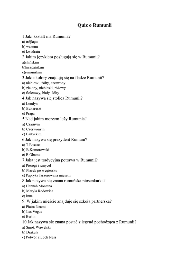 Quiz o Rumunii 1.Jaki kształt ma Rumunia? a) trójkątu b) wazonu c) kwadratu 2.Jakim językiem posługują się w Rumunii? a)chińskim b)hiszpańskim c)rumuńskim 3.Jakie kolory znajdują się na fladze Rumunii? a) niebieski, żółty, czerwony b) zielony, niebieski, różowy c) fioletowy, biały, żółty 4.Jak nazywa się stolica Rumunii? a) Londyn b) Bukareszt c) Praga 5.Nad jakim morzem leży Rumunia? a) Czarnym b) Czerwonym c) Bałtyckim 6.Jak nazywa się prezydent Rumuni? a) T.Basescu b) B.Komorowski c) B.Obama 7.Jaka jest tradycyjna potrawa w Rumunii? a) Pierogi i sznycel b) Placek po węgiersku c) Papryka faszerowana mięsem 8.Jak nazywa się znana rumuńska piosenkarka? a) Hannah Montana b) Maryla Rodowicz c) Inna 9. W jakim mieście znajduje się szkoła partnerska? a) Piatra Neamt b) Las Vegas c) Berlin 10.Jak nazywa się znana postać z legend pochodząca z Rumunii? a) Smok Wawelski b) Drakula c) Potwór z Loch Ness 11.Znana kraina w Rumunii to: a) Transylwania b) Wawel c) Alasan 12.Jak nazywaja się największe pasmo górskie w Rumunii? a) Sudety b) Karpaty c) Alpy 13.Napisz czy dane zdania są prawdziwe czy fałszywe. 1) Rumunia jest małym krajem w Afryce…………………… 2) W Rumunii są ogromne pustynie………………………… 3) W Rumunii są lasy nazywane Bałkanami……………….. 14.Ile kilometrów kwadratowych ma Rumunia? a) 238 391 km² b) 502 722 km² c) 189 642 km² Quiz przygotowali uczniowie z Klubu Comeniusa