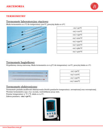 AKCESORIA TERMOMETRY Termometr laboratoryjny rtęciowy Skala termometru co 1°C do temperatury 300°C, powyżej skala co 2°C. -10/+50°C -10/+110°C -10/+150°C -10/+200°C -10/+250°C -10/+300°C -10/+360°C -10/+420°C Termometr bagietkowy Wypełniony cieczą czerwoną. Skala termometru co 0,5°C do temperatury 110°C, powyżej skala co 1°C. -10/+50°C -10/+110°C -10/+150°C -10/+200°C Termometr elektroniczny Termometr posiada możliwość dokonywania dwóch pomiarów temperatury: zewnętrznej oraz wewnętrznej. Wymiar termometru 135 x 75 x 19 mm, wyświetlacza 51x41 mm. Pomiar temperatury w °C i °F, skala co 0,1°C. Zakres pomiaru: -20/+50°C. www.haartim.com.pl AKCESORIA Termometr z sondą Termometr powszechnego zastosowania - do pomiaru cieczy, substancji sypkich, żywności. Długość sondy 127 mm. Wymiar wyświetlacza 18x8mm. Zakres pomiaru: -50/+300°C lub -58/+572°F. Termometr max-min Posiada przycisk do automatycznego resetowania, skala co 1°C. Wymiary 70 x 200 mm. Zakres pomiaru: -30/+50°C. Uchwyt do termometru Wykonany z metalu, przystosowany do montażu na stojaku laboratoryjnym. www.haartim.com.pl