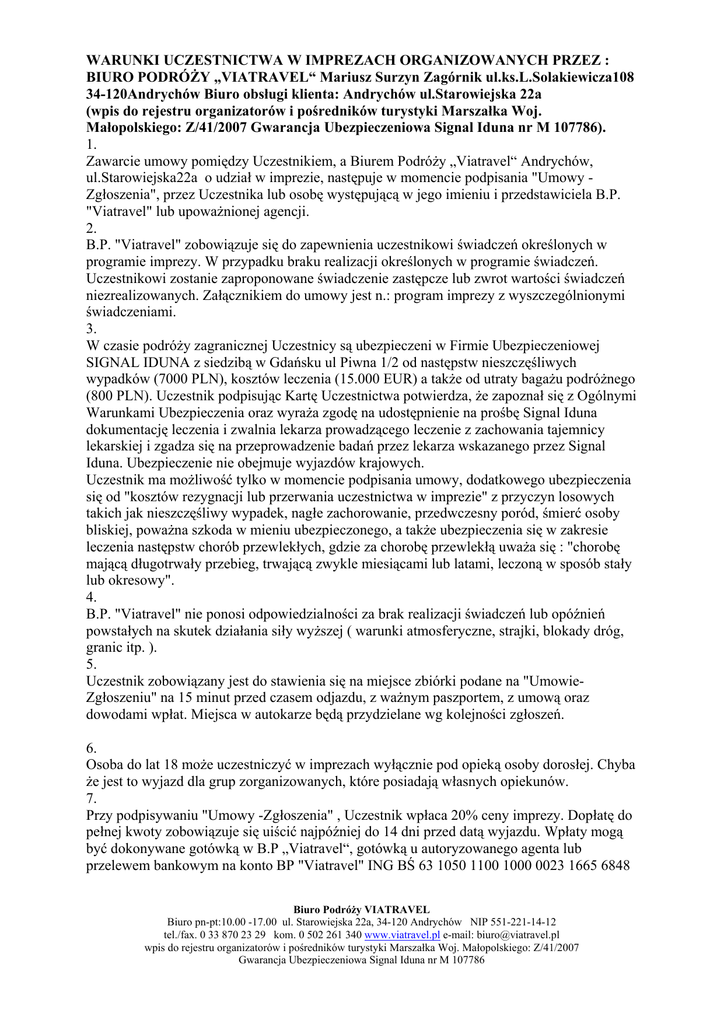 WARUNKI UCZESTNICTWA W IMPREZACH ORGANIZOWANYCH PRZEZ : BIURO PODRÓŻY „VIATRAVEL“ Mariusz Surzyn Zagórnik ul.ks.L.Solakiewicza108 34-120Andrychów Biuro obsługi klienta: Andrychów ul.Starowiejska 22a (wpis do rejestru organizatorów i pośredników turystyki Marszałka Woj. Małopolskiego: Z/41/2007 Gwarancja Ubezpieczeniowa Signal Iduna nr M 107786). 1. Zawarcie umowy pomiędzy Uczestnikiem, a Biurem Podróży „Viatravel“ Andrychów, ul.Starowiejska22a o udział w imprezie, następuje w momencie podpisania "Umowy Zgłoszenia", przez Uczestnika lub osobę występującą w jego imieniu i przedstawiciela B.P. "Viatravel" lub upoważnionej agencji. 2. B.P. "Viatravel" zobowiązuje się do zapewnienia uczestnikowi świadczeń określonych w programie imprezy. W przypadku braku realizacji określonych w programie świadczeń. Uczestnikowi zostanie zaproponowane świadczenie zastępcze lub zwrot wartości świadczeń niezrealizowanych. Załącznikiem do umowy jest n.: program imprezy z wyszczególnionymi świadczeniami. 3. W czasie podróży zagranicznej Uczestnicy są ubezpieczeni w Firmie Ubezpieczeniowej SIGNAL IDUNA z siedzibą w Gdańsku ul Piwna 1/2 od następstw nieszczęśliwych wypadków (7000 PLN), kosztów leczenia (15.000 EUR) a także od utraty bagażu podróżnego (800 PLN). Uczestnik podpisując Kartę Uczestnictwa potwierdza, że zapoznał się z Ogólnymi Warunkami Ubezpieczenia oraz wyraża zgodę na udostępnienie na prośbę Signal Iduna dokumentację leczenia i zwalnia lekarza prowadzącego leczenie z zachowania tajemnicy lekarskiej i zgadza się na przeprowadzenie badań przez lekarza wskazanego przez Signal Iduna. Ubezpieczenie nie obejmuje wyjazdów krajowych. Uczestnik ma możliwość tylko w momencie podpisania umowy, dodatkowego ubezpieczenia się od "kosztów rezygnacji lub przerwania uczestnictwa w imprezie" z przyczyn losowych takich jak nieszczęśliwy wypadek, nagłe zachorowanie, przedwczesny poród, śmierć osoby bliskiej, poważna szkoda w mieniu ubezpieczonego, a także ubezpieczenia się w zakresie leczenia następstw chorób przewlekłych, gdzie za chorobę przewlekłą uważa się : "chorobę mającą długotrwały przebieg, trwającą zwykle miesiącami lub latami, leczoną w sposób stały lub okresowy". 4. B.P. "Viatravel" nie ponosi odpowiedzialności za brak realizacji świadczeń lub opóźnień powstałych na skutek działania siły wyższej ( warunki atmosferyczne, strajki, blokady dróg, granic itp. ). 5. Uczestnik zobowiązany jest do stawienia się na miejsce zbiórki podane na "UmowieZgłoszeniu" na 15 minut przed czasem odjazdu, z ważnym paszportem, z umową oraz dowodami wpłat. Miejsca w autokarze będą przydzielane wg kolejności zgłoszeń. 6. Osoba do lat 18 może uczestniczyć w imprezach wyłącznie pod opieką osoby dorosłej. Chyba że jest to wyjazd dla grup zorganizowanych, które posiadają własnych opiekunów. 7. Przy podpisywaniu "Umowy -Zgłoszenia" , Uczestnik wpłaca 20% ceny imprezy. Dopłatę do pełnej kwoty zobowiązuje się uiścić najpóźniej do 14 dni przed datą wyjazdu. Wpłaty mogą być dokonywane gotówką w B.P „Viatravel“, gotówką u autoryzowanego agenta lub przelewem bankowym na konto BP "Viatravel" ING BŚ 63 1050 1100 1000 0023 1665 6848 Biuro Podróży VIATRAVEL Biuro pn-pt:10.00 -17.00 ul. Starowiejska 22a, 34-120 Andrychów NIP 551-221-14-12 tel./fax. 0 33 870 23 29 kom. 0 502 261 340 www.viatravel.pl e-mail: [email protected] wpis do rejestru organizatorów i pośredników turystyki Marszałka Woj. Małopolskiego: Z/41/2007 Gwarancja Ubezpieczeniowa Signal Iduna nr M 107786 8.Cena imprezy w PLN obliczana jest według kursu EURO z dnia ostatniej wpłaty. W przypadku odwołania imprezy B.P. "Viatravel" zobowiązuje się do natychmiastowego powiadomienia Uczestnika o tym fakcie na piśmie i zaproponowania mu świadczenia zastępczego. W przypadku otrzymania takiego zawiadomienia, Uczestnik jest zobowiązany w terminie do trzech dni powiadomić B.P. "Viatravel" o przyjęciu świadczenia zastępczego lub rezygnacji. Odwołanie imprezy z powodu nie zebrania wymaganego minimum 25 uczestników może nastąpić najpóźniej 3 dni przed dniem planowanego wyjazdu.W tym przypadku Uczestnikowi przysługuje pełny zwrot kosztów bez odszkodowania. 9. W przypadkach szczególnych ( zmiana kursów walut, wzrost opłat urzędowych, podatków) B.P. "Viatravel" ma prawo do zmiany ceny, terminu lub programu imprezy, jednak nie później niż 20 dni przed datą rozpoczęcia imprezy oraz zobowiązuje się niezwłocznie powiadomić o tym Uczestnika. Uczestnik po otrzymaniu informacji o zmianie warunków, zobowiązany w terminie do trzech dni powiadomić B.P. "Viatravel" o przyjęciu lub odrzuceniu nowych warunków. 10. Uczestnik ma prawo do zabrania jednego bagażu do 25 kg oraz bagażu podręcznego do 5 kg. 11. Uczestnik imprezy odpowiada za szkody wyrządzone z winy własnej lub osób, nad którymi sprawuje opiekę. Straty powstałe z tego tytułu Uczestnik zobowiązany jest pokryć na miejscu wyrządzenia szkody. 12. W trakcie trwania imprezy, Uczestnik jest zobowiązany do przestrzegania poleceń pilota, a szczególnie dotrzymywać terminów zbiórek oraz każdorazowo informować pilota o zamiarze oddalenia się od grupy. 13. Rezygnacja z imprezy nastąpi w momencie złożenia przez Uczestnika rezygnacji w formie pisemnej. 14. W przypadku rezygnacji przez Uczestnika z udziału w imprezie B.P. "Viatravel" potrąca z wpłat Uczestnika poniesione koszty związane z umową, które orientacyjnie wynoszą: 10% ceny imprezy w razie rezygnacji z udziału, w terminie powyżej 30 dni przed rozpoczęciem imprezy, 25% ceny imprezy w razie rezygnacji pomiędzy 15-30 dni przed rozpoczęciem imprezy, 50% ceny imprezy w razie rezygnacji pomiędzy 7-14 dni przed rozpoczęciem imprezy, 60% ceny imprezy w razie rezygnacji pomiędzy 3-6 dni przed rozpoczęciem imprezy, 80% ceny imprezy w razie rezygnacji w terminie poni